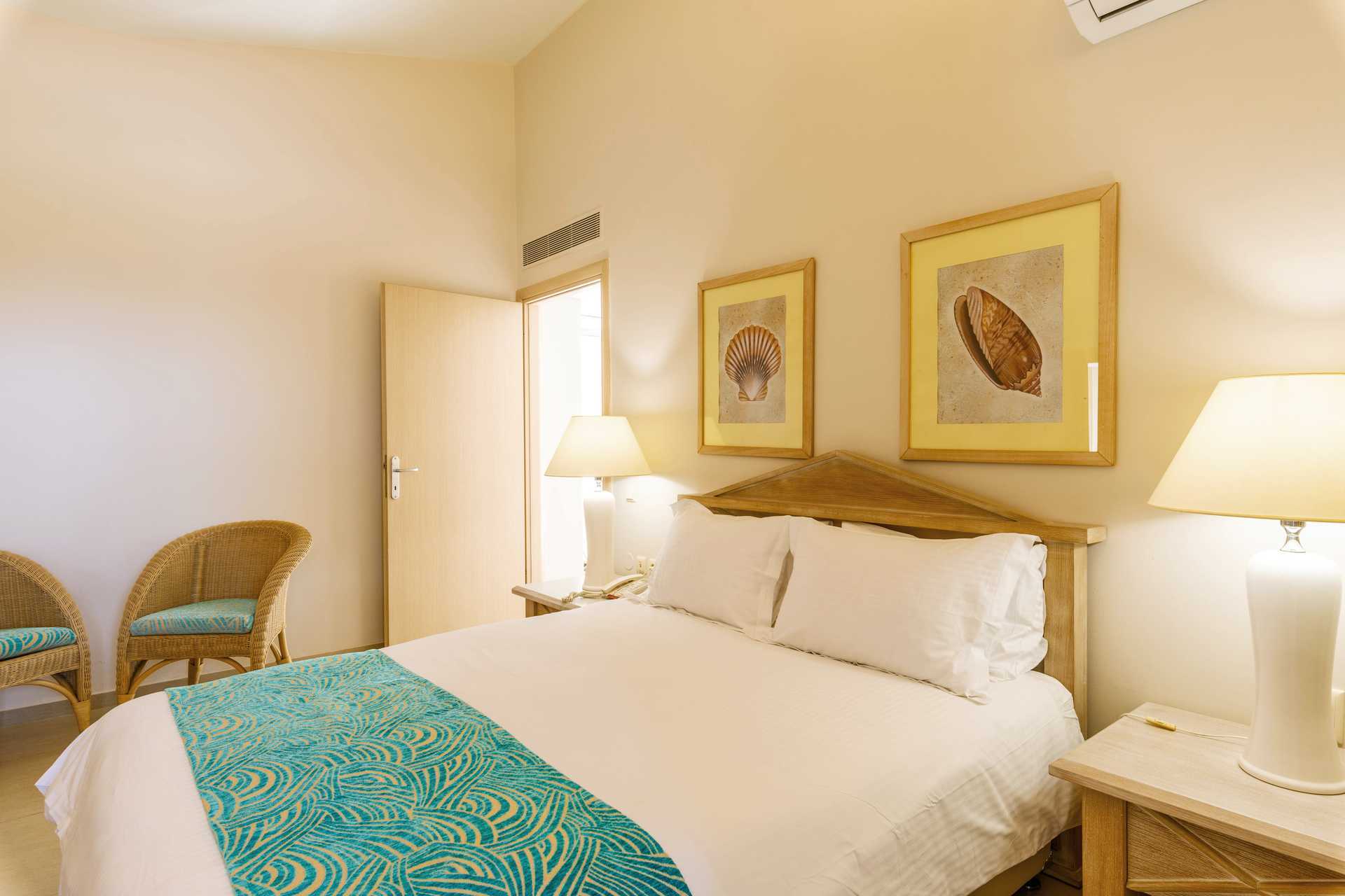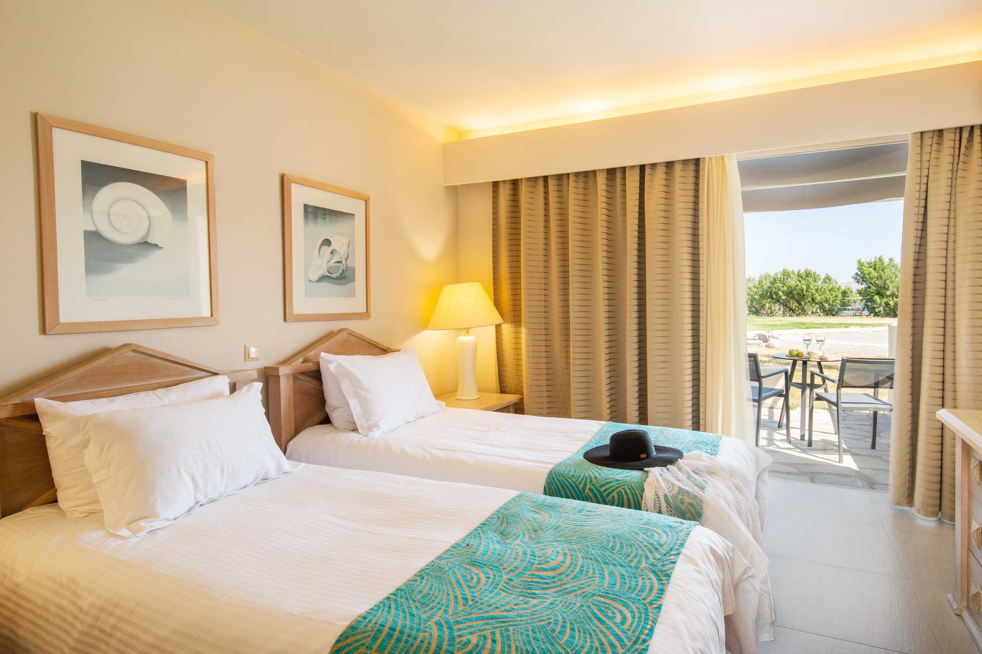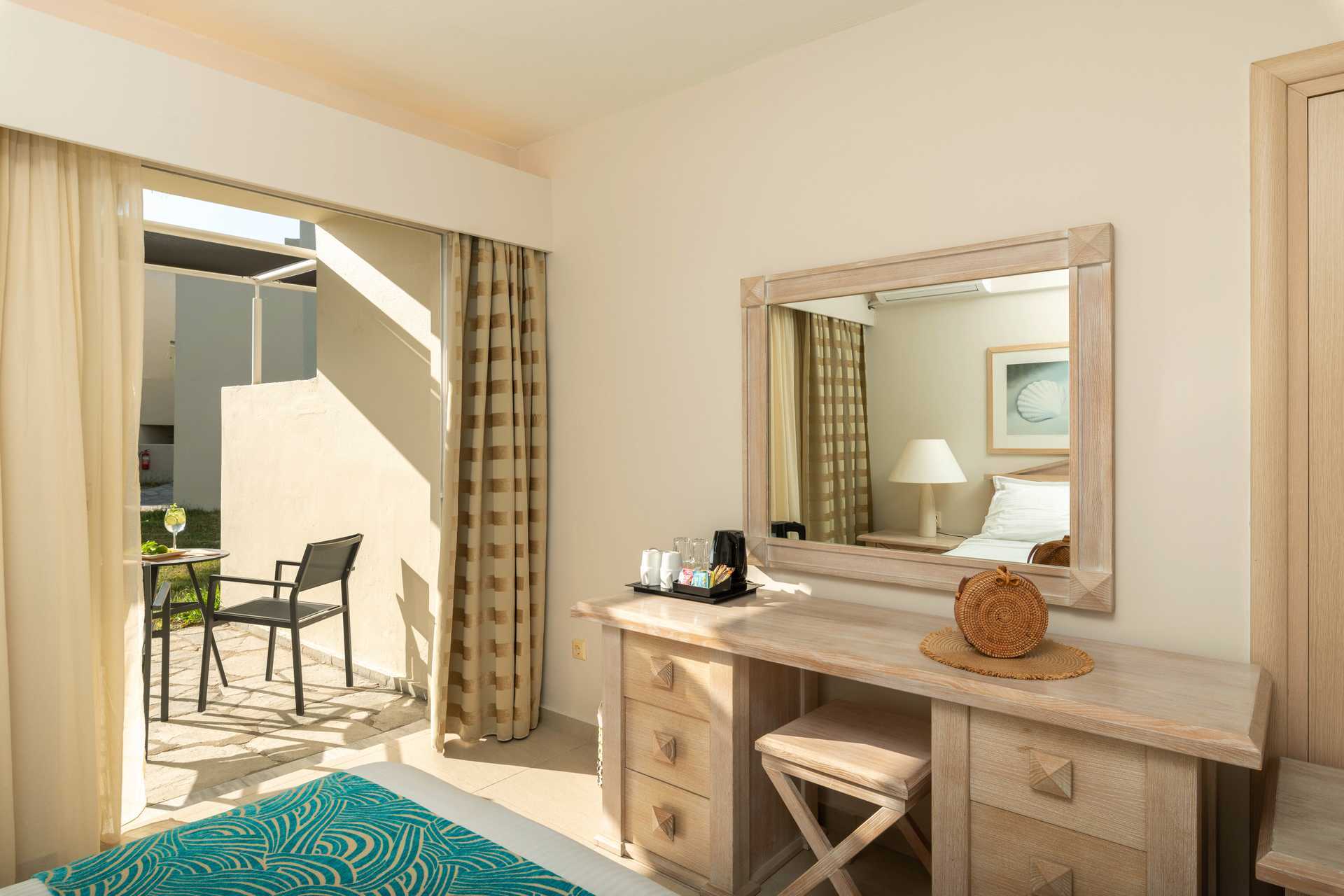 Familjerum, garden wing med markterrass, vissa med havsutsikt eller begränsad havsutsikt. Familjerummet består av två dubbelrum, garden wing med förbindelsedörr. Familjerummet är belägna i mindre byggnader, närmre havet än rummen i huvudbyggnaden. Två enkelsängar i varje rum. Möjlighet till extrabädd i hopfällbar säng. Wifi, luftkonditionering och deponering ingår. Kylskåp. Vattenkokare samt kaffe och te. Tv med internationella kanaler. Hårtork. Badrum med badkar eller dusch samt wc. Städning 7 ggr/vecka.