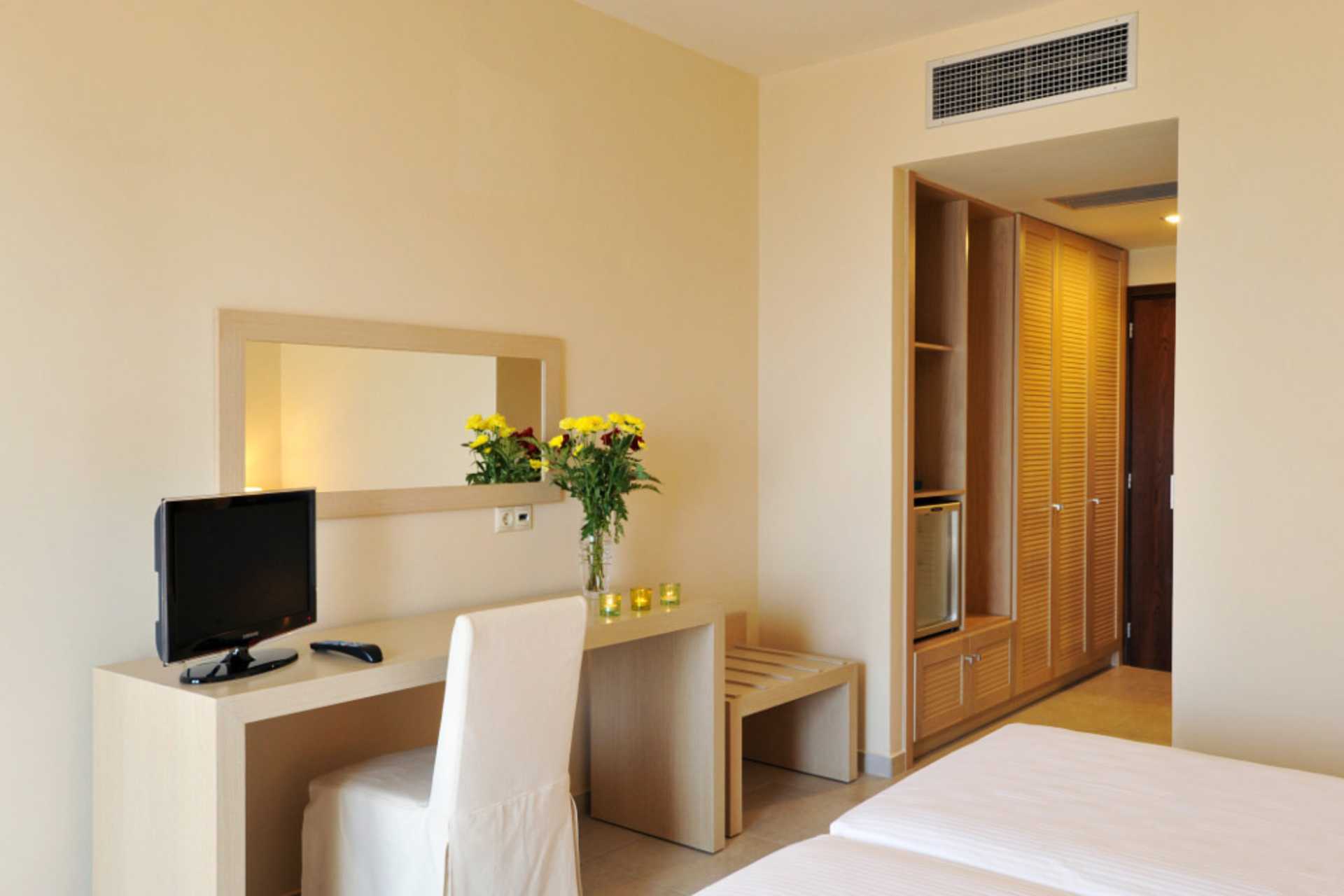 Dubbelrum med balkong eller med balkong eller terrass. En dubbelsäng eller två enkelsängar. Wifi, luftkonditionering och deponering ingår. Kylskåp - en flaska vatten ingår vid ankomst. Vattenkokare samt kaffe och te. Wifi, luftkonditionering och deponering ingår. Tv med internationella kanaler. Hårtork. Badrum med bad/dusch och wc. Städning 7 ggr/vecka.