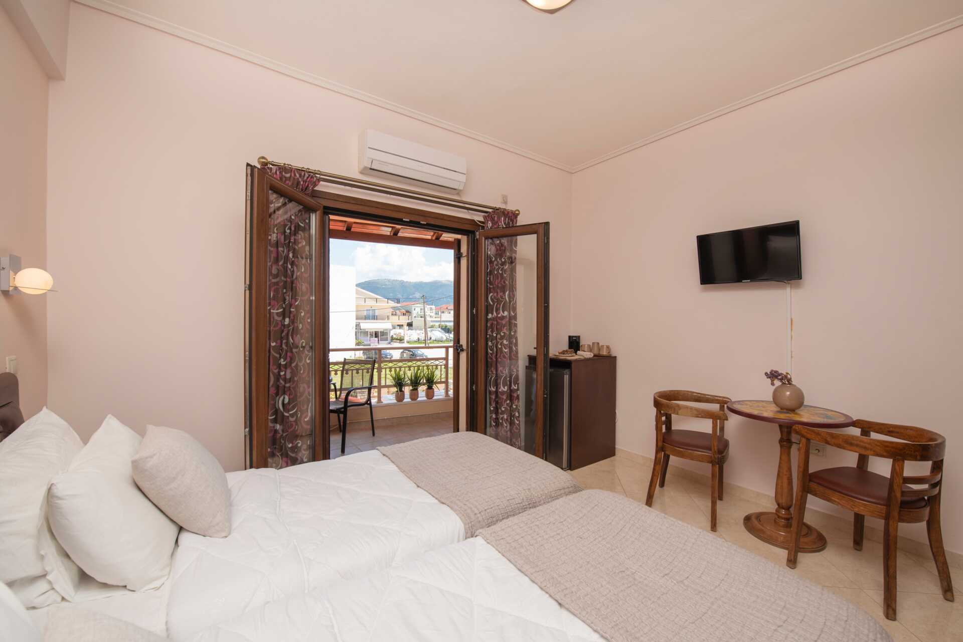 Dubbelrum med balkong, vissa med havsutsikt. En dubbelsäng eller två enkelsängar. Möjlighet till extrabädd i hopfällbar säng. Wifi, luftkonditionering och deponering ingår. Kylskåp. Kaffemaskin, två kapsar per dag ingår. Tv med internationella kanaler. Badrockar. Hårtork. Badrum med dusch och wc. Städning 6 ggr/vecka. Barn under två år räknas in i maxantalet personer i rummet.