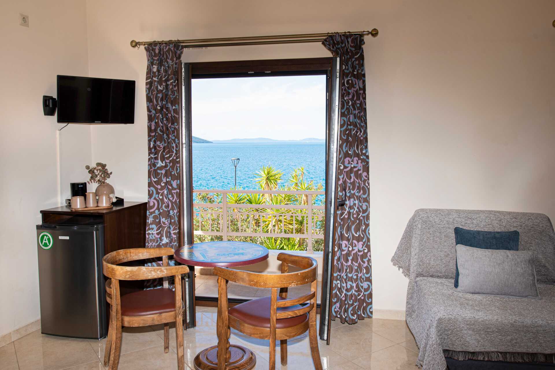 Enrumslägenhet med balkong och begränsad havsutsikt. Sovrum med minikök. En dubbelsäng eller två enkelsängar. Möjlighet till extrabädd i bäddsoffa. Minikök med kokplattor och ugn, kylskåp med frys, vattenkokare, kaffebryggare och enkel köksutrustning. Kaffemaskin - två kapslar per dag ingår. Wifi, luftkonditionering och deponering ingår. Tv med internationella kanaler. Badrockar. Badrum med dusch och wc. Städning 6 ggr/vecka. Barn under två år räknas in i maxantalet personer i lägenheten.