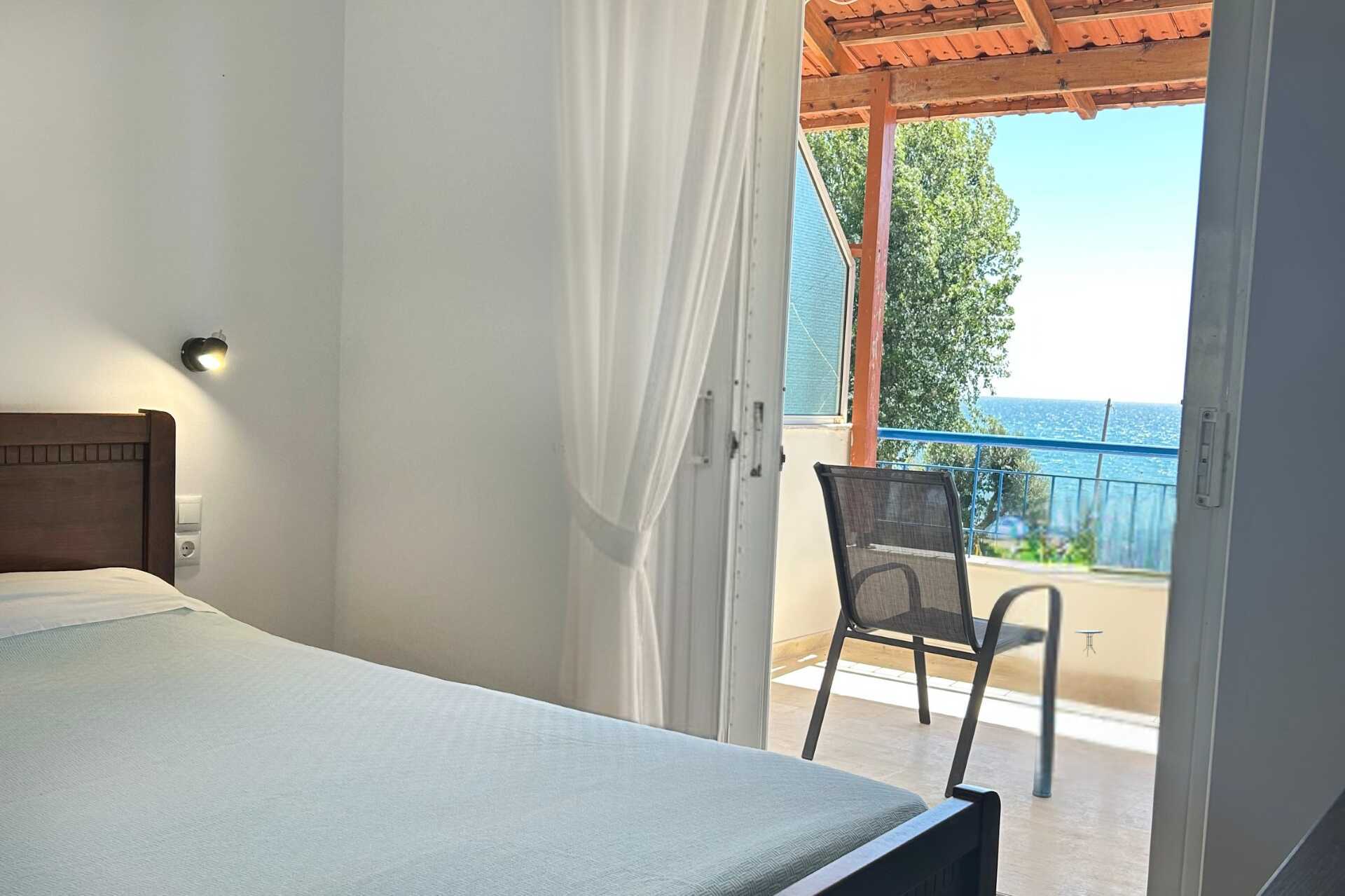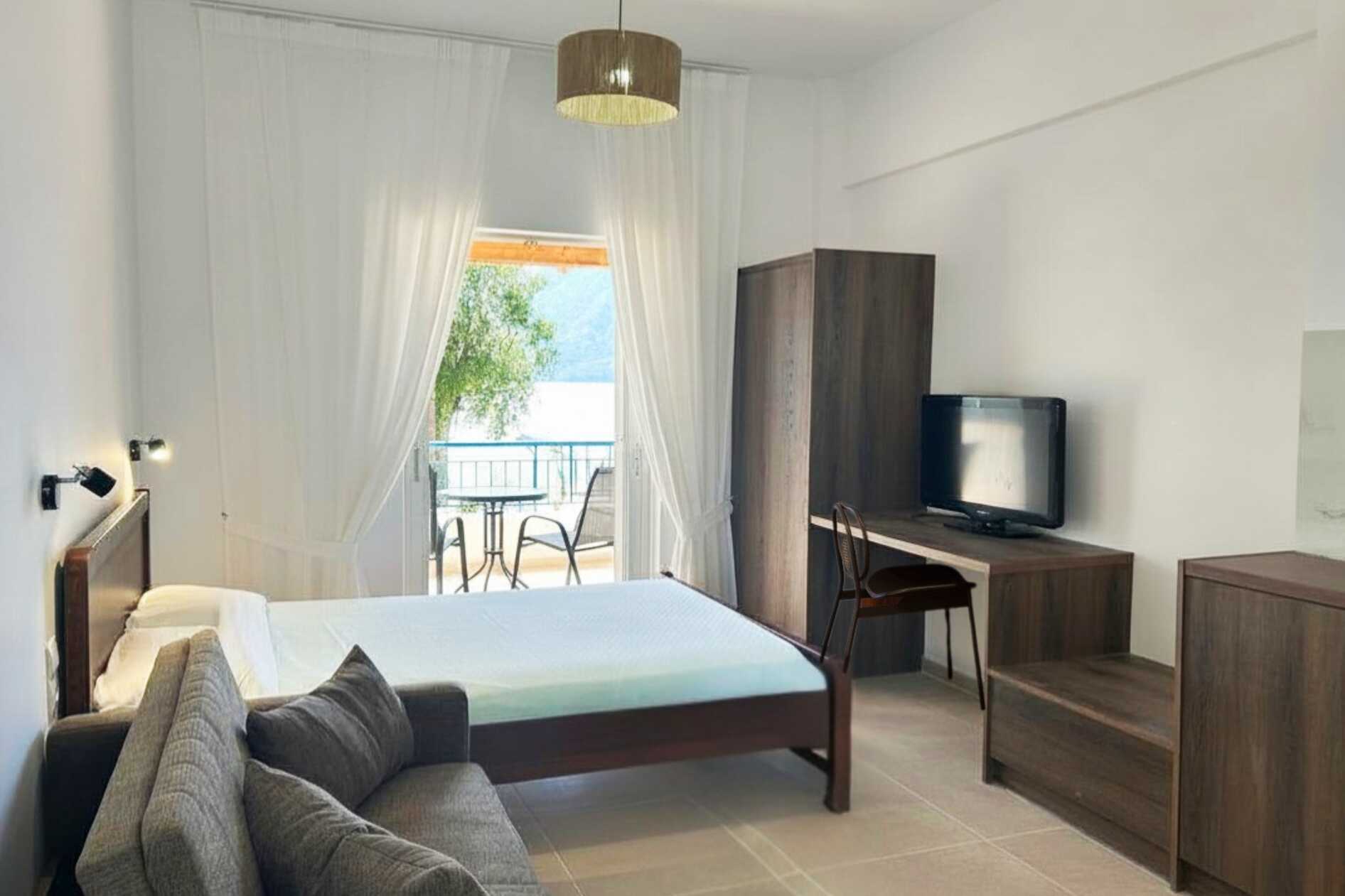 Enrumslägenhet med balkong och havsutsikt. Sovrum kombinerat med minikök. En dubbelsäng. Minikök med kylskåp, kokplattor och enkel köksutrustning. Wifi och luftkonditionering ingår. Tv med lokala kanaler. Badrum med dusch och wc. Städning 5 ggr/vecka.