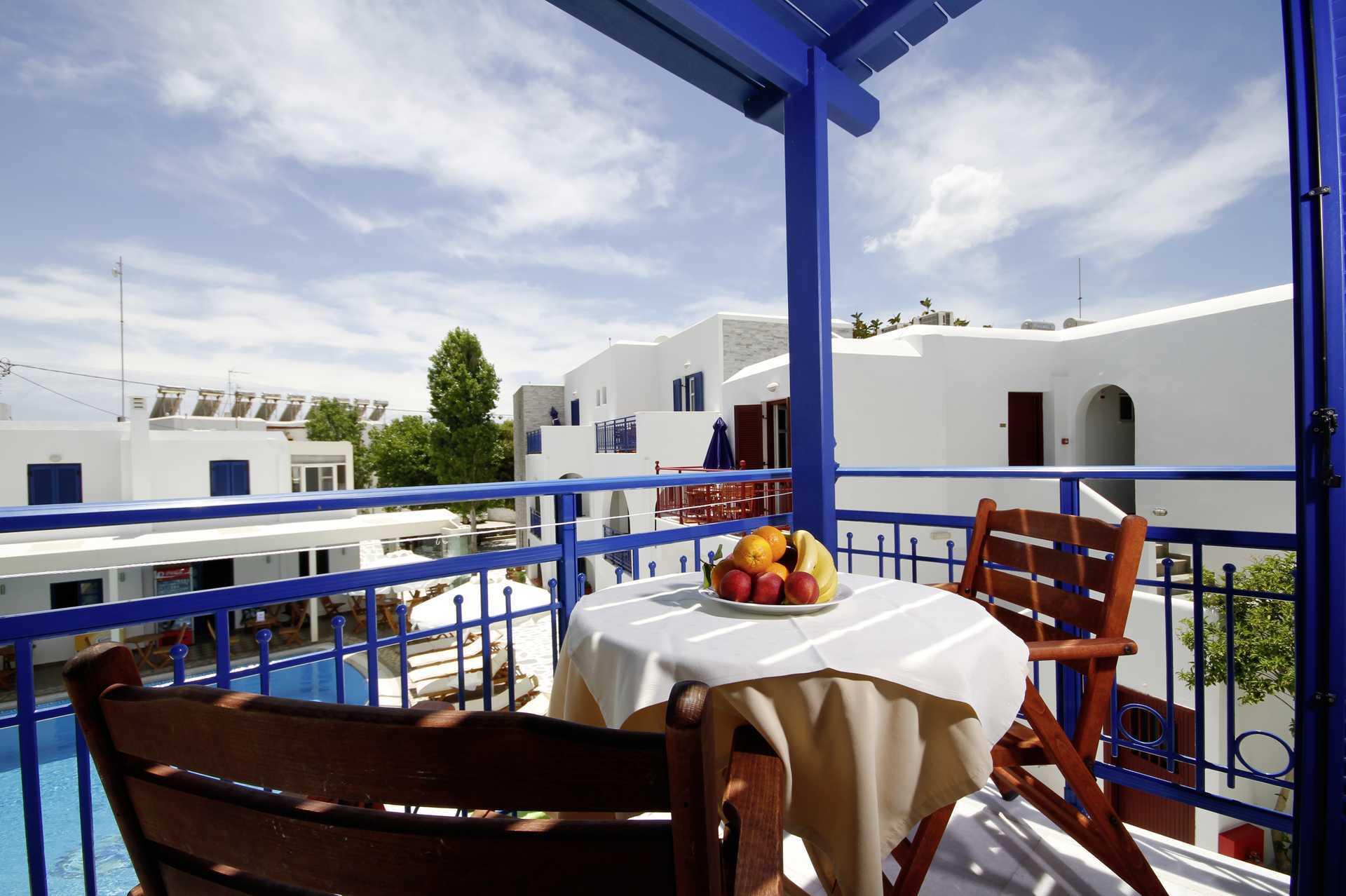 Enrumslägenhet med balkong, markbalkong eller markterrass i varierande storlek. Kombinerat sovrum med minikök. En dubbelsäng eller två enkelsängar. Möjlighet till extrabädd i enkelsäng. Minikök med kokplattor, kylskåp och enkel köksutrustning. Luftkonditionering ingår. Deponering mot avgift. Tv med internationella kanaler. Hårtork. Badrum med dusch och wc. Städning 6 ggr/vecka. Barn under två år räknas in i maxantalet personer i lägenheten.