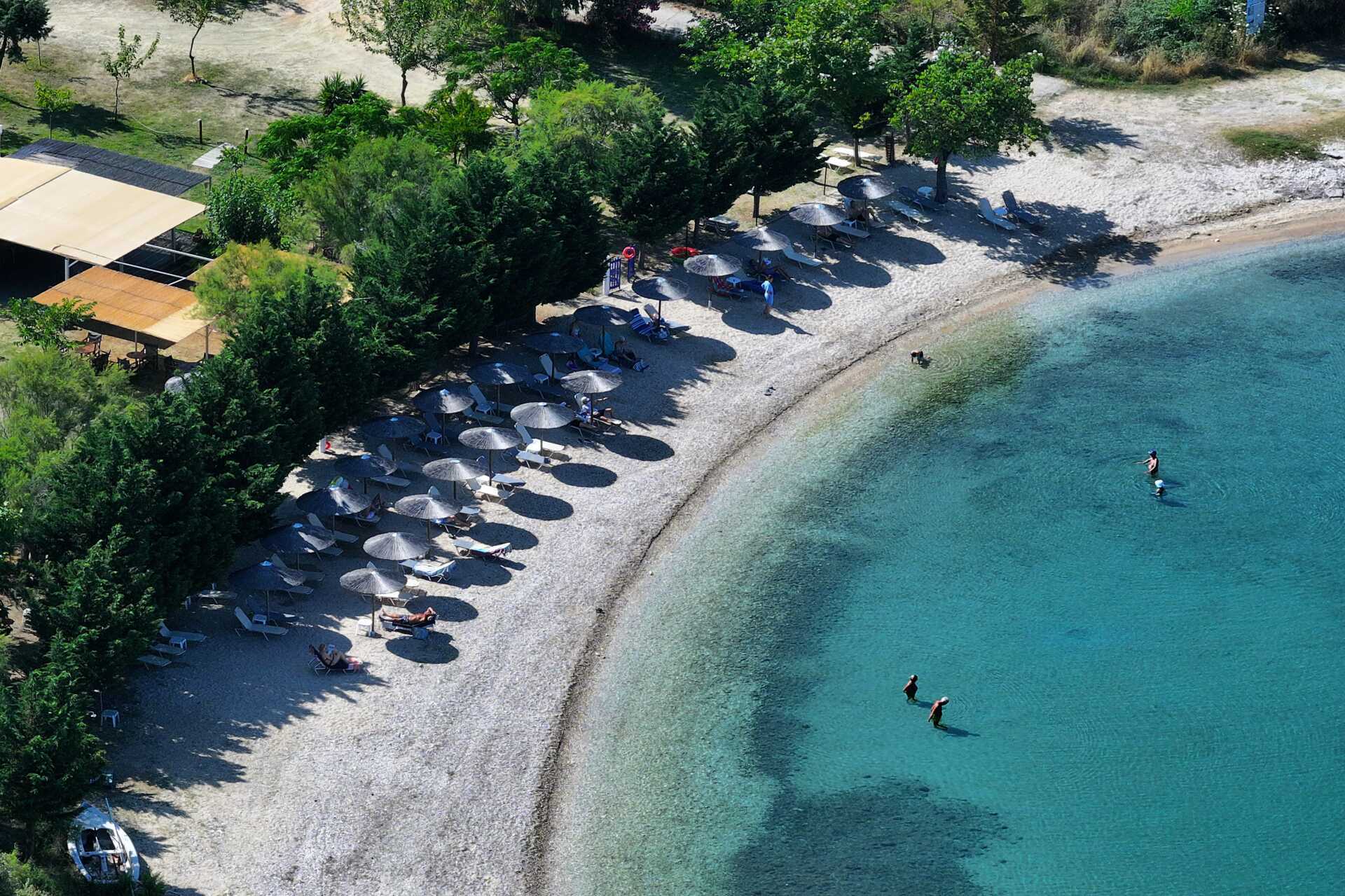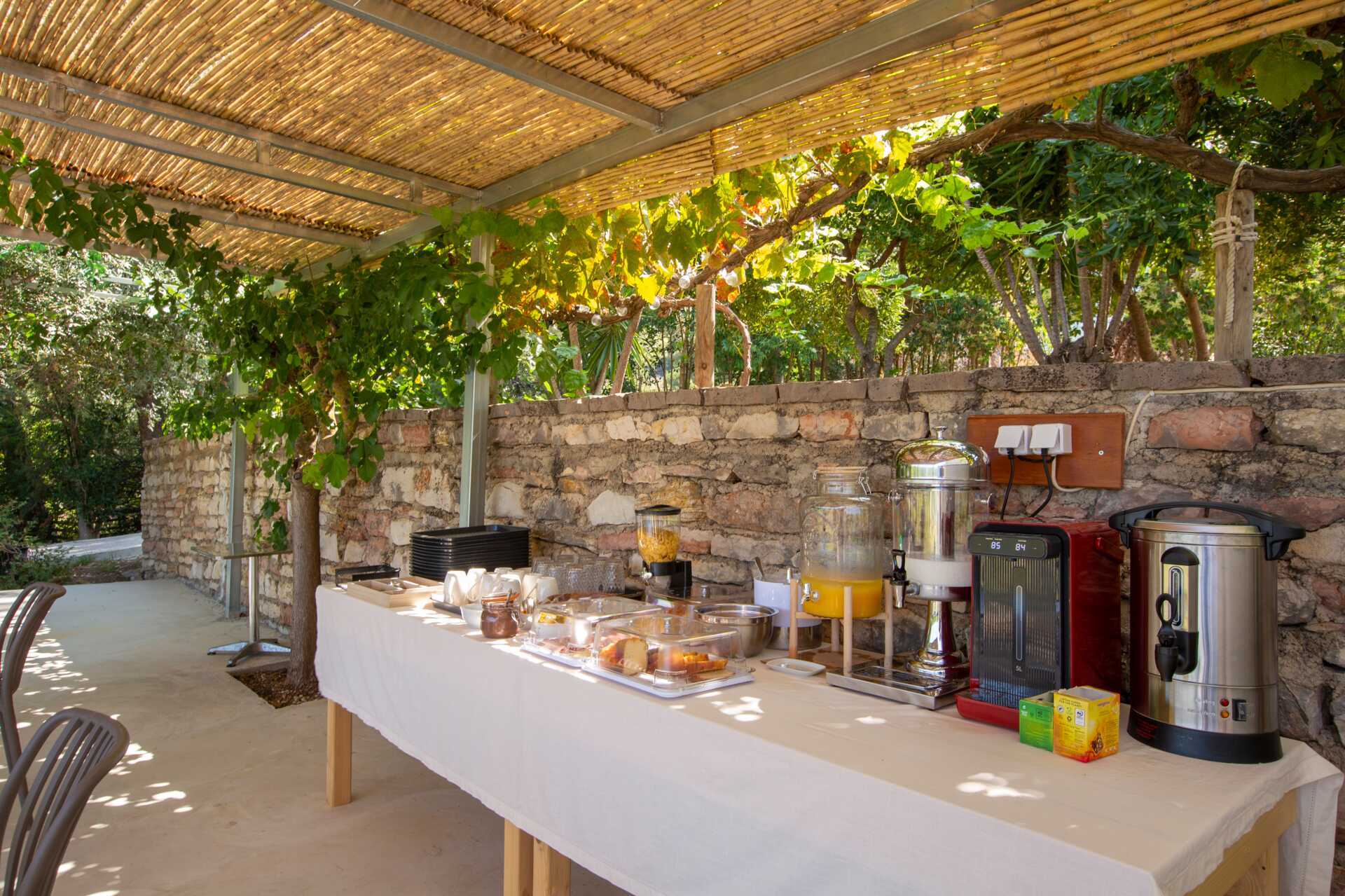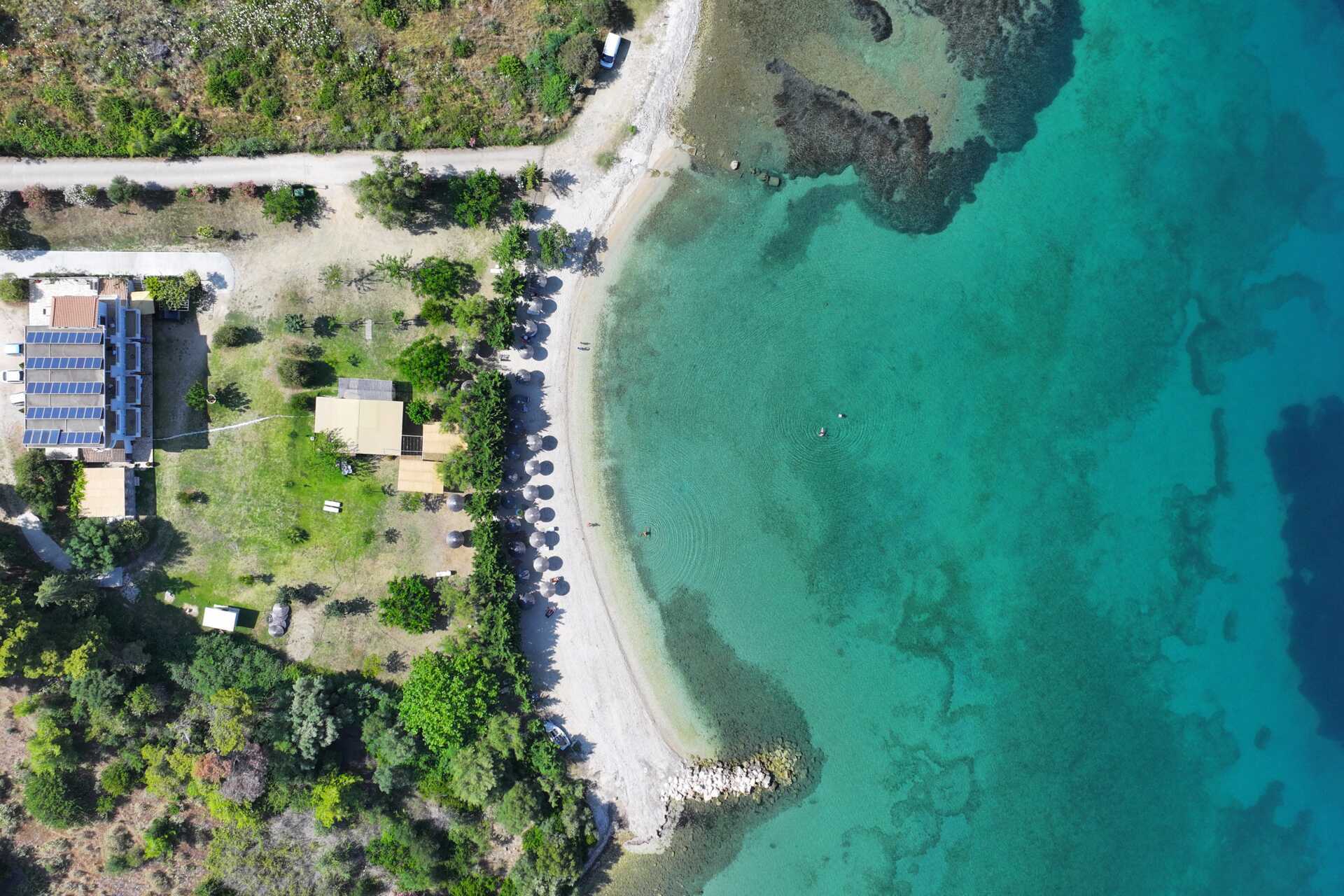 Ner mot stranden, där solstolar finns att låna, ligger den gemytliga strandbaren där frukosten serveras, och senare under dagen och en bit in på kvällen kan du inhandla drycker och enklare måltider där. Strandbaren fungerar också som reception dagtid.