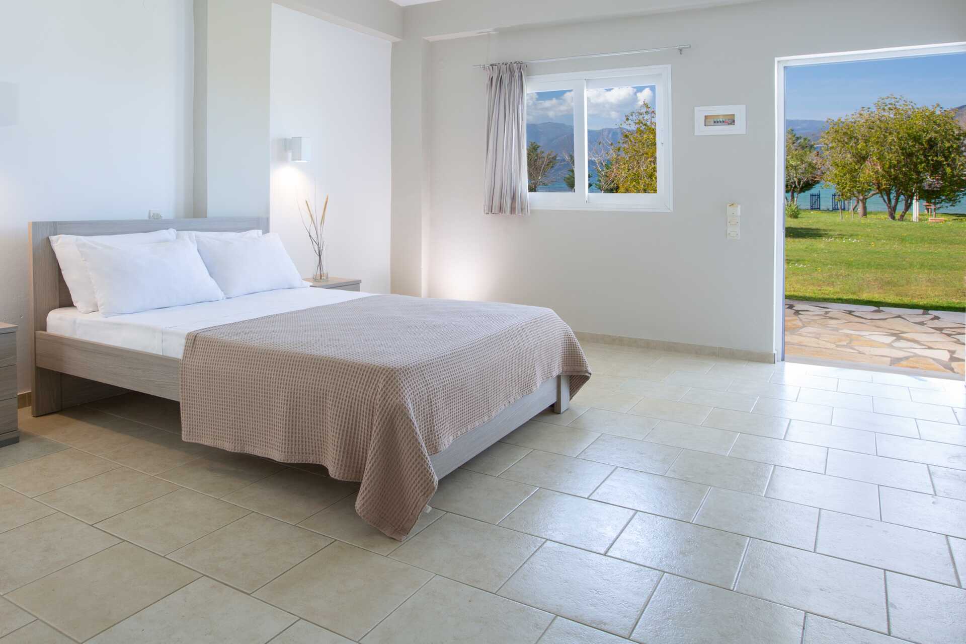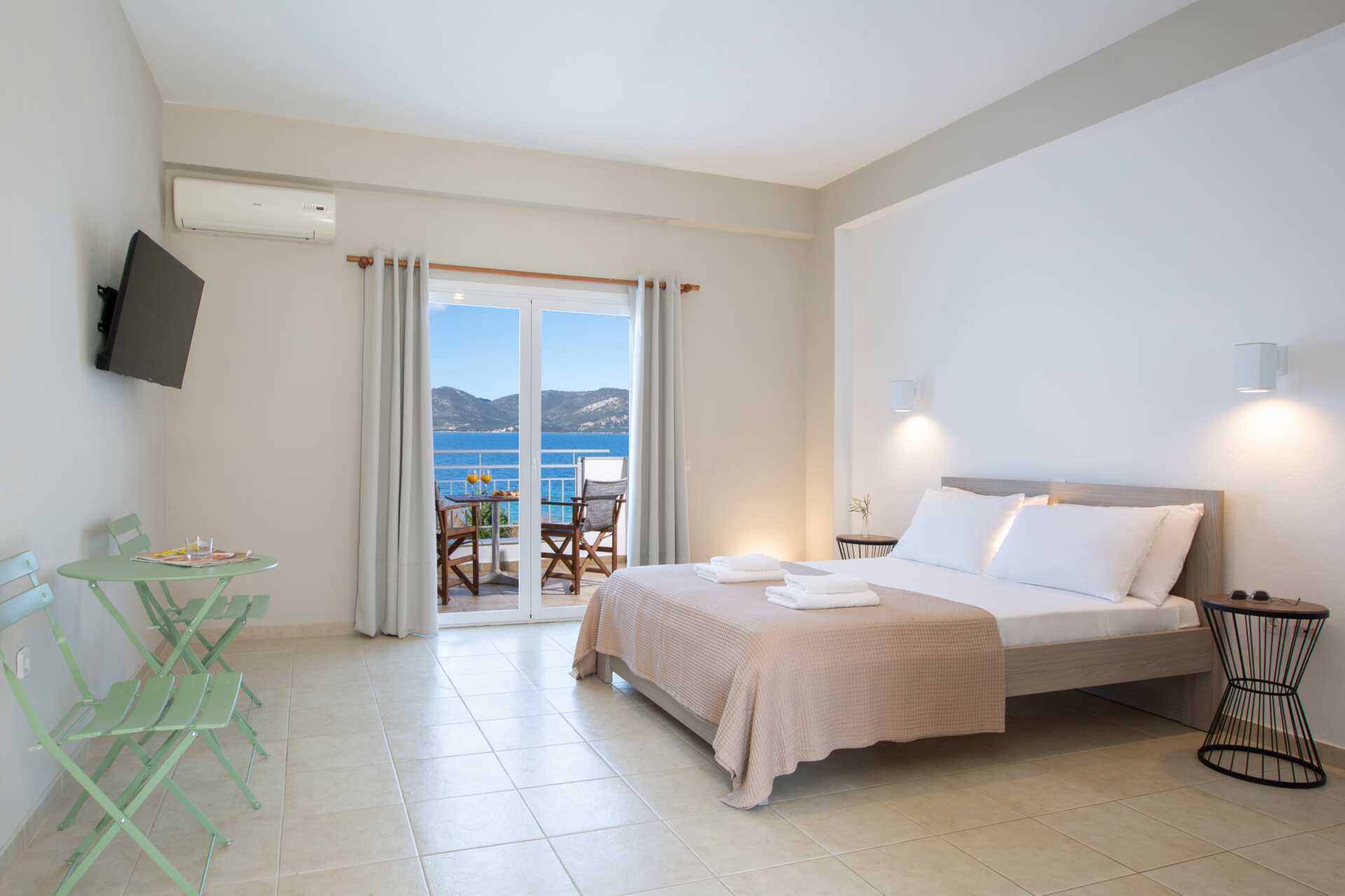 Dubbelrum med markterrass och begränsad havsutsikt eller med balkong och havsutsikt. En dubbelsäng. Möjlighet till extrabädd i enkelsäng. Wifi, luftkonditionering och deponering ingår. Litet kylskåp. Vattenkokare samt kaffe och te. Tv med internationella kanaler. Badrum med dusch och wc. Städning 6 ggr/vecka.