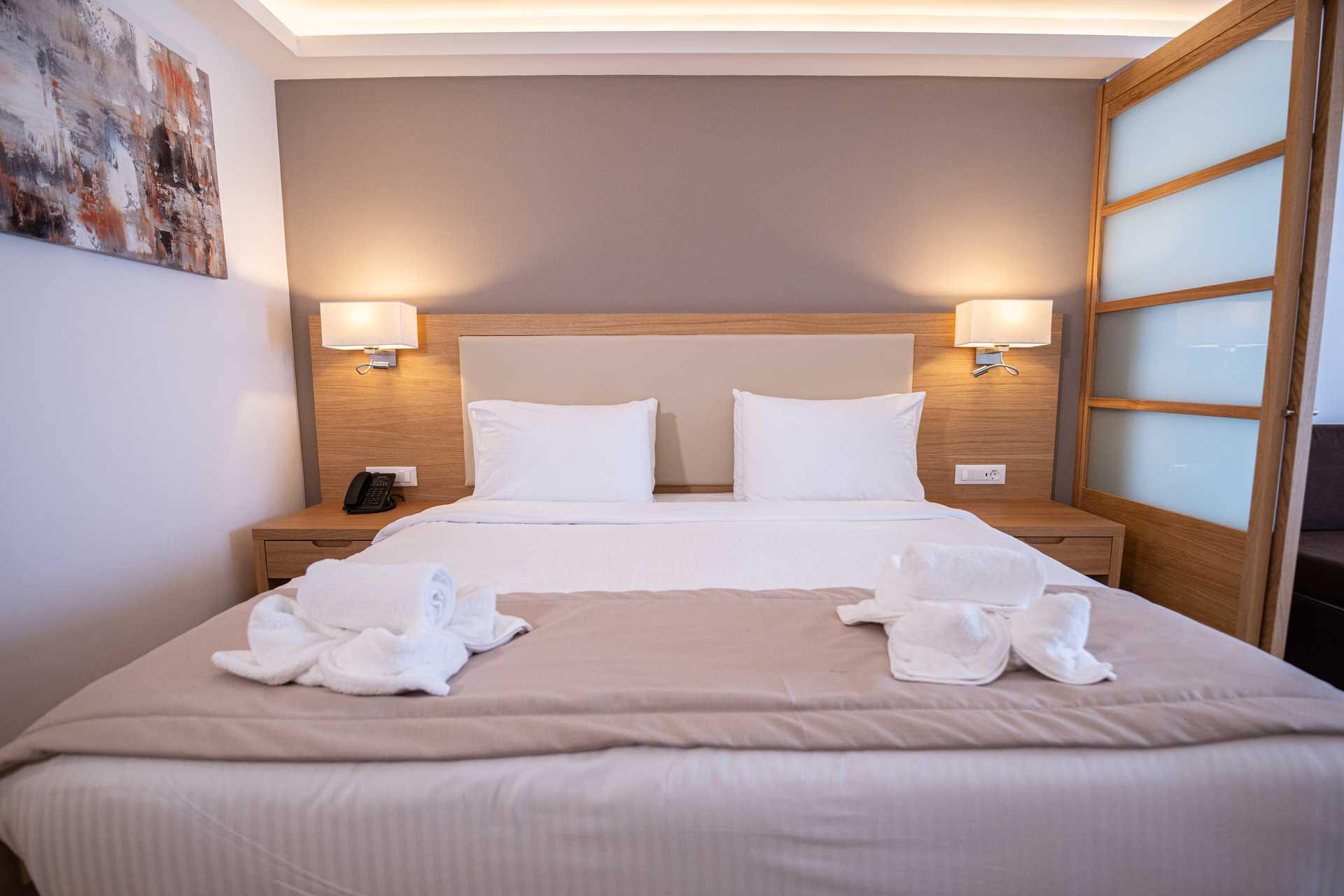 Familjerum med balkong eller markterrass. Rummet består av en sovrumsdel och en vardagsrumsdel som skiljs åt av en skjutdörr. En dubbelsäng. Möjlighet till extrabäddar i två bäddsoffor. Wifi, luftkonditionering och deponering ingår. Minibar. Vattenkokare. Tv med internationella kanaler. Hårtork. Badrum med badkar eller dusch samt wc. Städning 7 ggr/vecka.