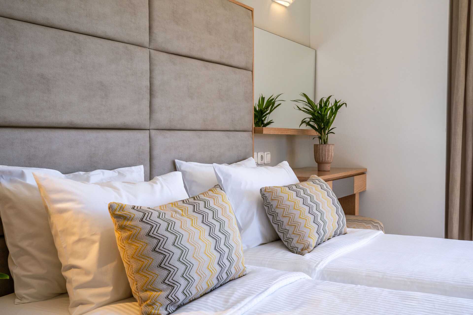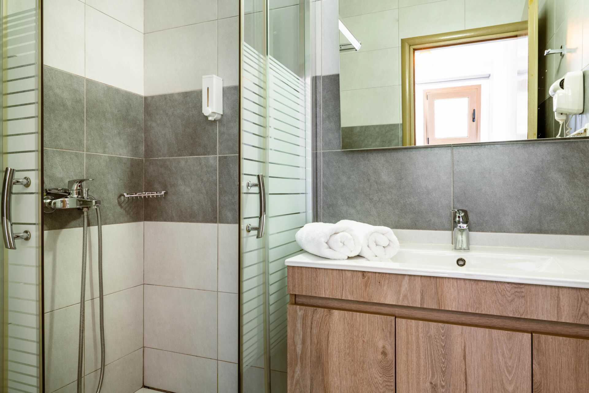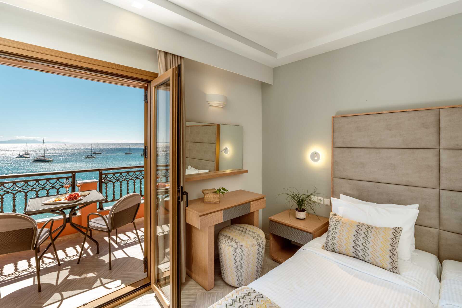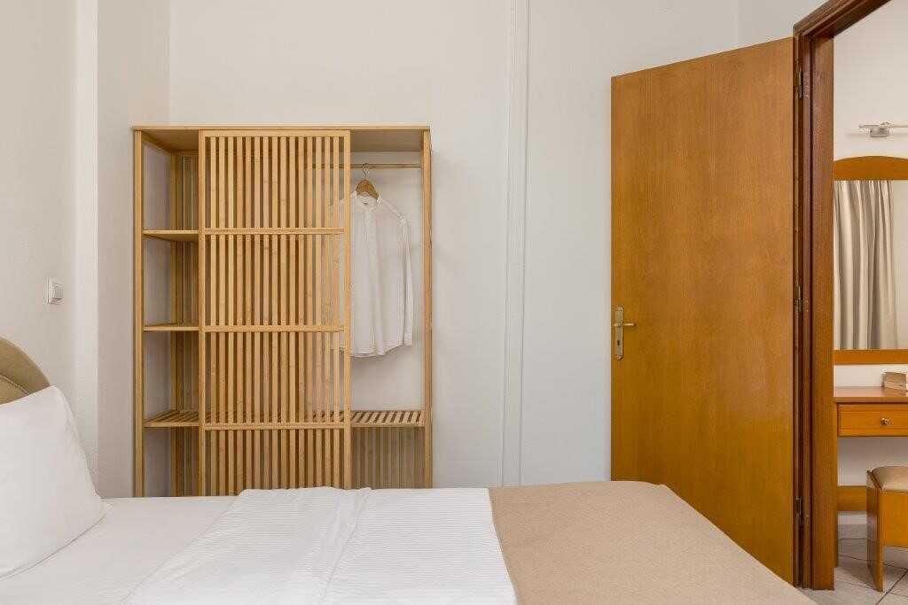 Enrumslägenhet med balkong och havsutsikt. Varierande storlek och med modern inredning. Sovrum med kombinerat minikök. Två enkelsängar. Möjlighet till extrabäddar i bäddsoffa. Minikök med kokplattor, kylskåp, kaffebryggare, vattenkokare, brödrost, mikrovågsugn och enkel köksutrustning. Wifi och luftkonditionering ingår. Deponering mot avgift. Tv med internationella kanaler. Hårtork. Badrum med dusch och wc. Städning 6 ggr/vecka.