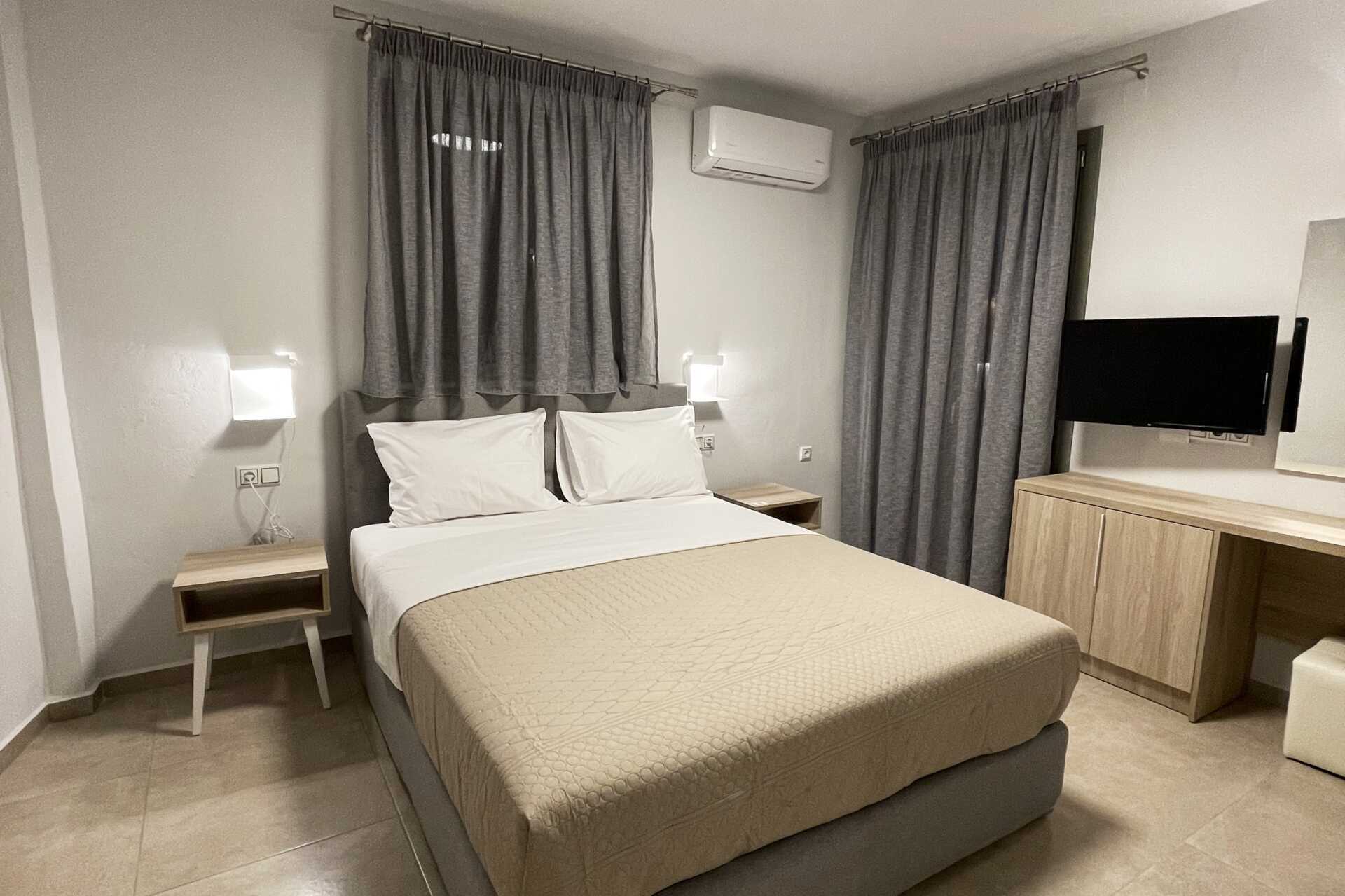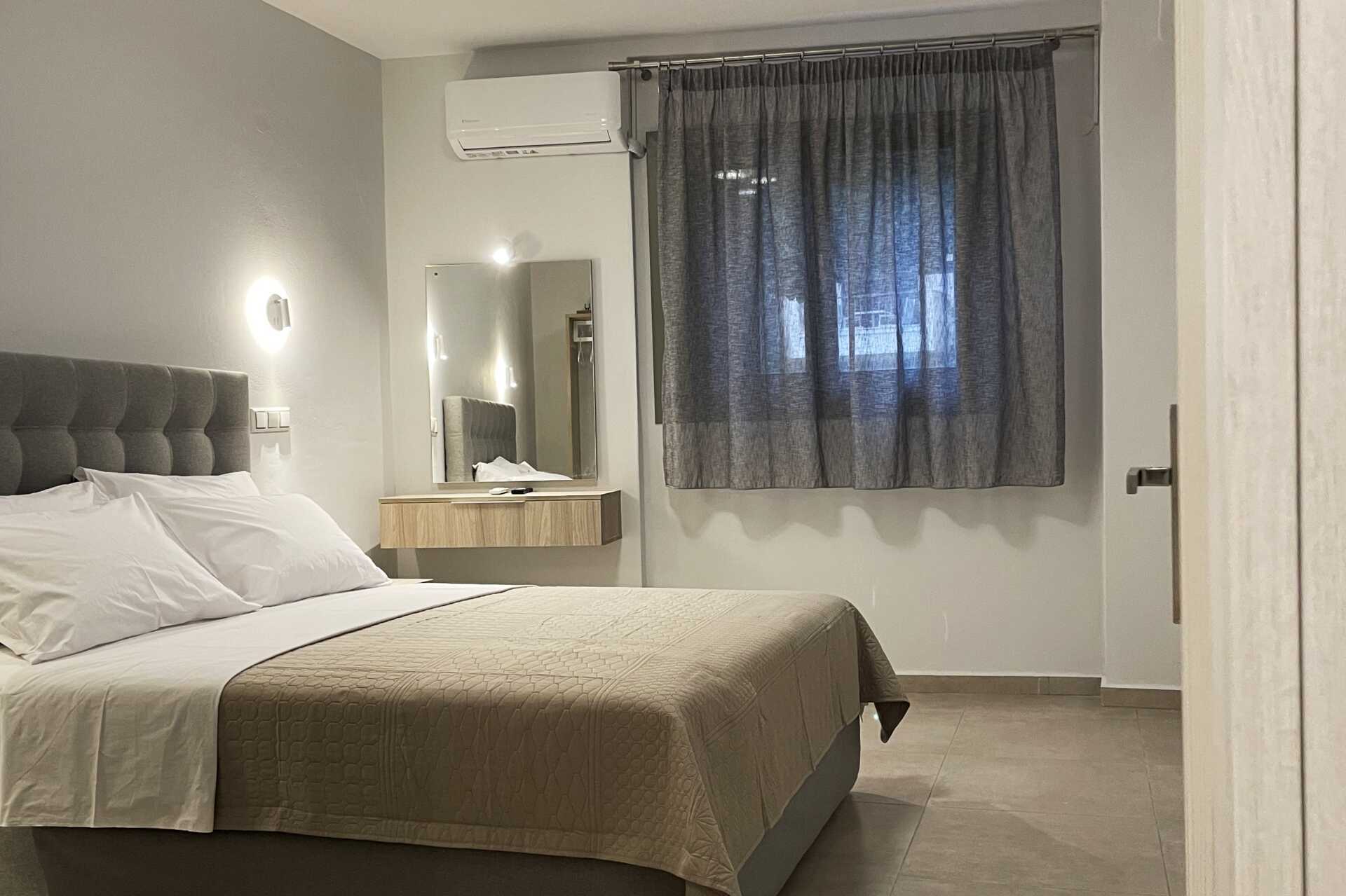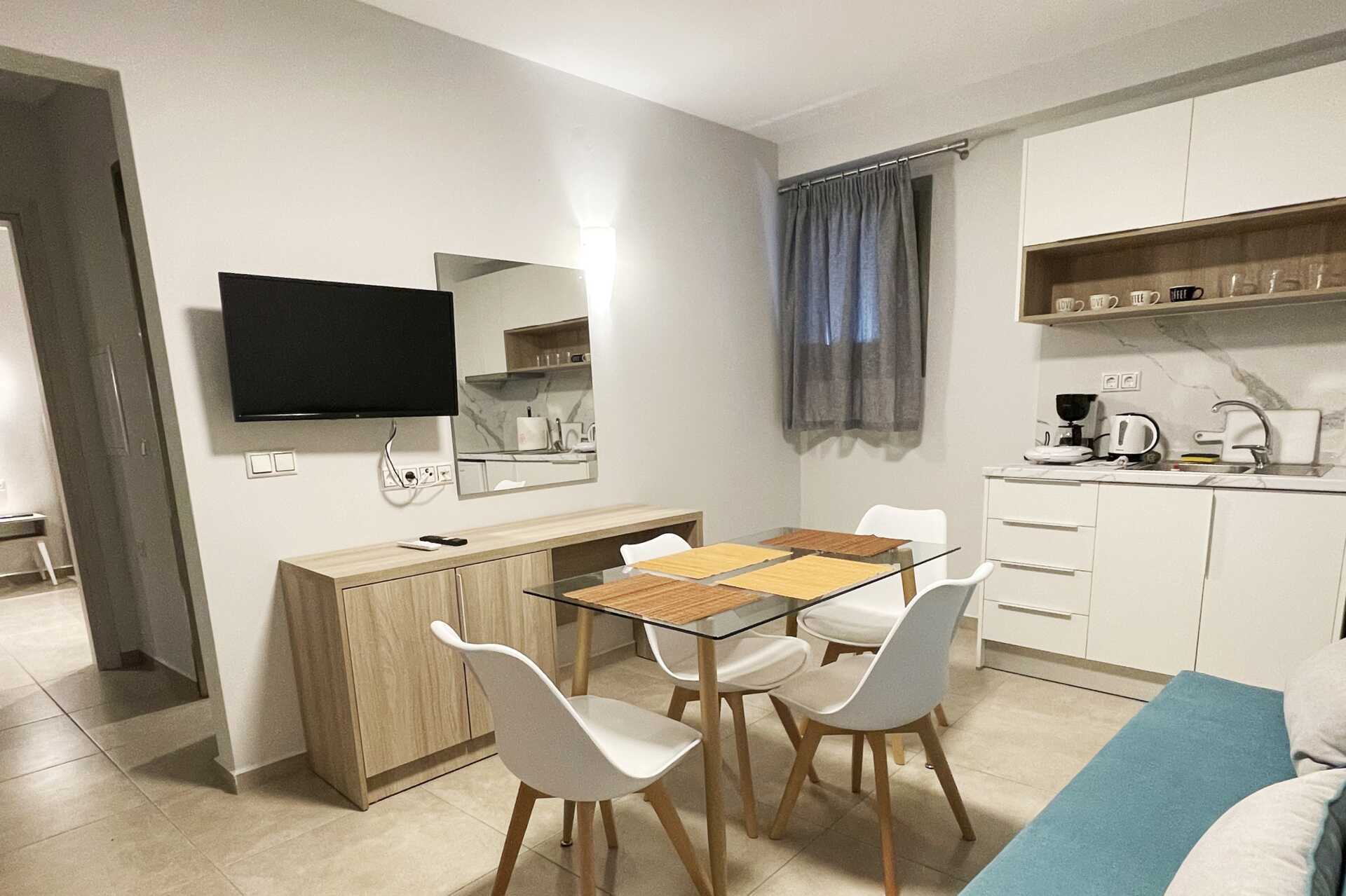 Enrumslägenhet med terrass eller balkong. Sovrum kombinerat med minikök. En dubbelsäng. Minikök med kokplattor, kylskåp, kaffebryggare, vattenkokare, smörgåsgrill och enkel köksutrustning. Wifi och deponering ingår. Luftkonditionering mot avgift. Tv med internationella kanaler. Hårtork. Badrum med dusch och wc. Städning 6 ggr/vecka. Barn under två år räknas in i max antal personer i lägenheten.