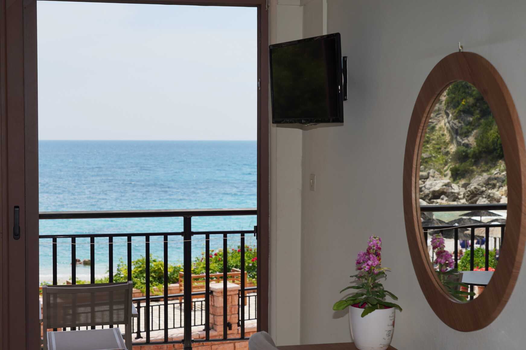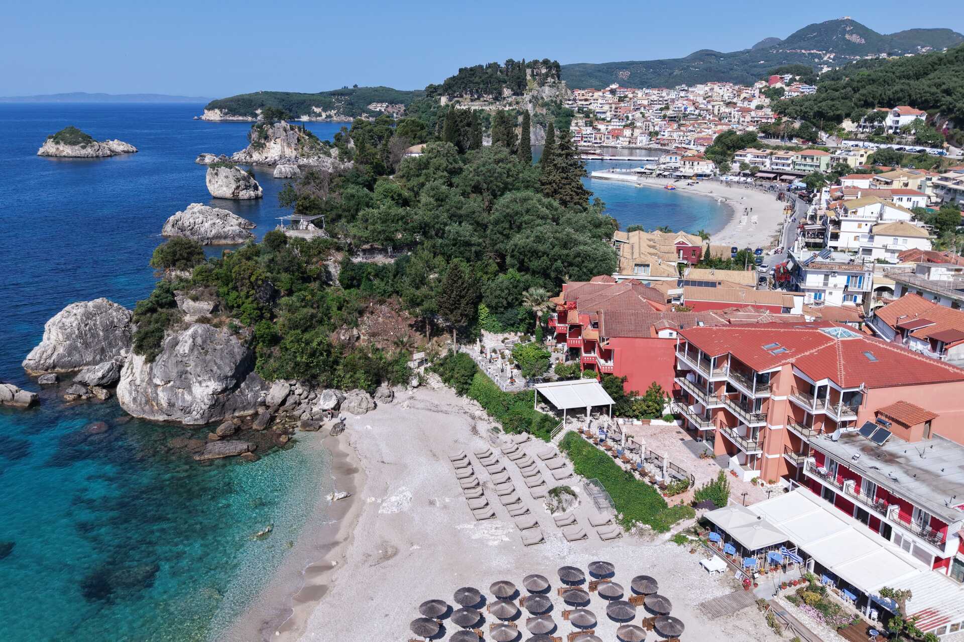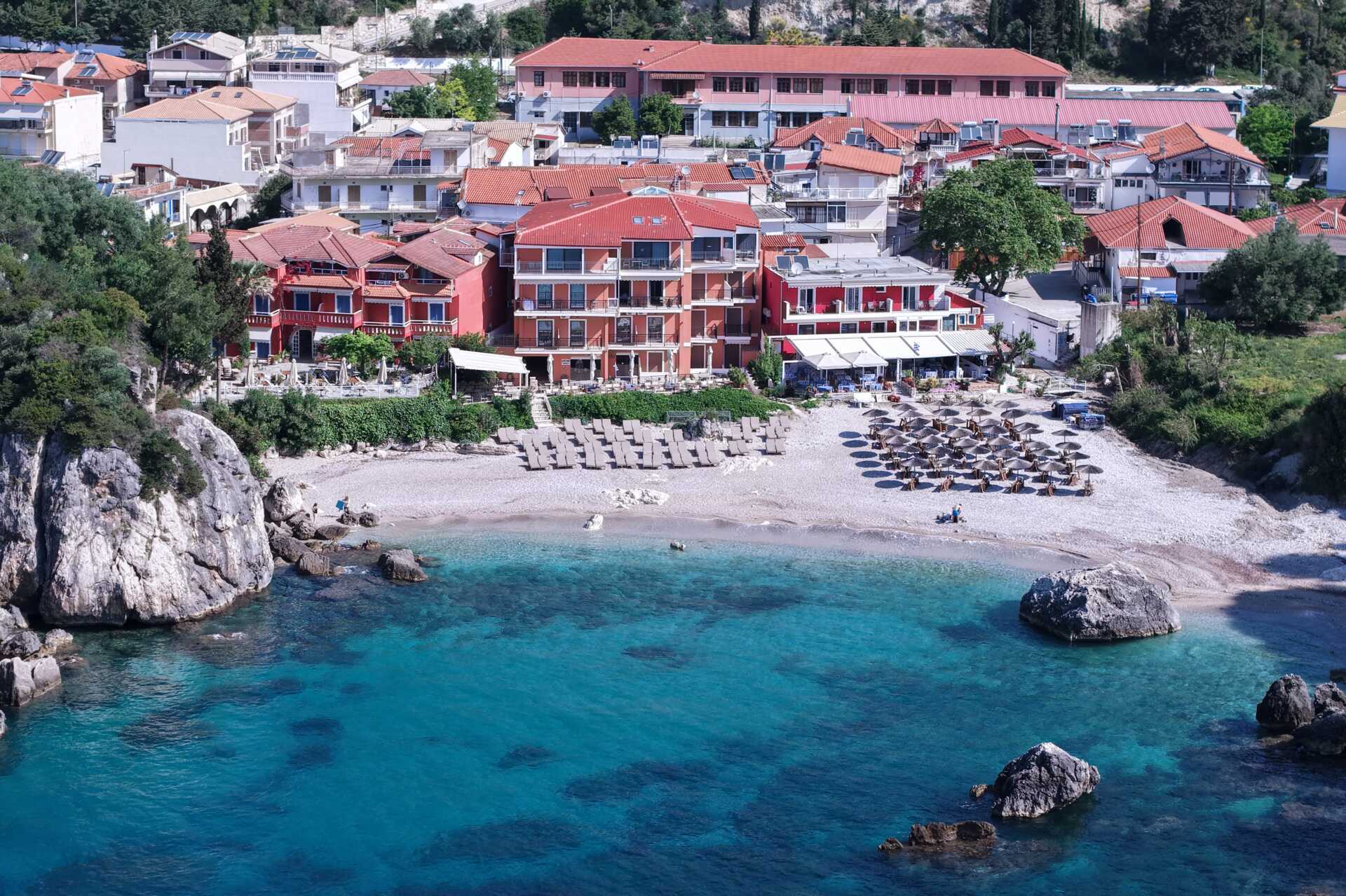 Hotellet ligger precis vid den lilla Piso Krioneri Beach i utkanten av Parga och nedanför hotellet finns solstolar och parasoller att hyra under högsäsong.