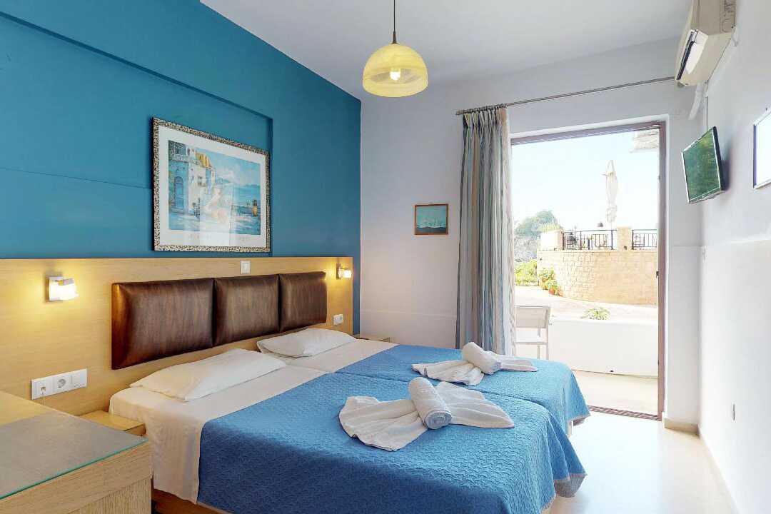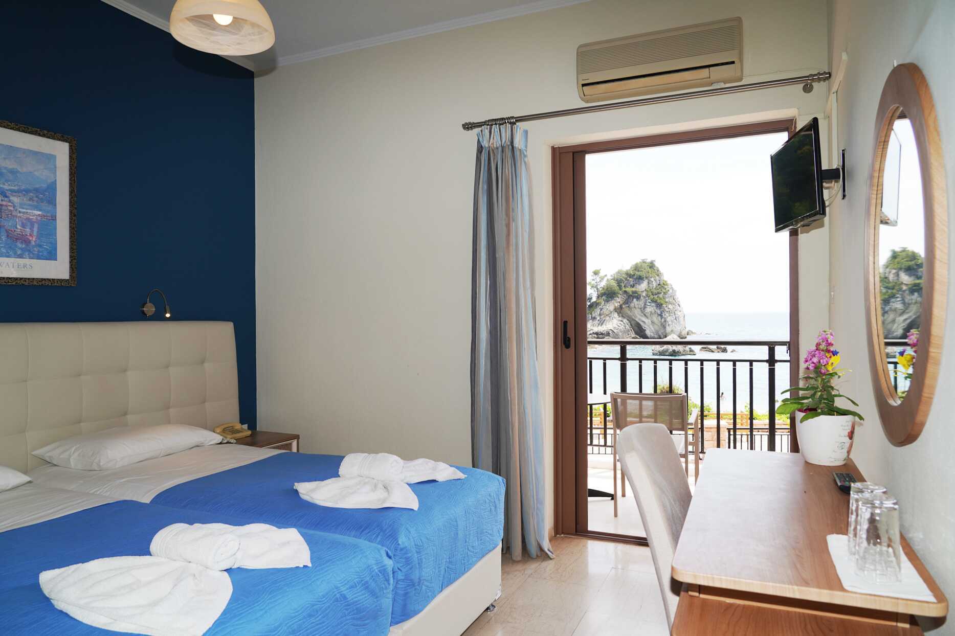 Deluxerum med balkong och havsutsikt. En dubbelsäng eller två enkelsängar. Möjlighet till extrabädd i bäddsoffa. Wifi, luftkonditionering och deponering ingår. Kylskåp. Tv med internationella kanaler. Hårtork. Badrum med dusch och wc. Städning 7 ggr/vecka.
