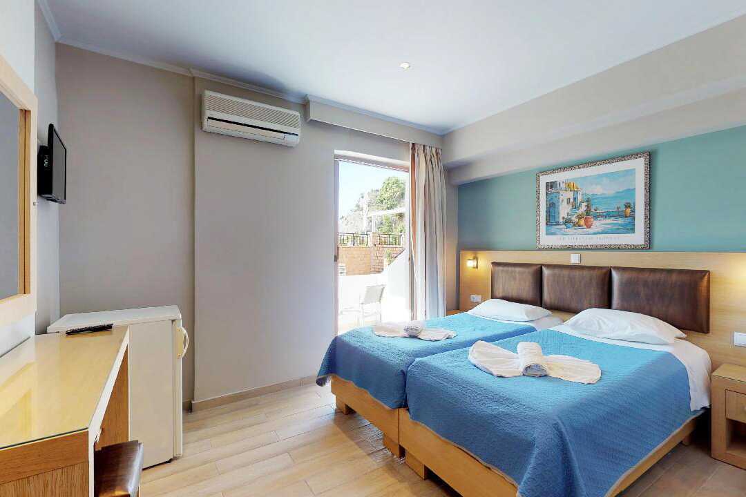 Dubbelrum med balkong eller markbalkong i varierade storlekar. Vissa balkonger har havsutsikt. Två enkelsängar. Kylskåp. Wifi, luftkonditionering och deponering ingår. Tv med internationella kanaler. Hårtork. Badrum med dusch och wc. Städning 7 ggr/vecka.