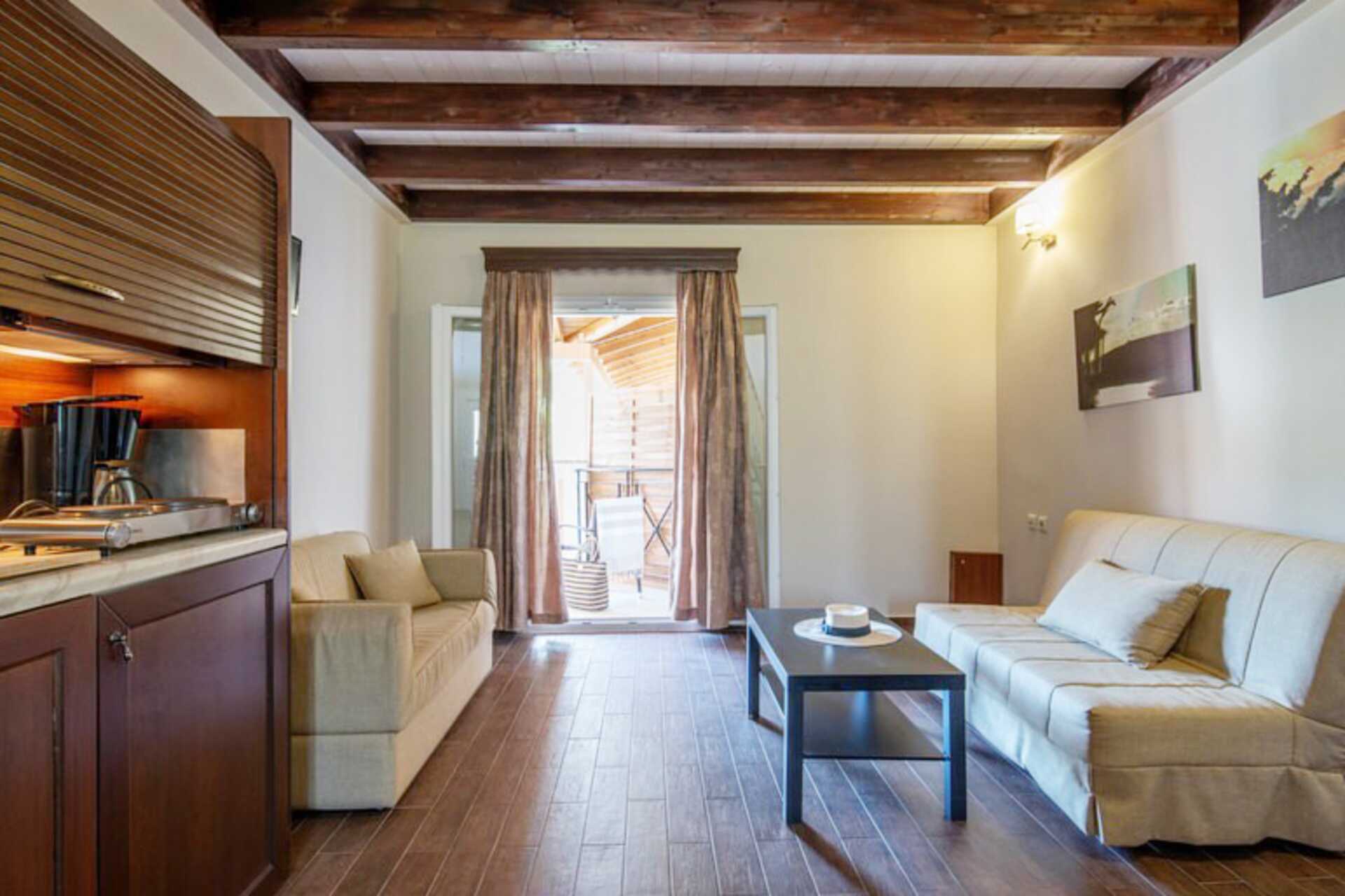Enrumslägenhet superior med balkong eller terrass och utsikt mot trädgården. Kombinerat sovrum med minikök. En dubbelsäng eller två enkelsängar. Möjlighet till extrabädd i bäddsoffa. Observera att det kan bli trångt i lägenheten om extrabädd utnyttjas. Minikök med kylskåp, kokplattor, kaffebryggare, vattenkokare och enkel köksutrustning. Matplats på balkongen eller terrassen. Luftkonditionering, deponering och wifi ingår. Tv med internationella kanaler. Hårtork. Badrum med badkar eller dusch och wc. Städning 7 ggr/vecka. Barn under två år räknas in i maxantalet personer i lägenheten.