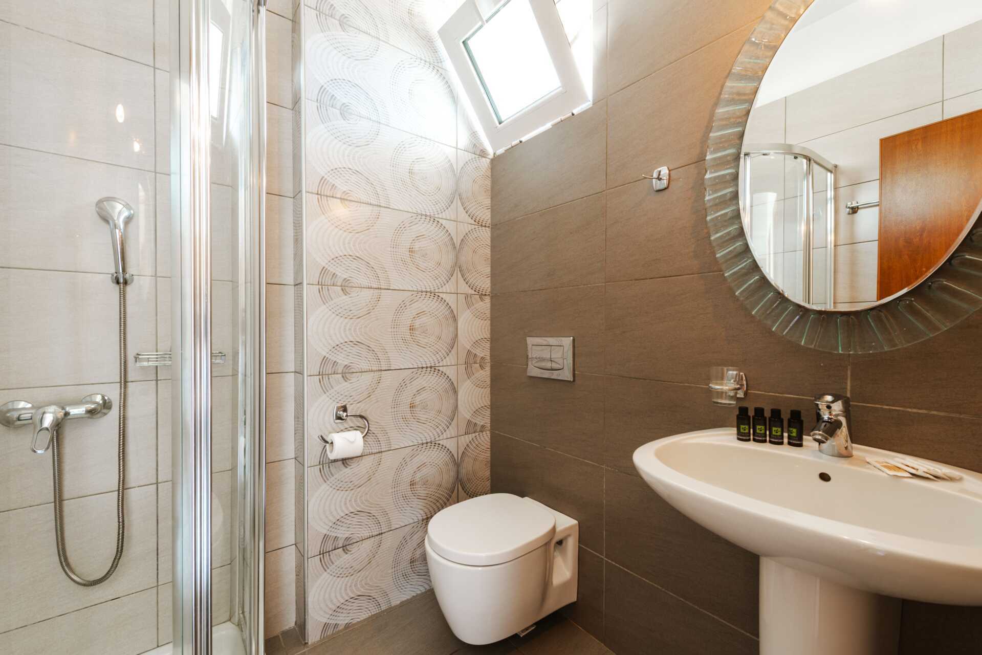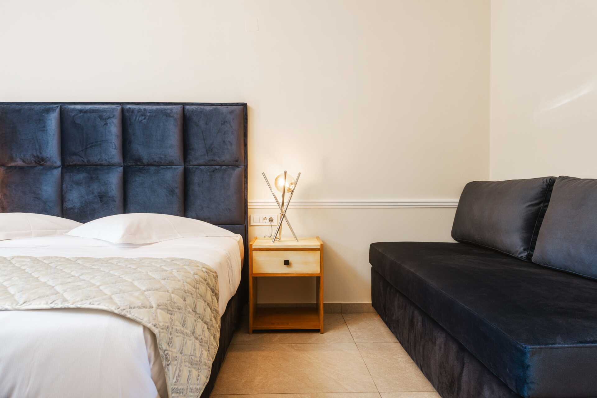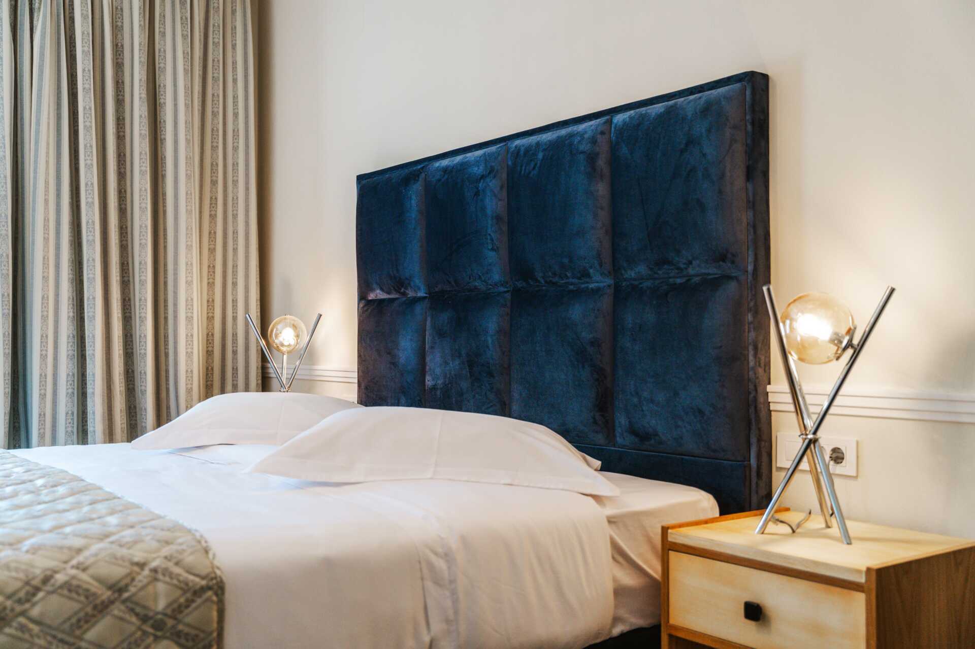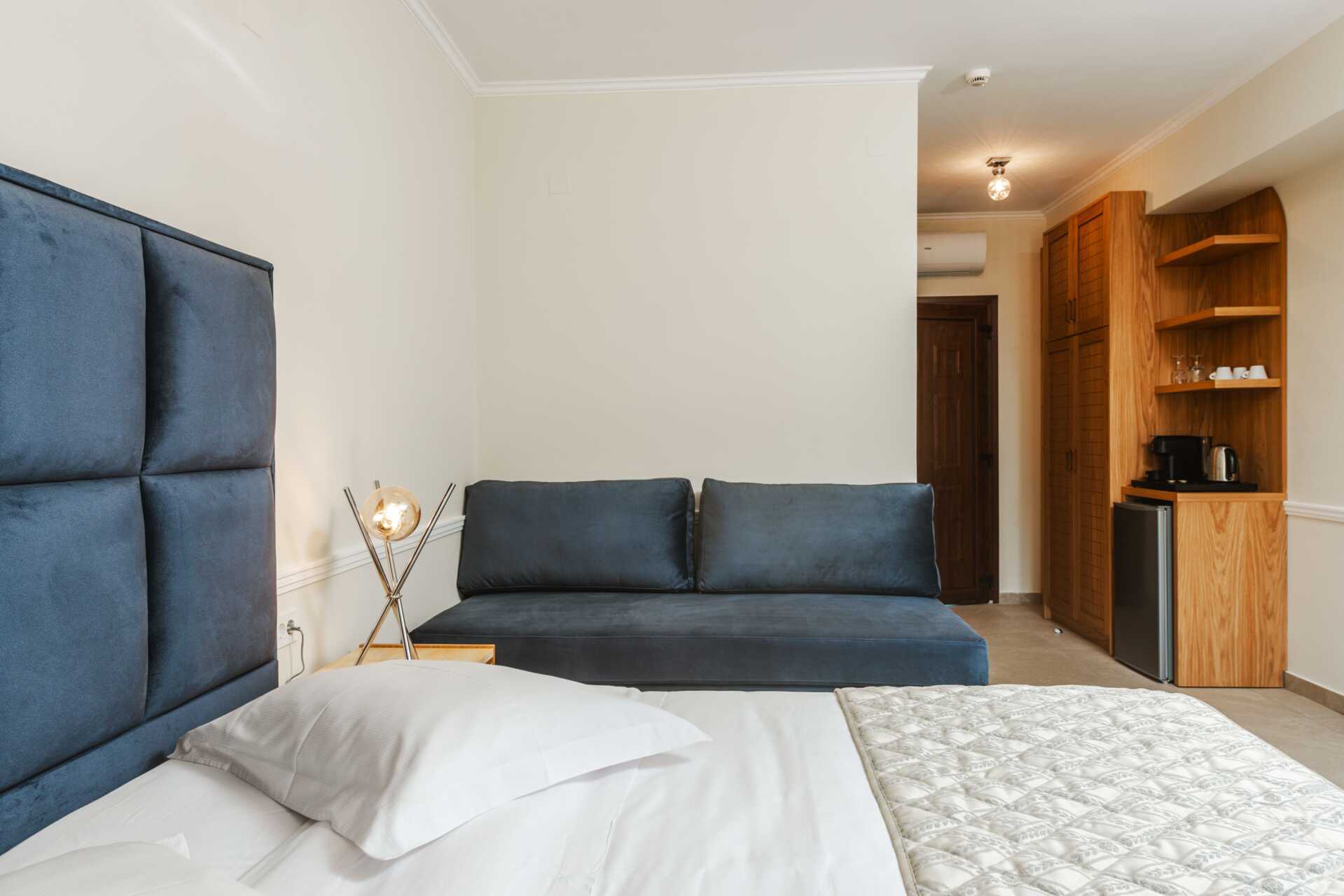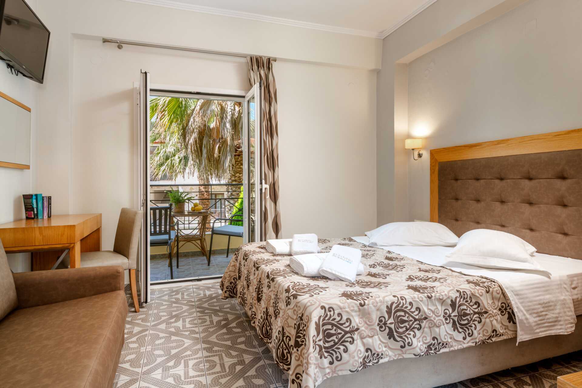 Deluxerum med balkong. En dubbelsäng eller två enkelsängar. Bäddsoffa i rummen för 3 personer. Luftkonditionering, deponering och wifi ingår. Kylskåp. Vattenkokare. Espresso kaffemaskin, kapslar ingår. Tv med internationella kanaler. Badrockar och tofflor. Hårtork. Badrum med dusch och wc. Städning 7 ggr/vecka. Barn under två år räknas in i maxantalet personer i rummet.