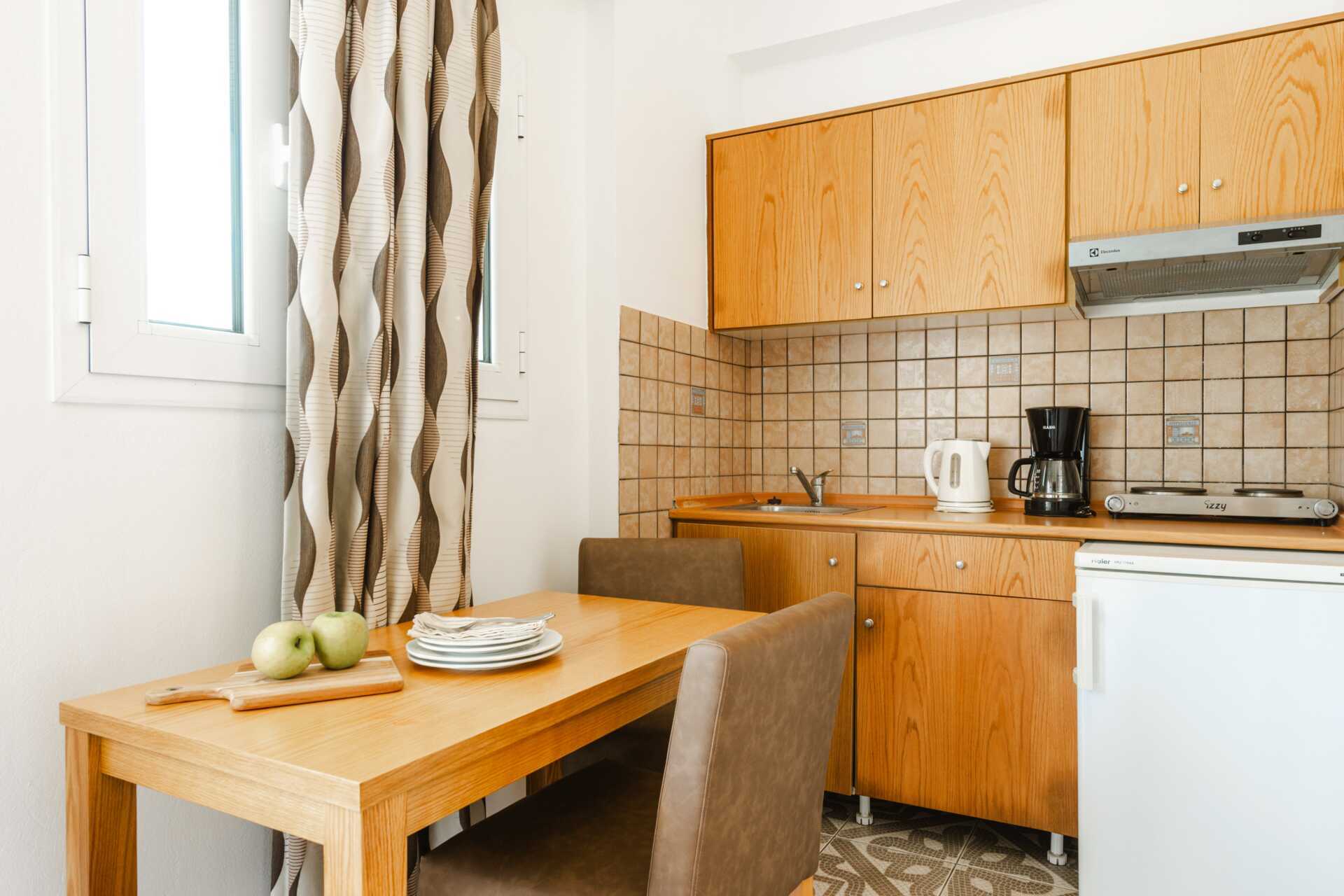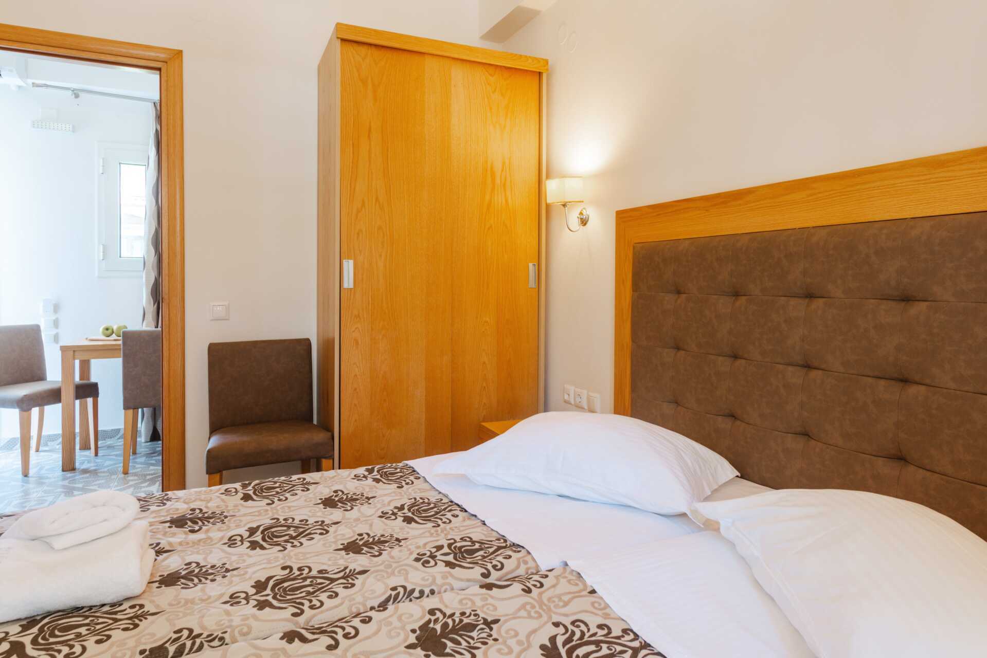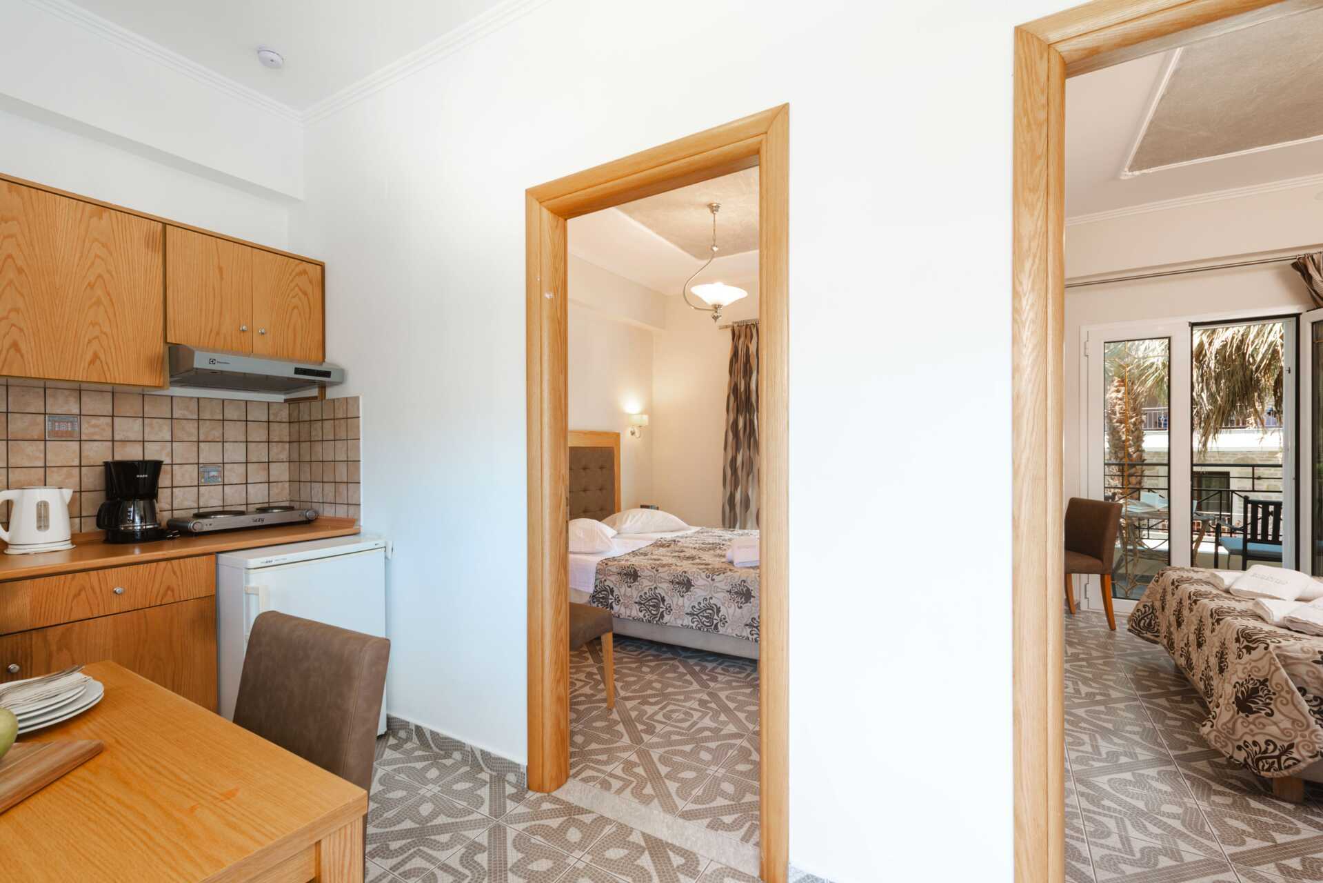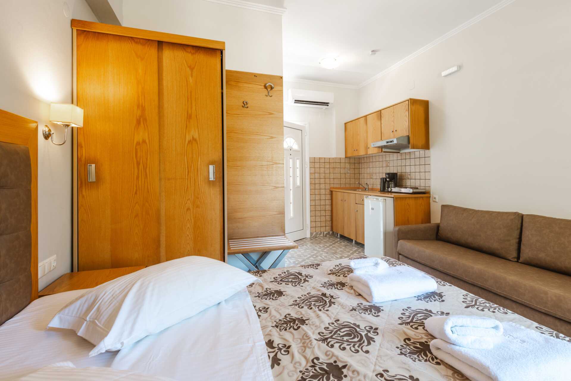 Enrumslägenhet superior med balkong eller terrass och utsikt mot trädgården. Kombinerat sovrum med minikök. En dubbelsäng eller två enkelsängar. Möjlighet till extrabädd i bäddsoffa. Observera att det kan bli trångt i lägenheten om extrabädd utnyttjas. Minikök med kylskåp, kokplattor, kaffebryggare, vattenkokare och enkel köksutrustning. Matplats på balkongen eller terrassen. Luftkonditionering, deponering och wifi ingår. Tv med internationella kanaler. Hårtork. Badrum med badkar eller dusch och wc. Städning 7 ggr/vecka. Barn under två år räknas in i maxantalet personer i lägenheten.