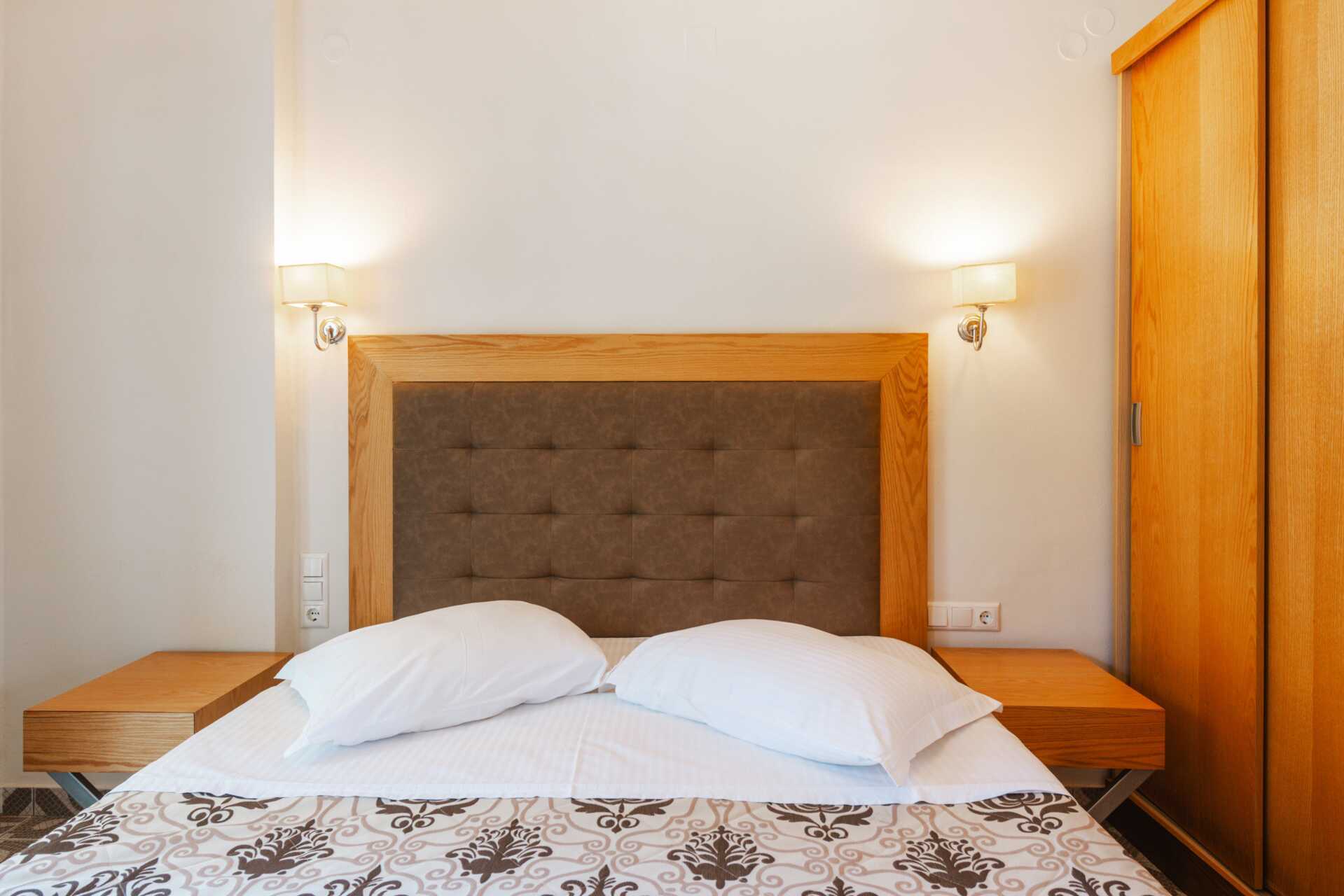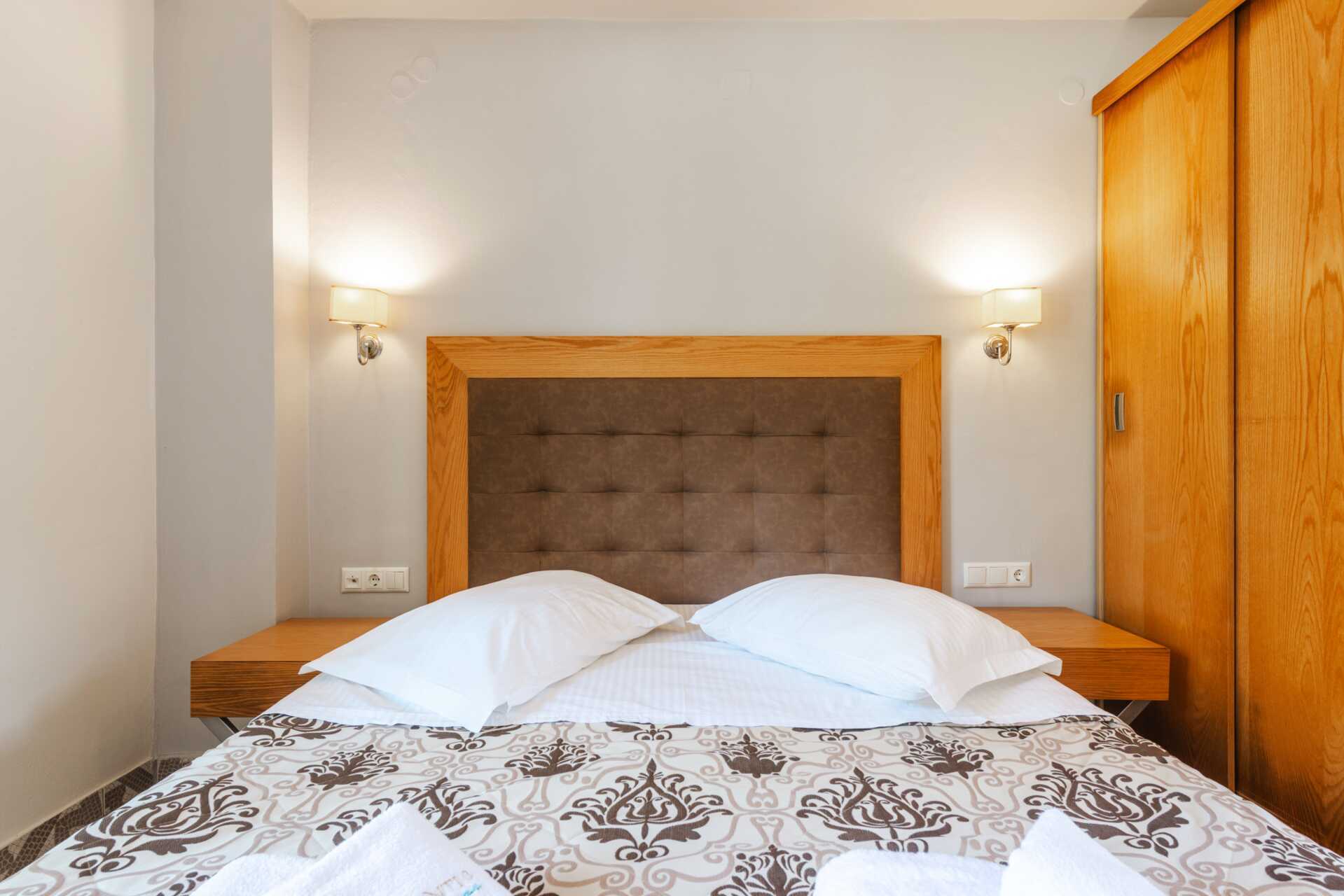 Trerumslägenhet balkong eller terrass. Två sovrum och minikök med matplats. En dubbelsäng eller två enkelsängar varje sovrum. Minikök med kokplattor, kylskåp, kaffebryggare, vattenkokare och enkel köksutrustning. Matplats på uteplatsen. Luftkonditionering, deponering och wifi ingår. Tv med internationella kanaler. Hårtork. Badrum med badkar eller dusch och wc. Städning 7 ggr/vecka. Barn under två år räknas in i maxantalet personer i lägenheten.