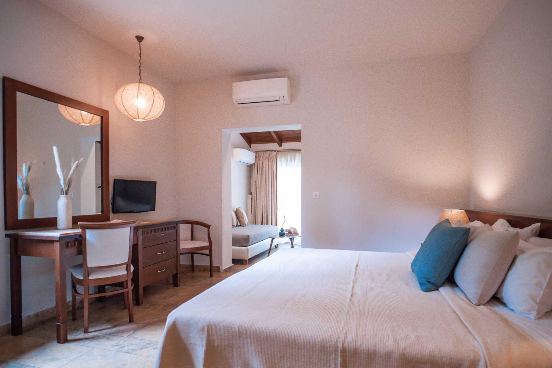 Tvårumslägenhet med balkong eller terrass eller med markterrass. Lägenheterna har renoverats till sommaren 2024. Dörr saknas mellan sovrum och det kombinerade vardagsrummet där det även finns ett minikök. En dubbelsäng eller två enkelsängar. Möjlighet till extrabädd i bäddsoffa. Minikök med kokplattor, kylskåp, vattenkokare och enkel köksutrustning. Wifi, deponering och luftkonditionering ingår. Tv med internationella kanaler. Hårtork. Badrum med dusch och wc. Städning 7 ggr/vecka.