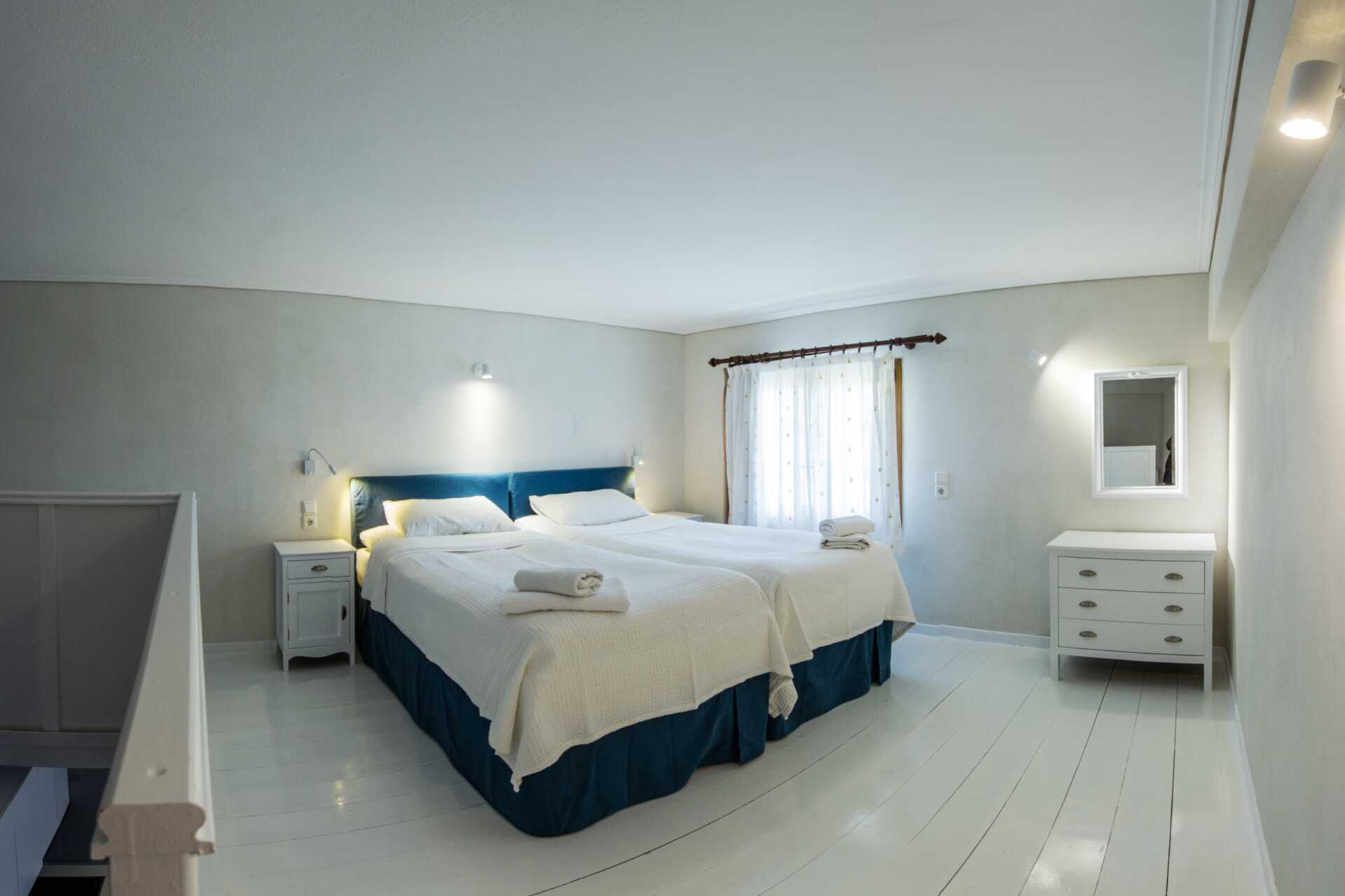 Dubbelrum i etage med balkong och havsutsikt. En trappa upp finns ett sovloft med två enkelsängar. I entréplan finns ett vardagsrum med möjlighet till extrabädd i bäddsoffa. Vid ankomst väntar en flaska vatten i lägenheten. Wifi, luftkonditionering och deponering ingår. Tv med internationella kanaler. Badrum med badkar eller dusch samt wc. Städning 6 ggr/vecka.