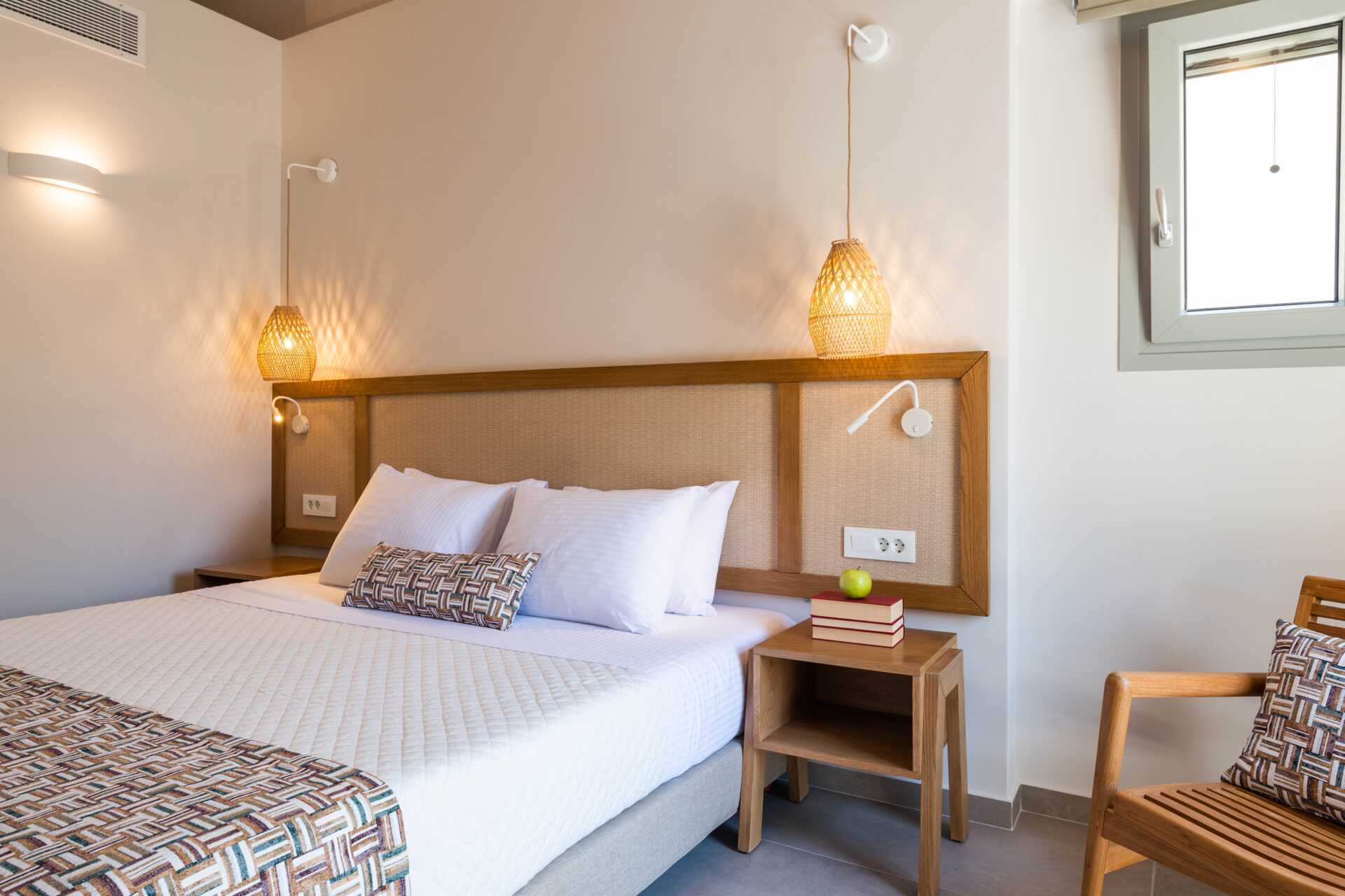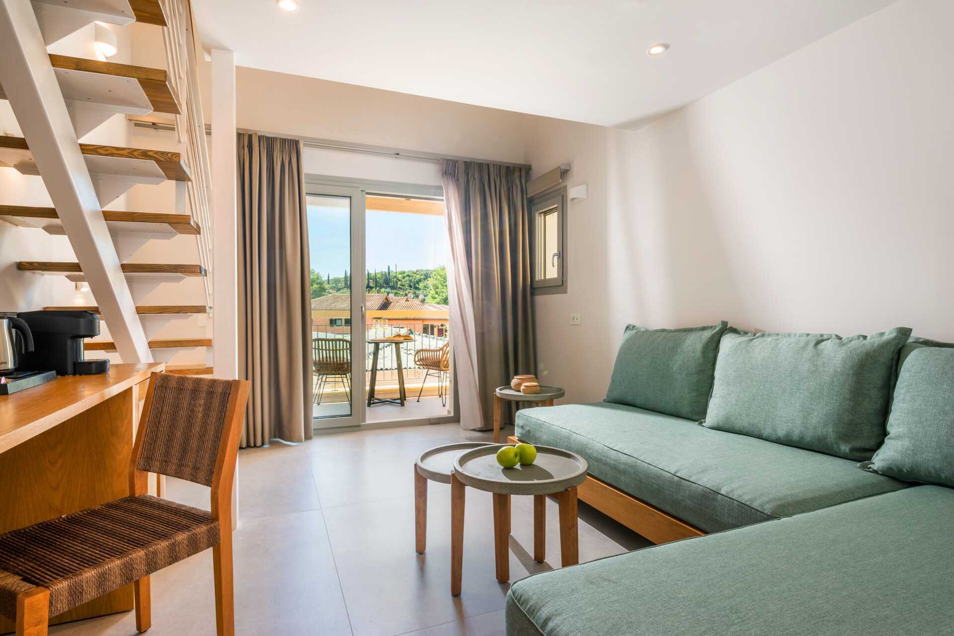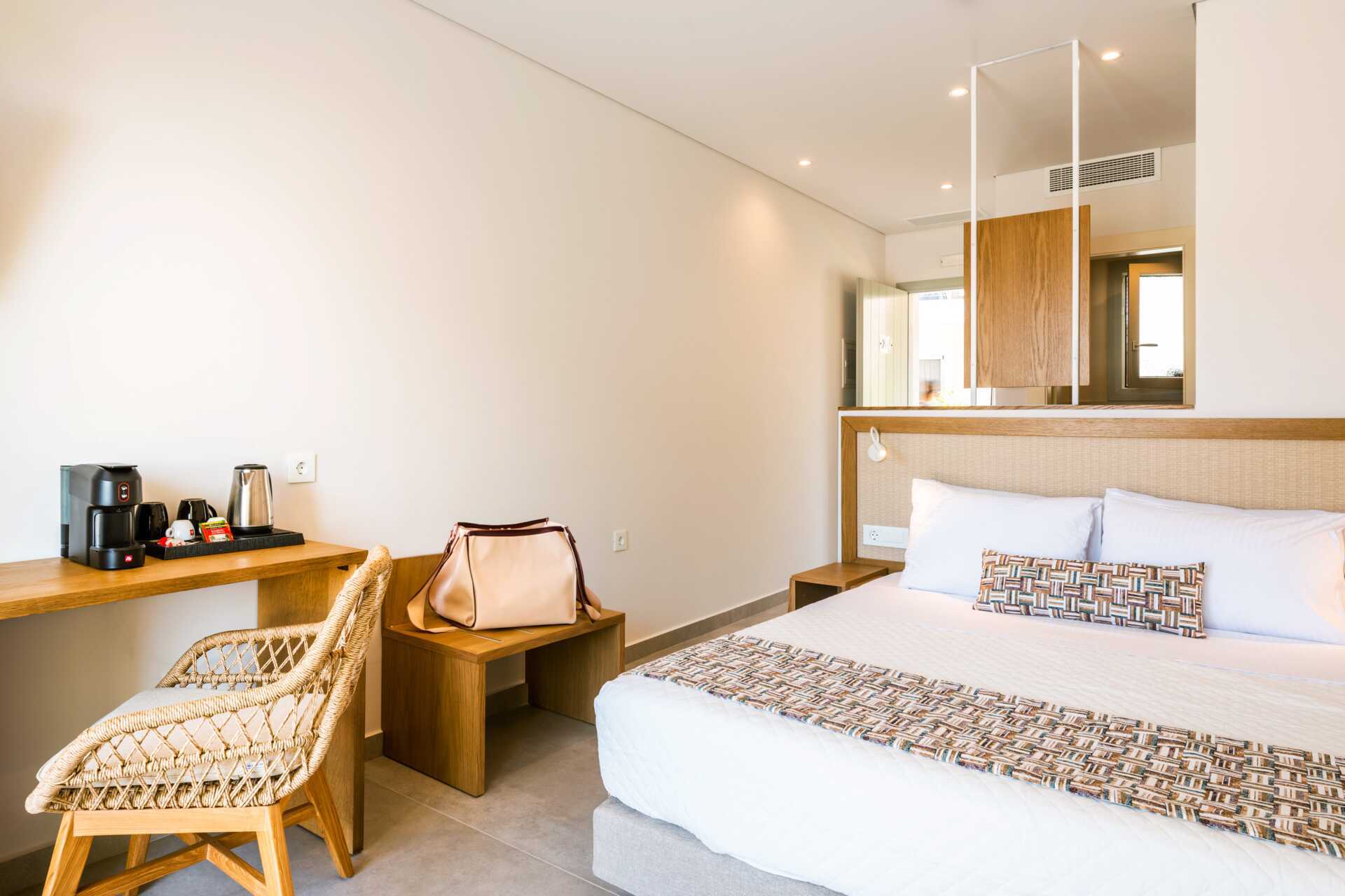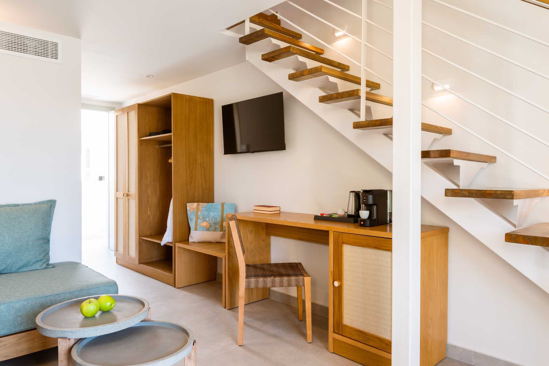 Dubbelrum med balkong, vissa med havsutsikt. På entréplan finns ett vardagsrum med en soffa samt ett badrum med hårtork, dusch och wc. En trappa upp finns ett sovloft med en dubbelsäng samt ett badrum med hårtork, dusch och wc. Wifi, luftkonditionering och deponering ingår. Kylskåp. Vattenkokare samt kaffe och te. Illy kaffemaskin - kapslar ingår vid ankomsten och finns sedan att köpa i receptionen. Tv med internationella kanaler. Tofflor. Städning 7 ggr/vecka.