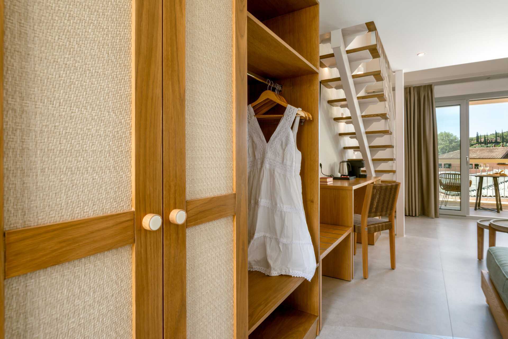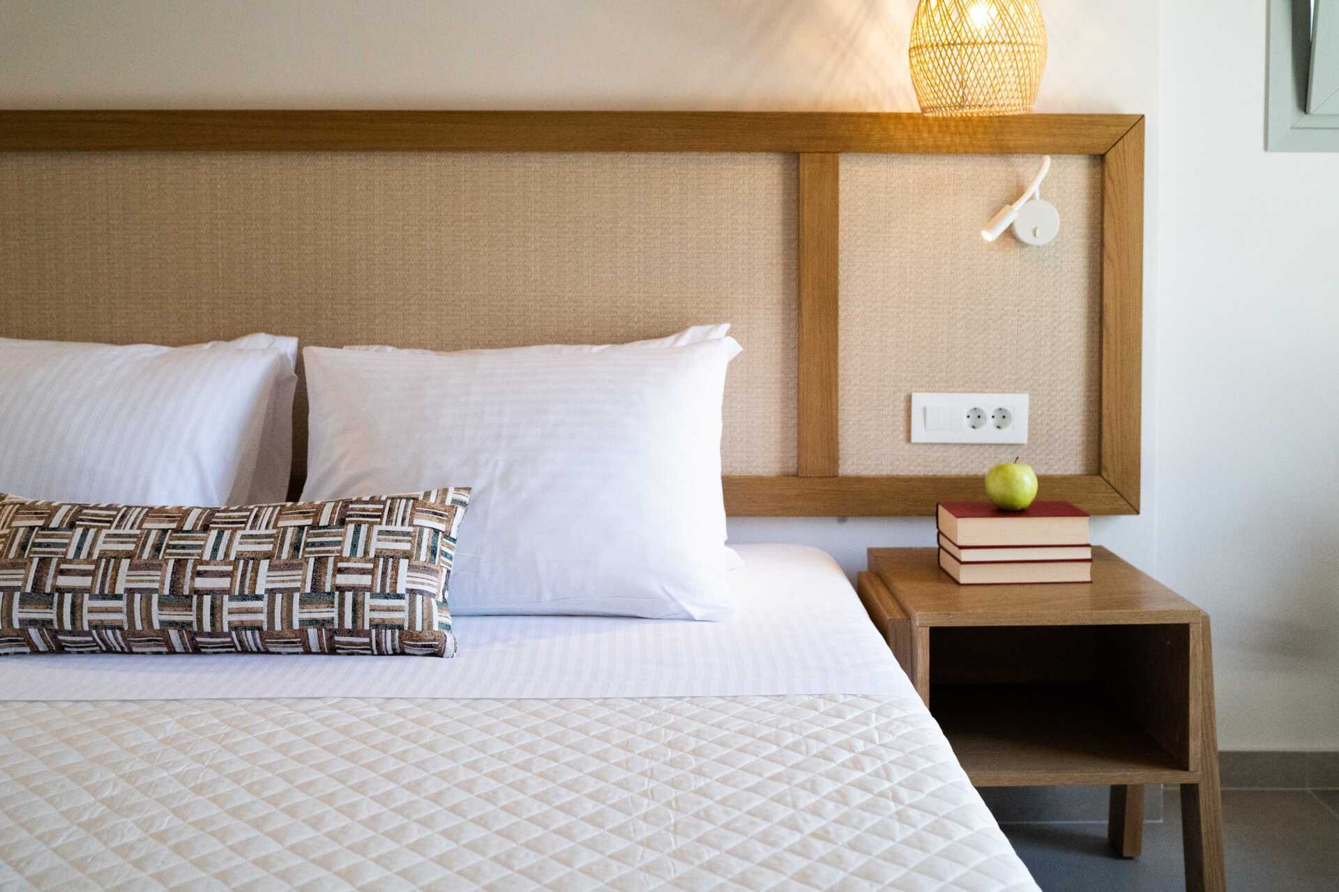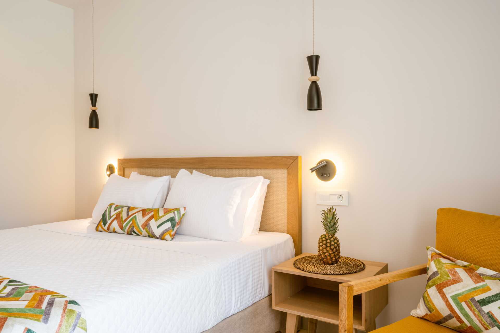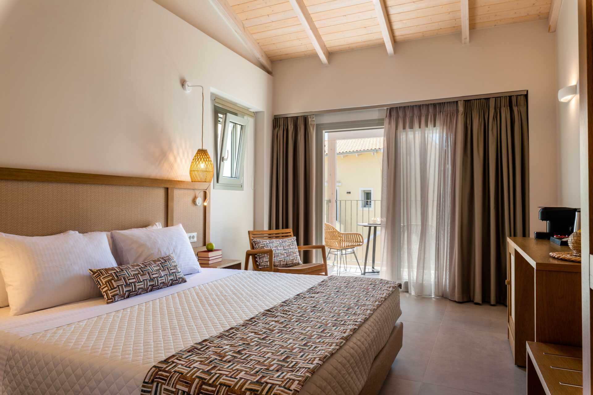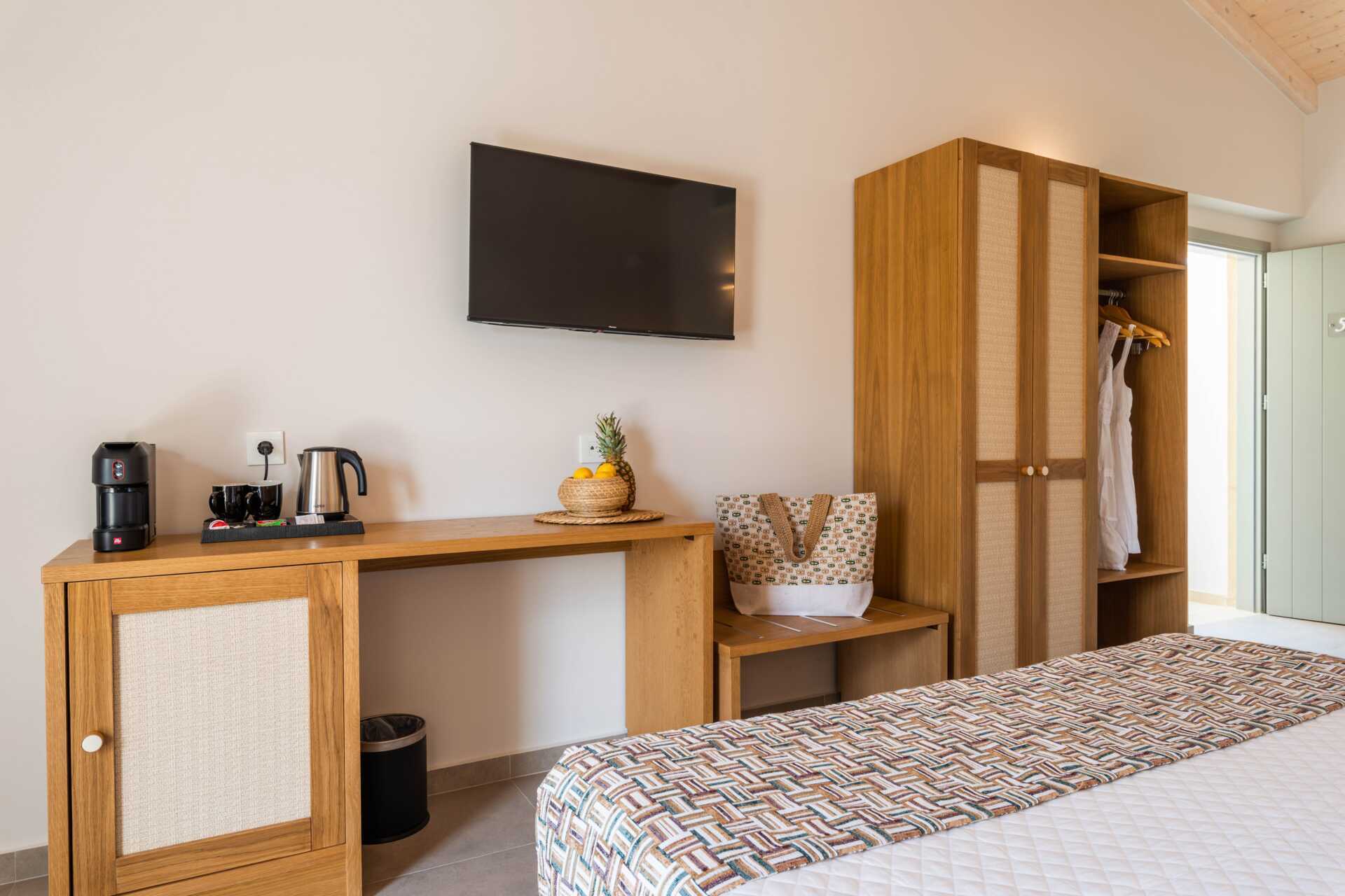 Dubbelrum med balkong, vissa med havsutsikt. På entréplan finns ett vardagsrum med en soffa samt ett badrum med hårtork, dusch och wc. En trappa upp finns ett sovloft med en dubbelsäng samt ett badrum med hårtork, dusch och wc. Wifi, luftkonditionering och deponering ingår. Kylskåp. Vattenkokare samt kaffe och te. Illy kaffemaskin - kapslar ingår vid ankomsten och finns sedan att köpa i receptionen. Tv med internationella kanaler. Tofflor. Städning 7 ggr/vecka.