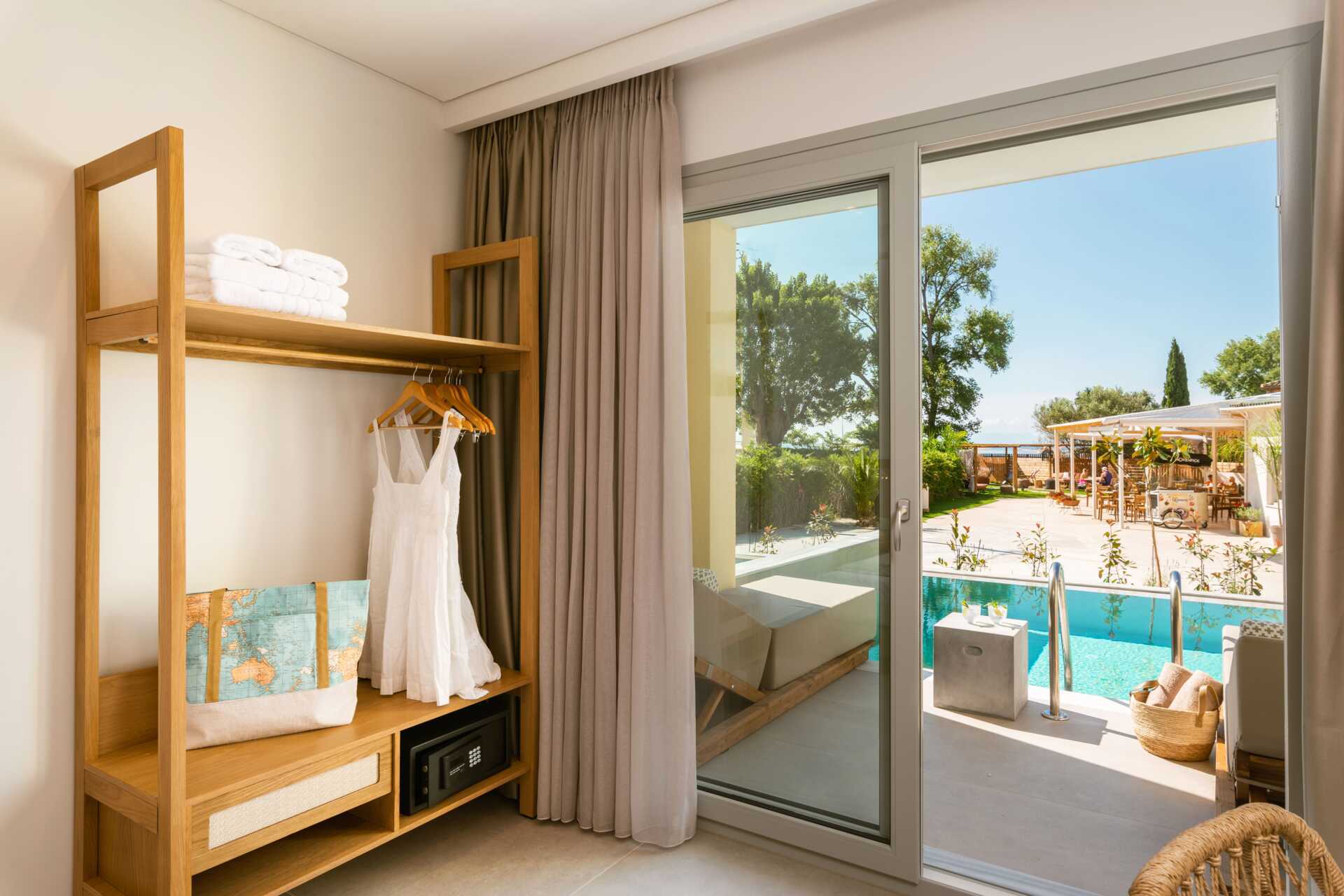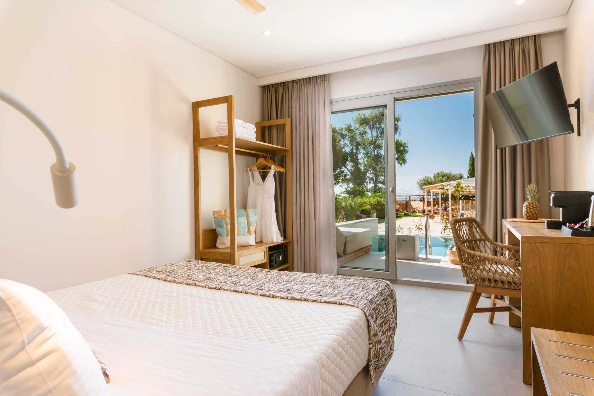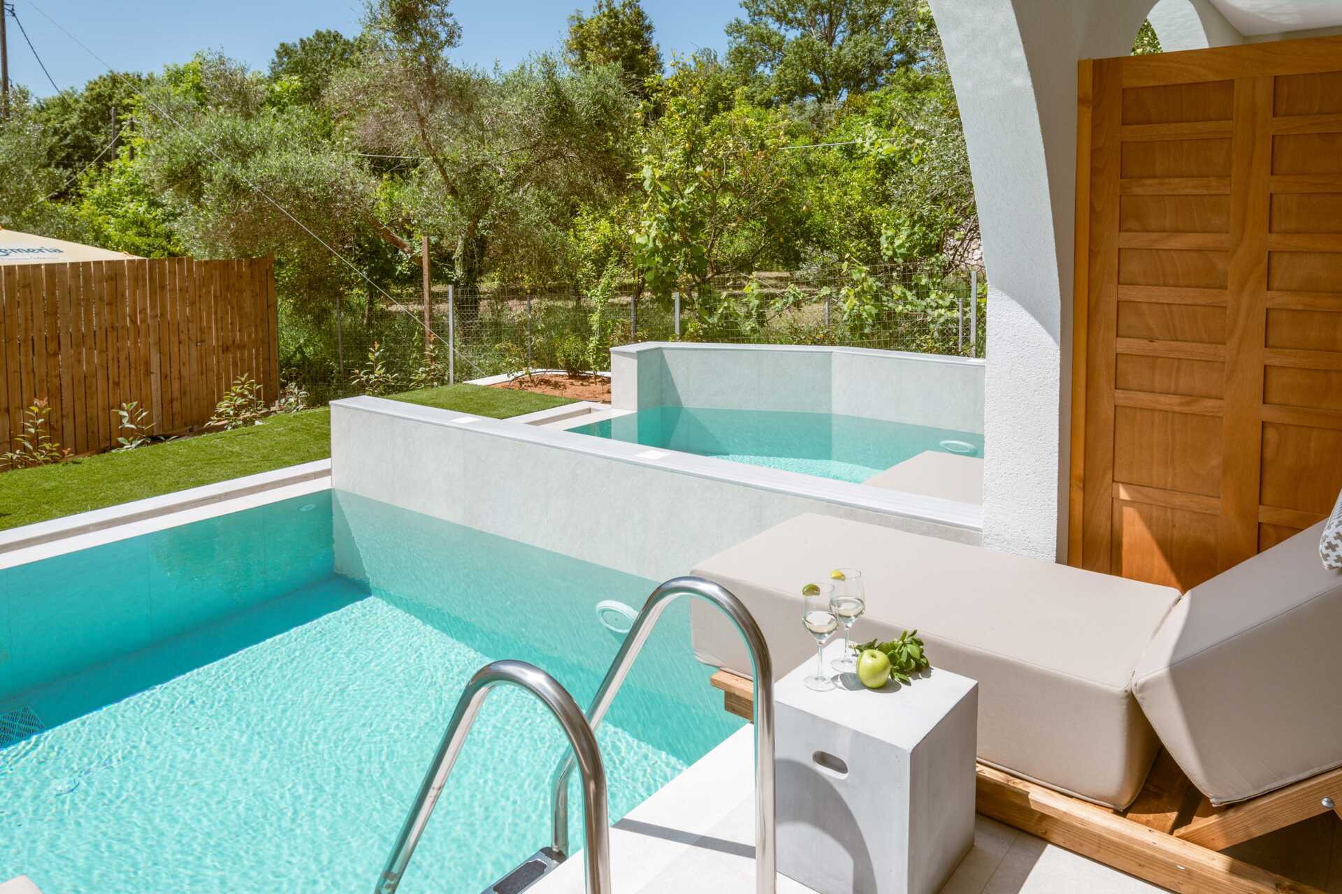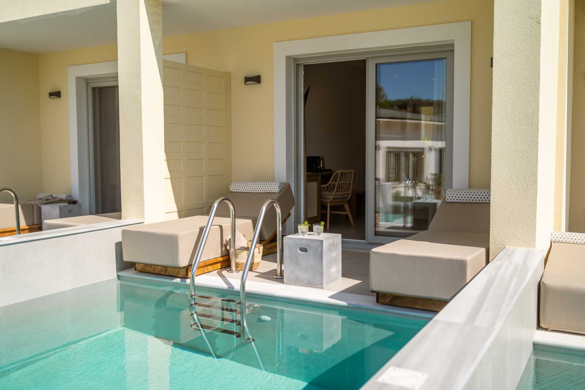 Dubbelrum med en privat pool på markterrassen. På terrassen finns två solsängar samt en stege ner i poolen. En dubbelsäng. Wifi, luftkonditionering och deponering ingår. Kylskåp. Vattenkokare samt kaffe och te. Illy kaffemaskin - kapslar ingår vid ankomsten och finns sedan att köpa i receptionen. Tv med internationella kanaler. Hårtork. Tofflor. Badrum med dusch och wc. Städning 7 ggr/vecka.