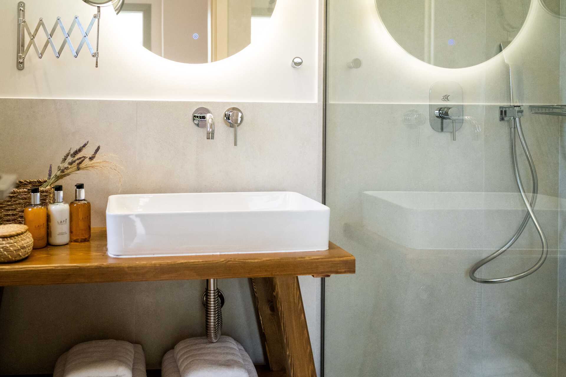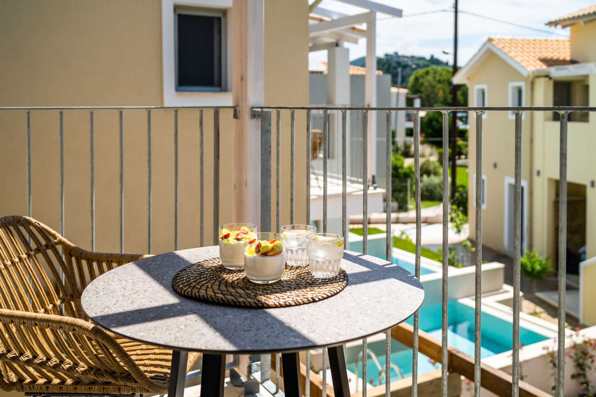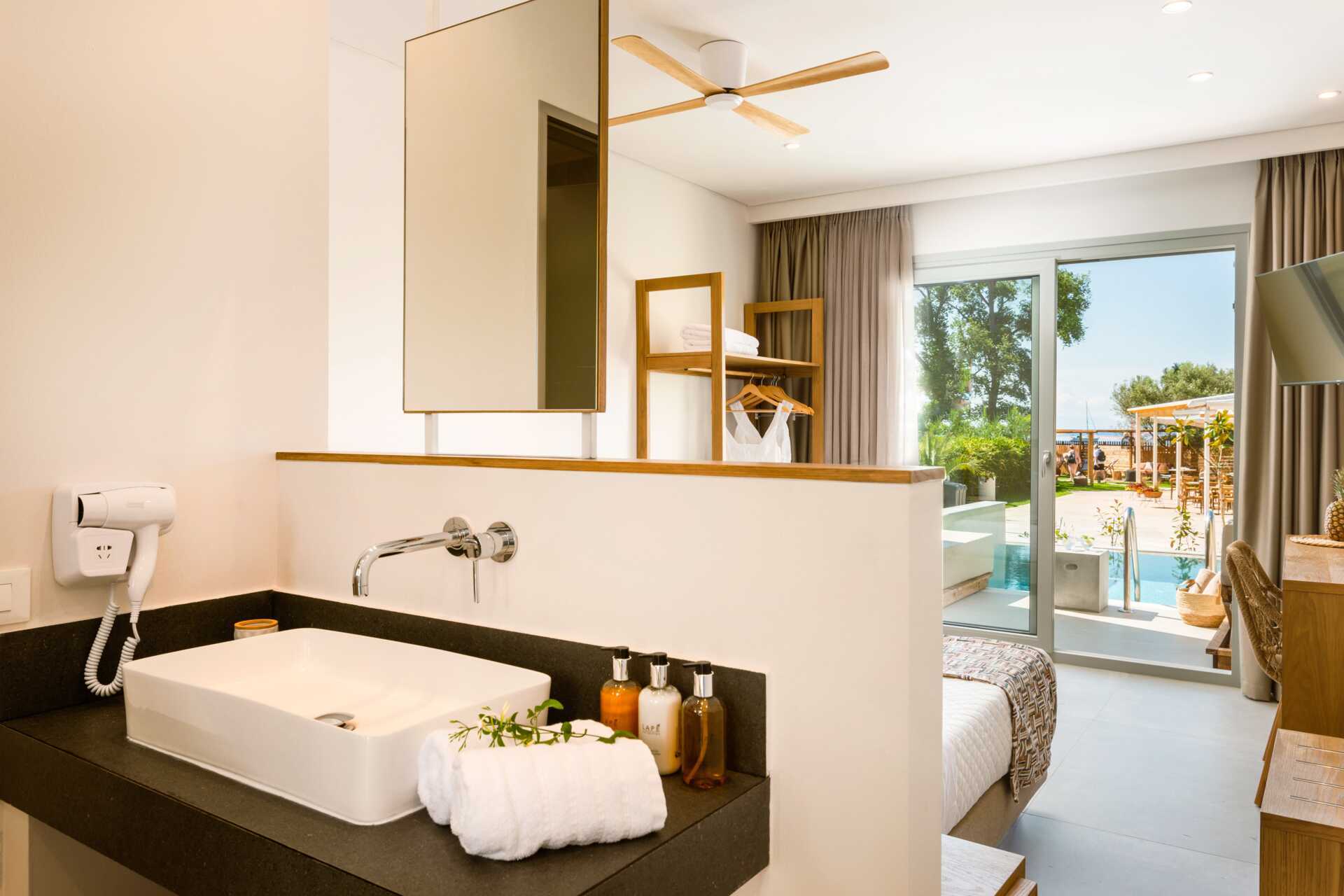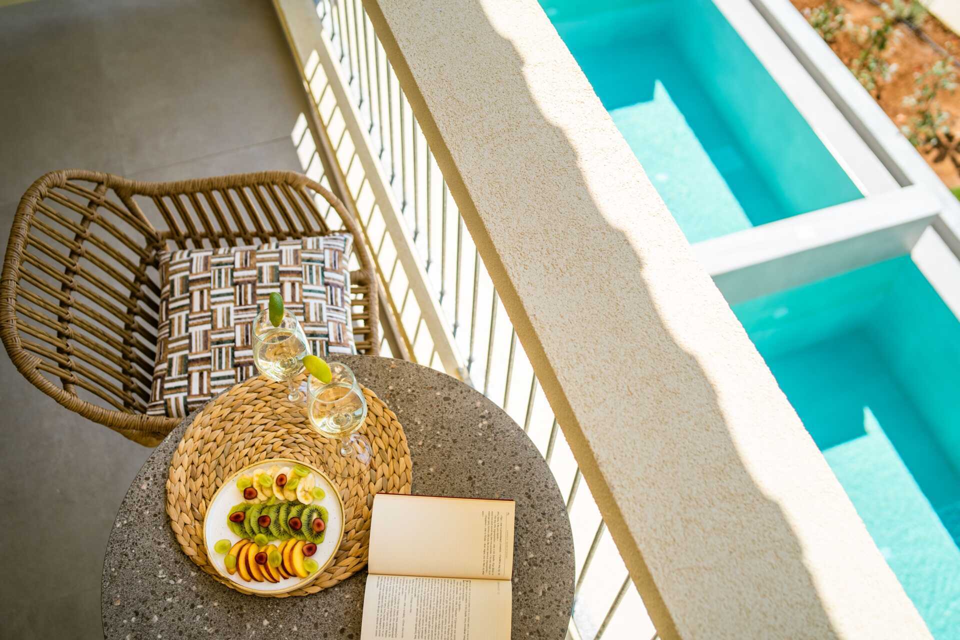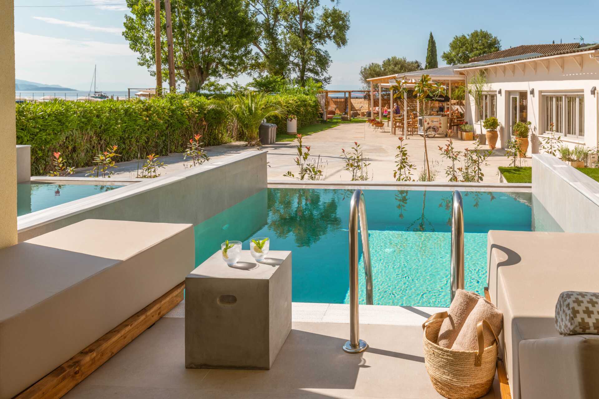 Dubbelrum med en privat pool på markterrassen. På terrassen finns två solsängar samt en stege ner i poolen. En dubbelsäng. Wifi, luftkonditionering och deponering ingår. Kylskåp. Vattenkokare samt kaffe och te. Illy kaffemaskin - kapslar ingår vid ankomsten och finns sedan att köpa i receptionen. Tv med internationella kanaler. Hårtork. Tofflor. Badrum med dusch och wc. Städning 7 ggr/vecka.