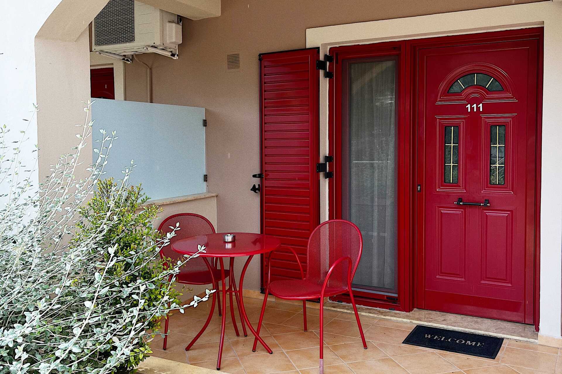 Enrumslägenhet med markterrass. Sovrum kombinerat med minikök. En dubbelsäng. Minikök med kokplattor, ugn, kylskåp, kaffebryggare, vattenkokare och enkel köksutrustning. Wifi, luftkonditionering och deponering ingår. Tv med internationella kanaler. Hårtork. Badrum med dusch och wc. Städning 6 ggr/vecka.