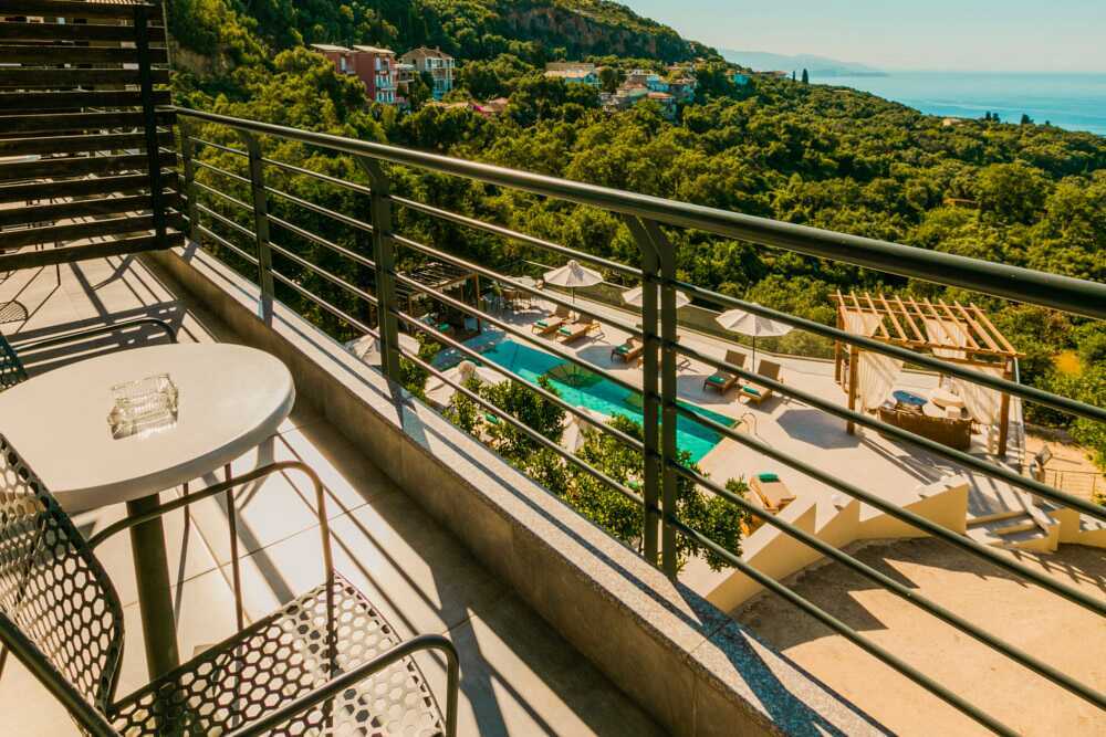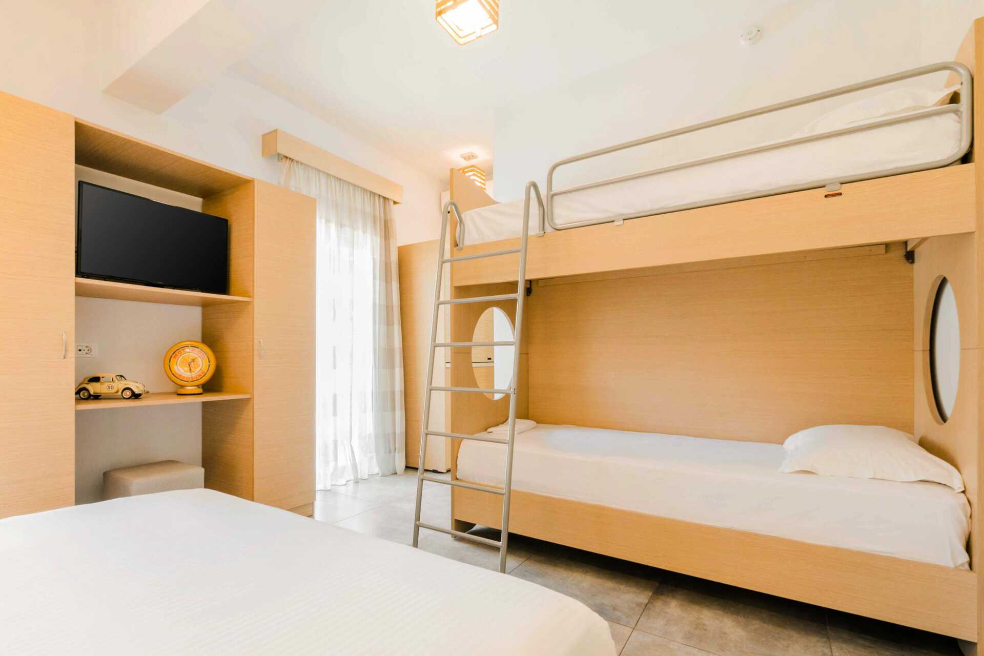 Deluxerum plus med balkong och begränsad havsutsikt. En dubbelsäng och möjlighet till extrabäddar för två barn i våningssäng. Wifi, luftkonditionering och deponering ingår. Kylskåp. Tv med internationella kanaler. Tofflor. Hårtork. Badrum med dusch och wc. Städning 6 ggr/vecka.