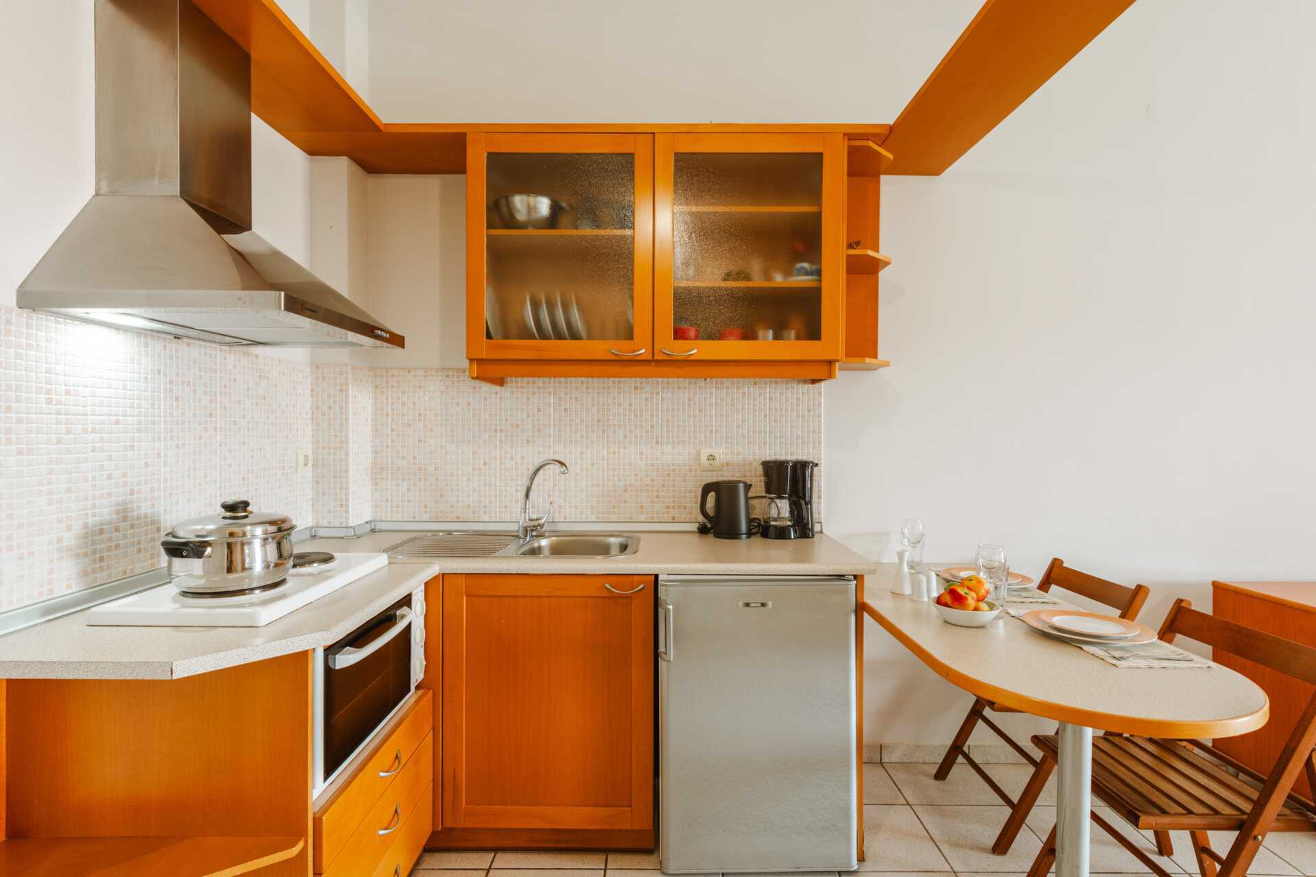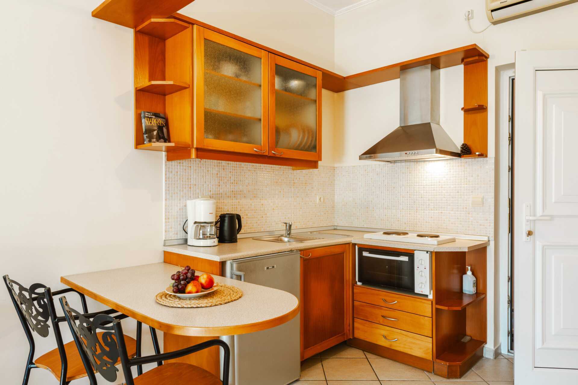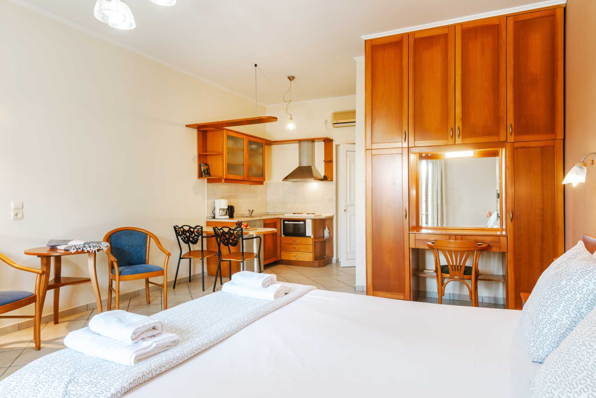 Enrumslägenheter med balkong som vetter mot havet. Sovrum kombinerat med minikök. En dubbelsäng. Minikök med kylskåp, kokplattor, ugn, vattenkokare, kaffebryggare, brödrost och enkel köksutrustning. Wifi ingår. Luftkonditionering och deponering mot avgift. Tv med internationella kanaler. Strykjärn och strykbräda. Badrum med dusch och wc. Städning 6 ggr/vecka.