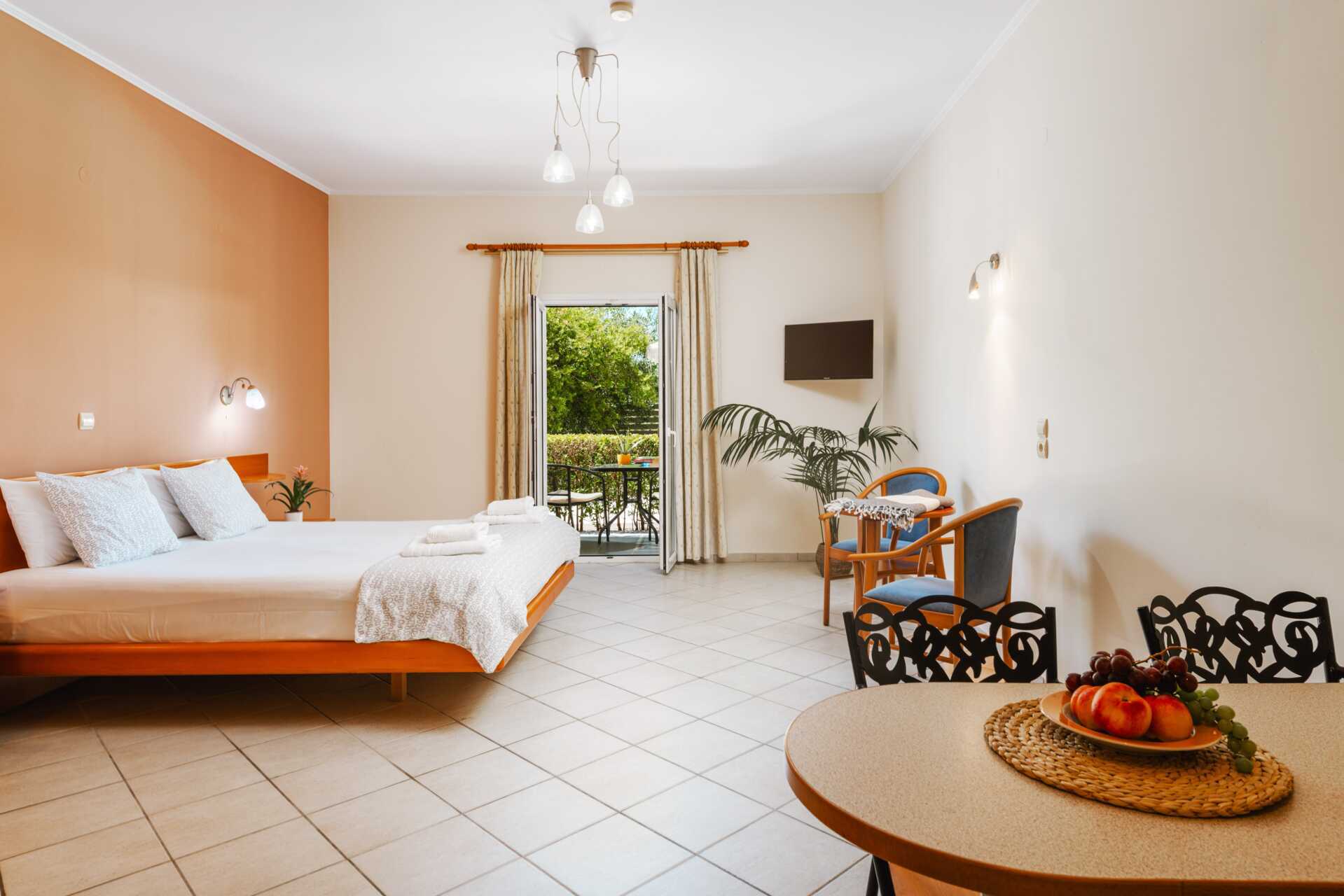 Enrumslägenheter med poolaccess till en gemensam pool från uteplatsen. Sovrum kombinerat med minikök. En dubbelsäng. Möjlighet till extrabädd i bäddsoffa. Minikök med kylskåp, liten ugn, vattenkokare, kaffebryggare, brödrost och enkel köksutrustning. Wifi ingår. Luftkonditionering och deponering mot avgift. Tv med internationella kanaler. Strykjärn och strykbräda. Badrum med dusch och wc. Städning 6 ggr/vecka.