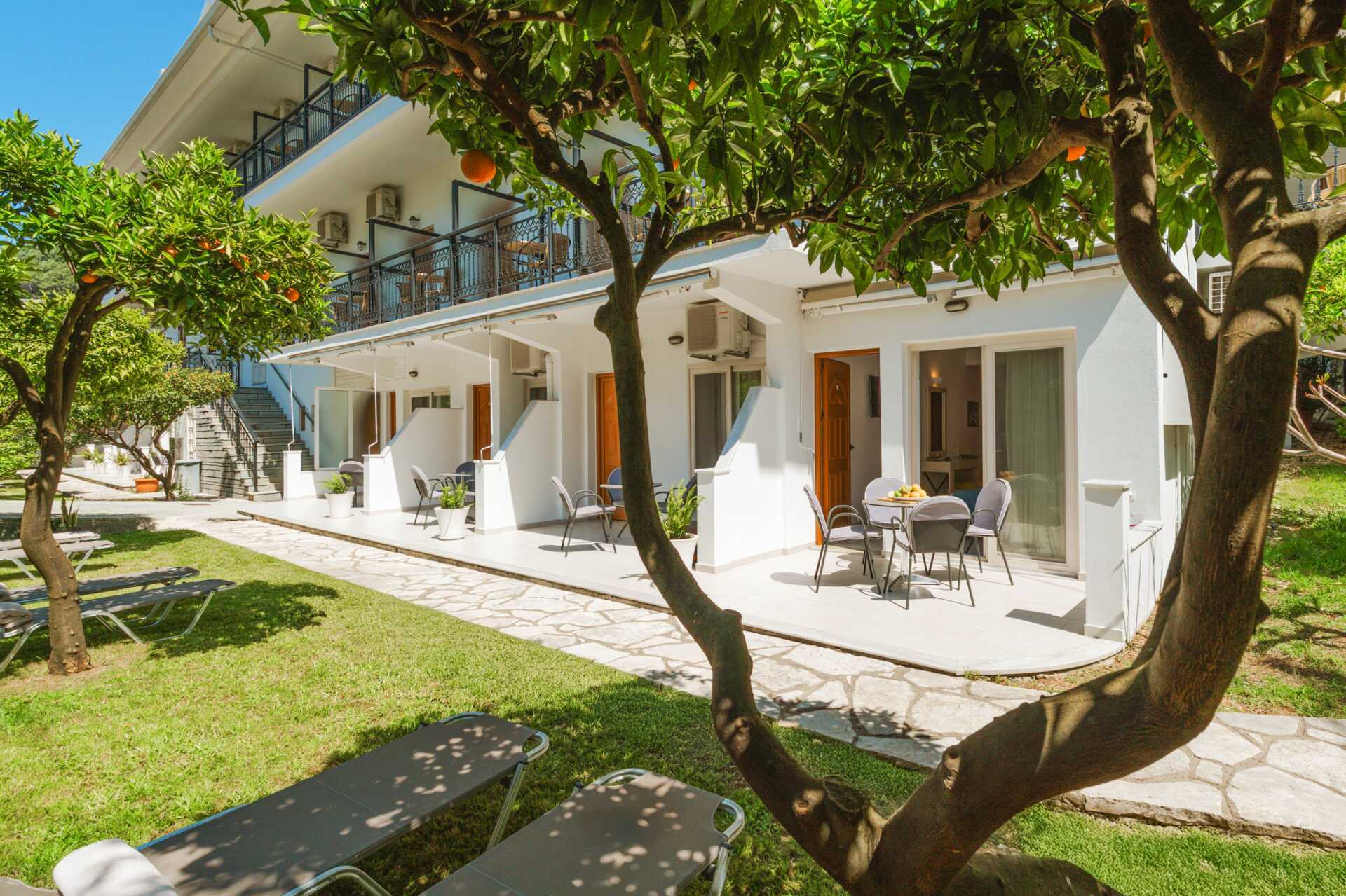 Tvårumslägenhet med markterrass och med utsikt mot trädgården. Ett sovrum med två enkelsängar och ett kombinerat vardagsrum/minikök med ytterligare två enkelsängar. Minikök med kokplattor, kylskåp, vattenkokare, kaffebryggare, brödrost och enkel köksutrustning. Wifi och luftkonditionering ingår. Deponering mot avgift. Tv med internationella kanaler. Hårtork. Badrum med dusch och wc. Städning 7 ggr/vecka.