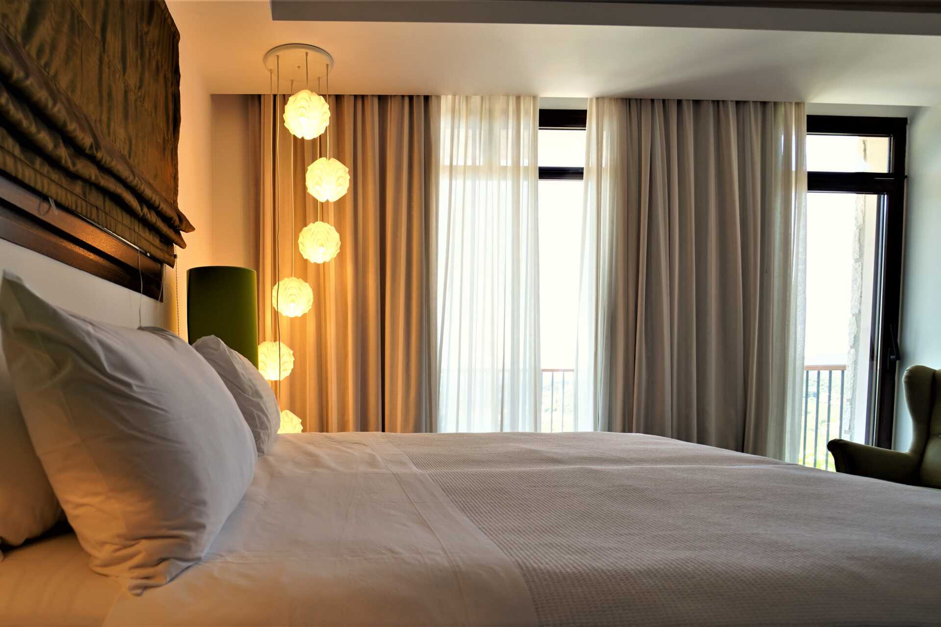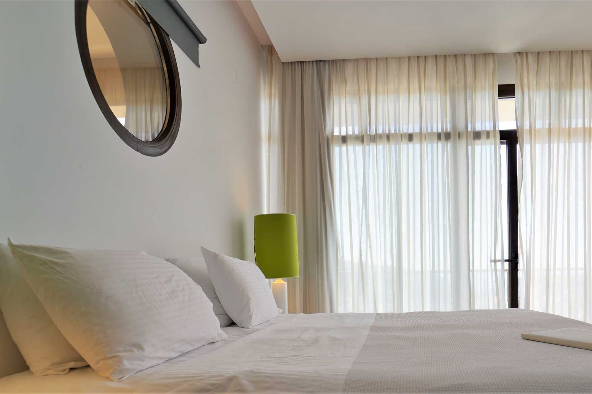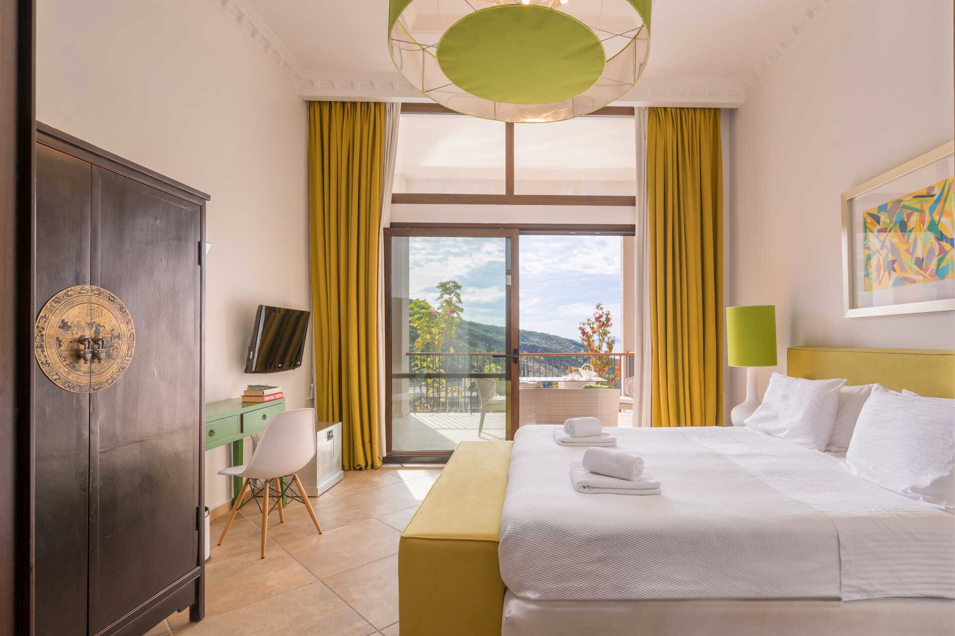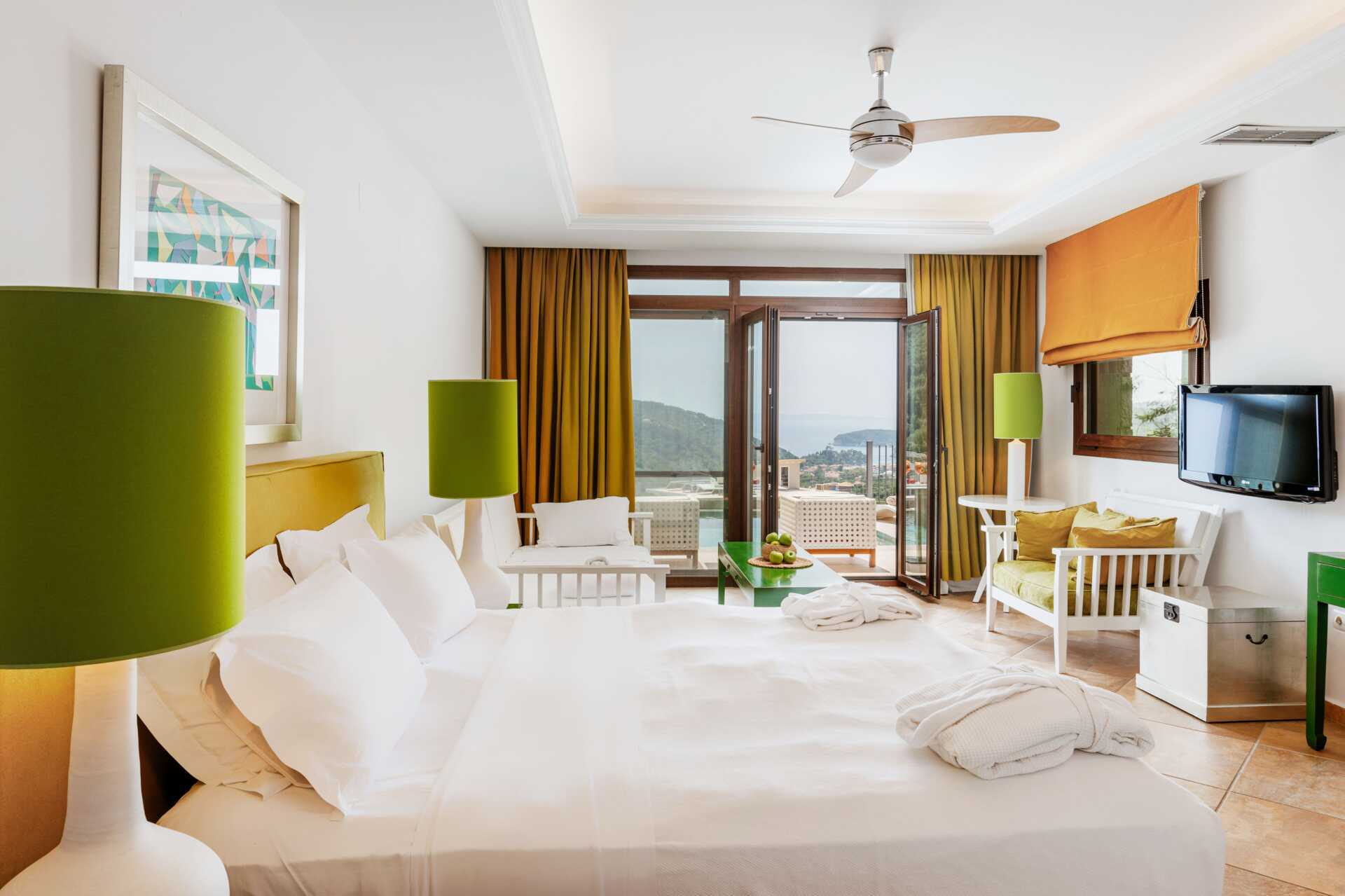 Deluxerum med balkong eller med balkong som vetter mot havet. En dubbelsäng. Möjlighet till extrabädd i bäddsoffa. Wifi, luftkonditionering och deponering ingår. Kylskåp. Vattenkokare. Brödrost. Kaffemaskin. Tv med internationella kanaler. Badrockar och tofflor. Hårtork. Badrum med badkar eller dusch samt wc. Städning 7 ggr/vecka.