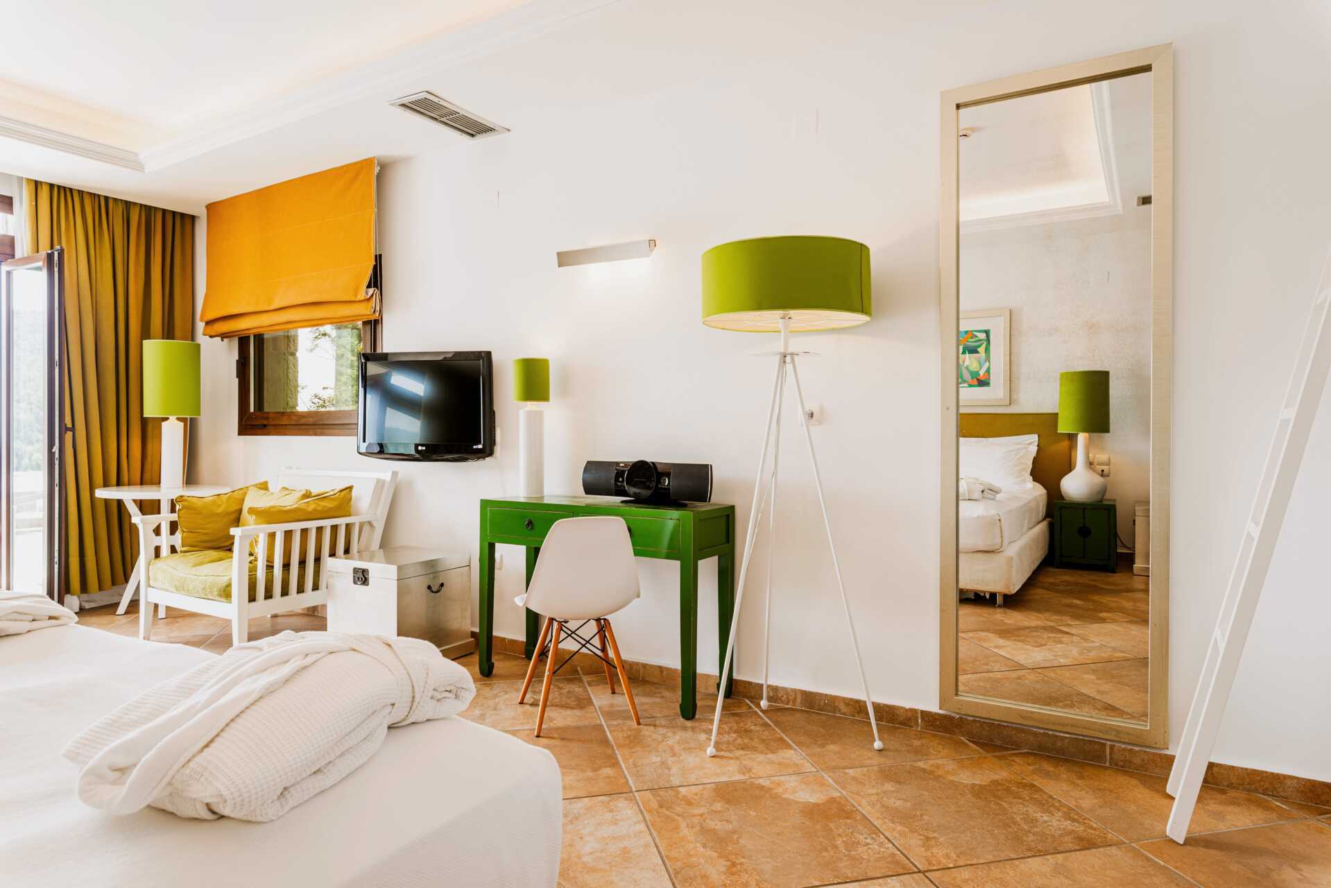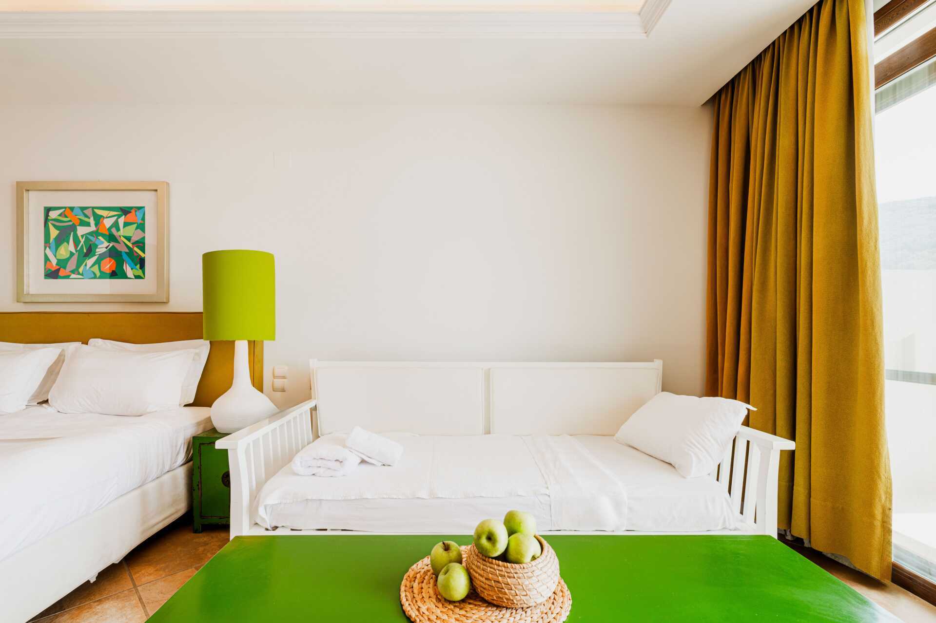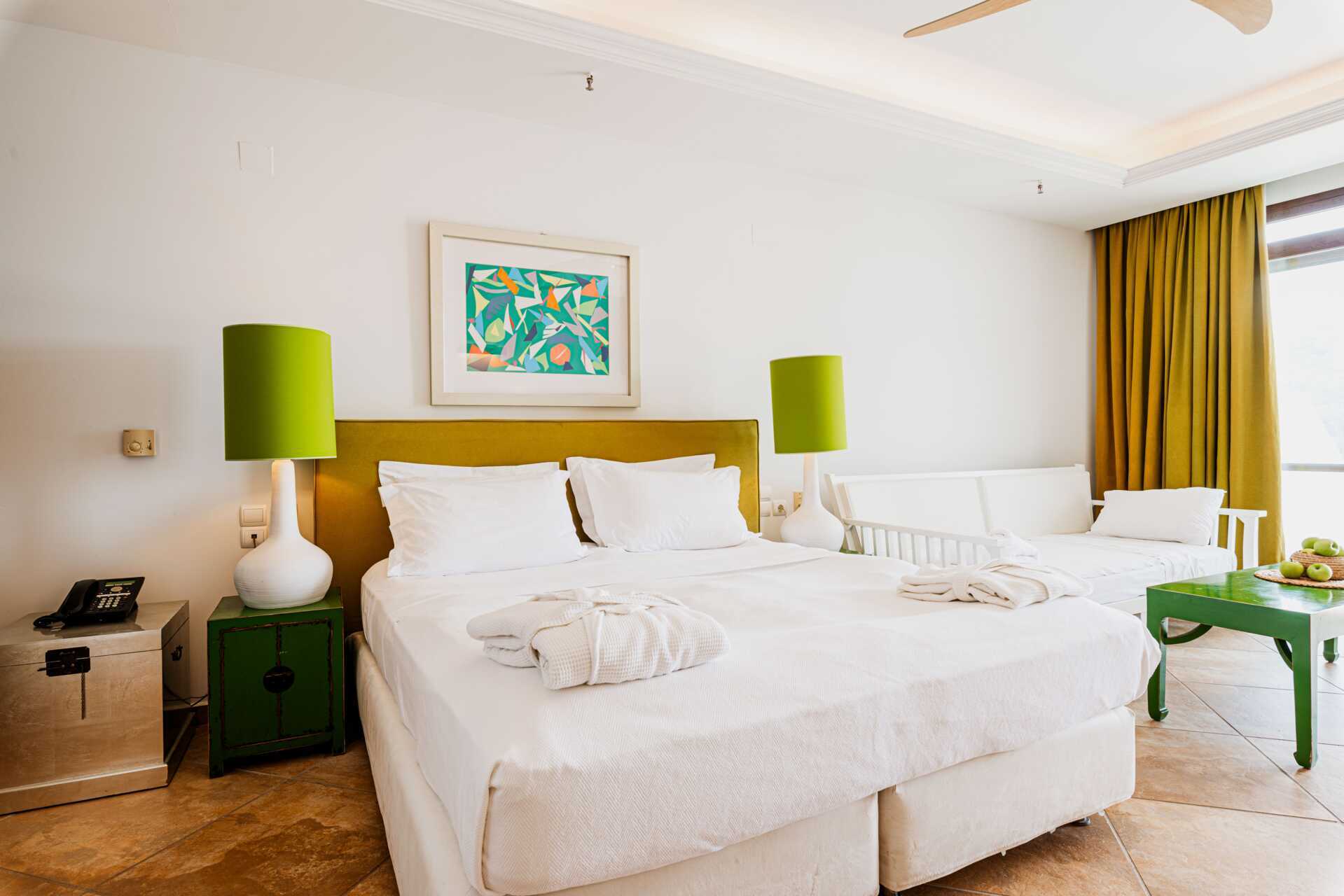 Familjerum med balkong eller terrass. Rummen består av ett sovrum och ett vardagsrum som skiljs åt av skjutdörrar. En dubbelsäng. Möjlighet till extrabädd i bäddsoffa. Wifi, luftkonditionering och deponering ingår. Kylskåp. Vattenkokare. Kaffemaskin. Brödrost. Tv med internationella kanaler. Badrockar och tofflor. Hårtork. Badrum med badkar eller dusch samt wc. Städning 7 ggr/vecka.