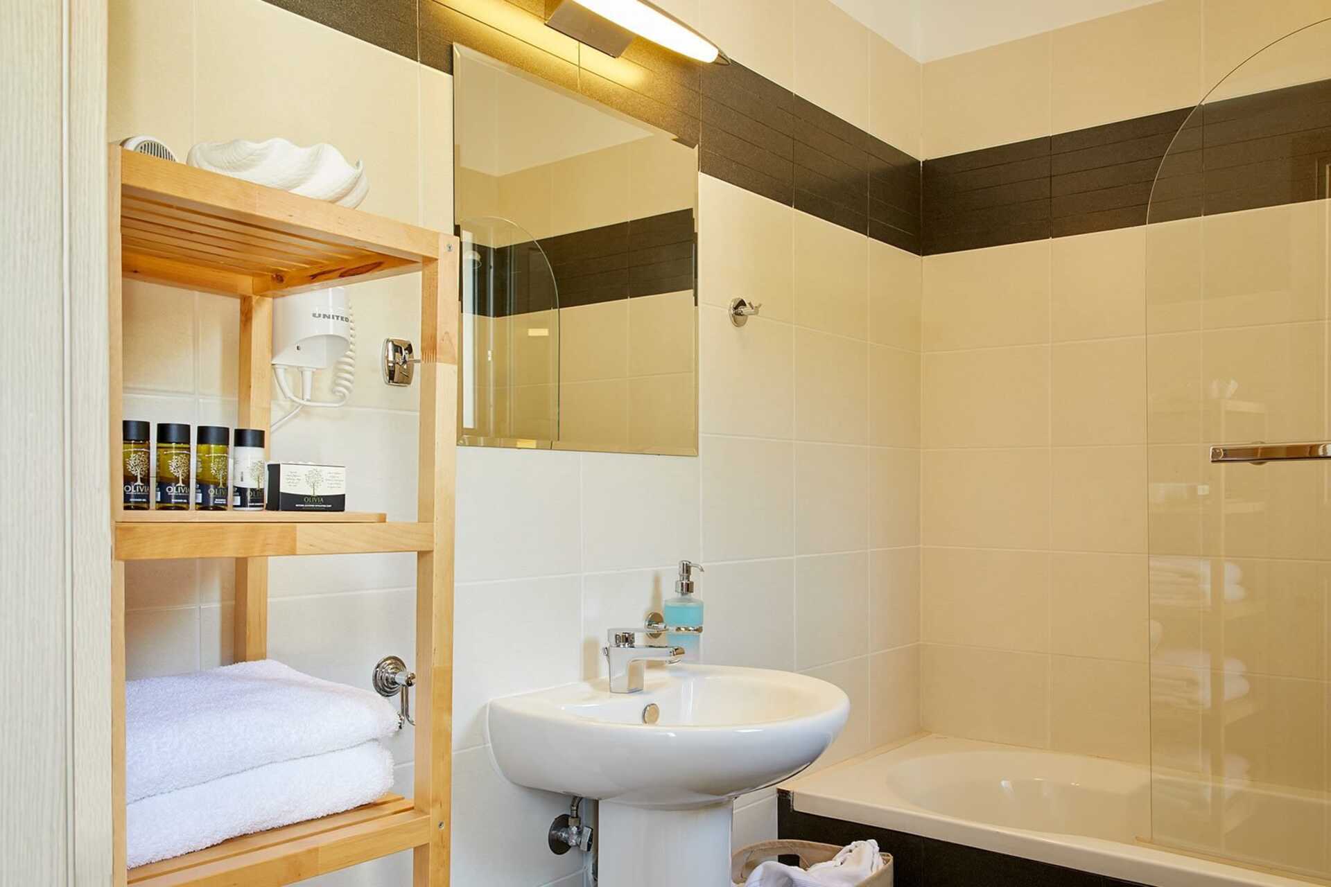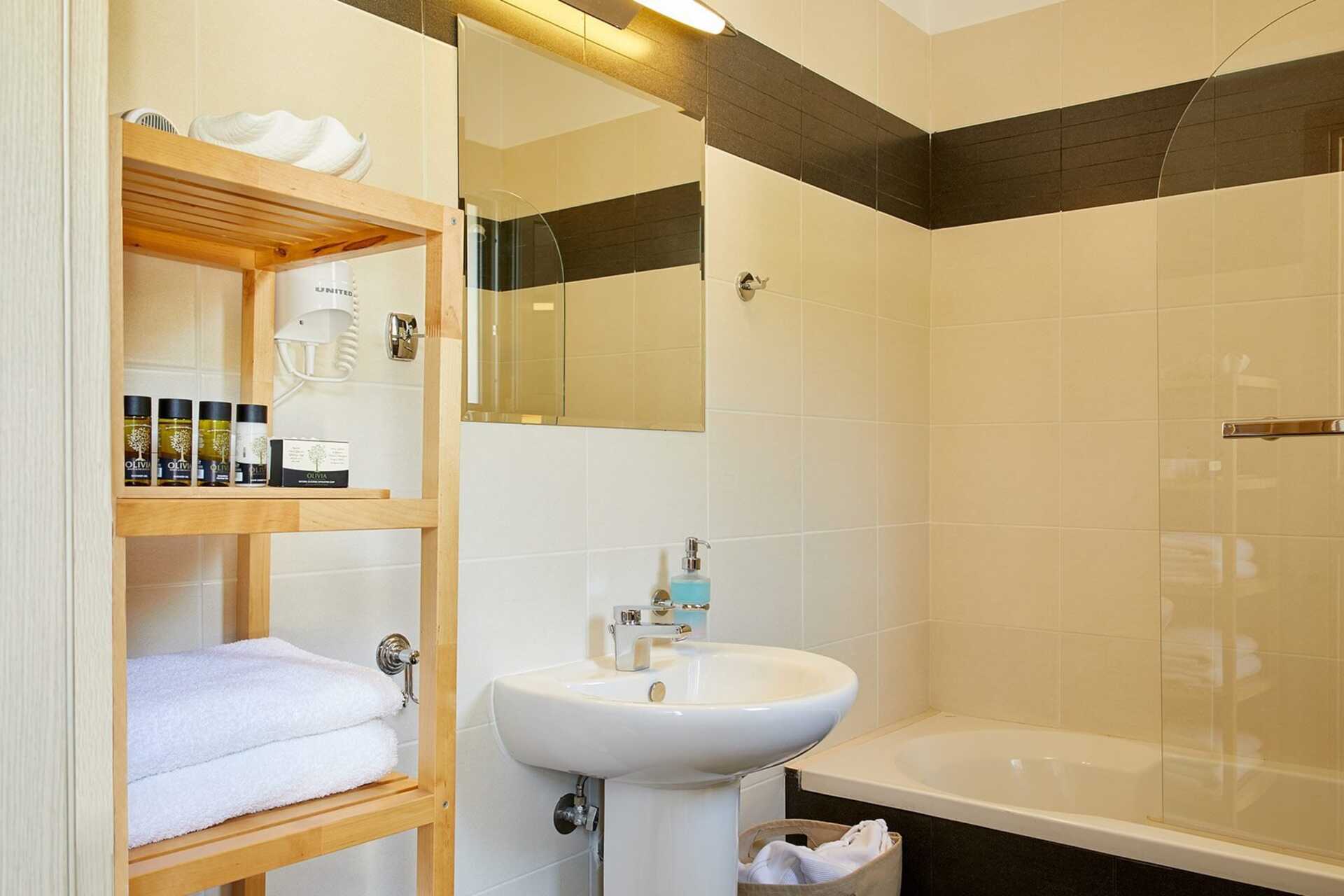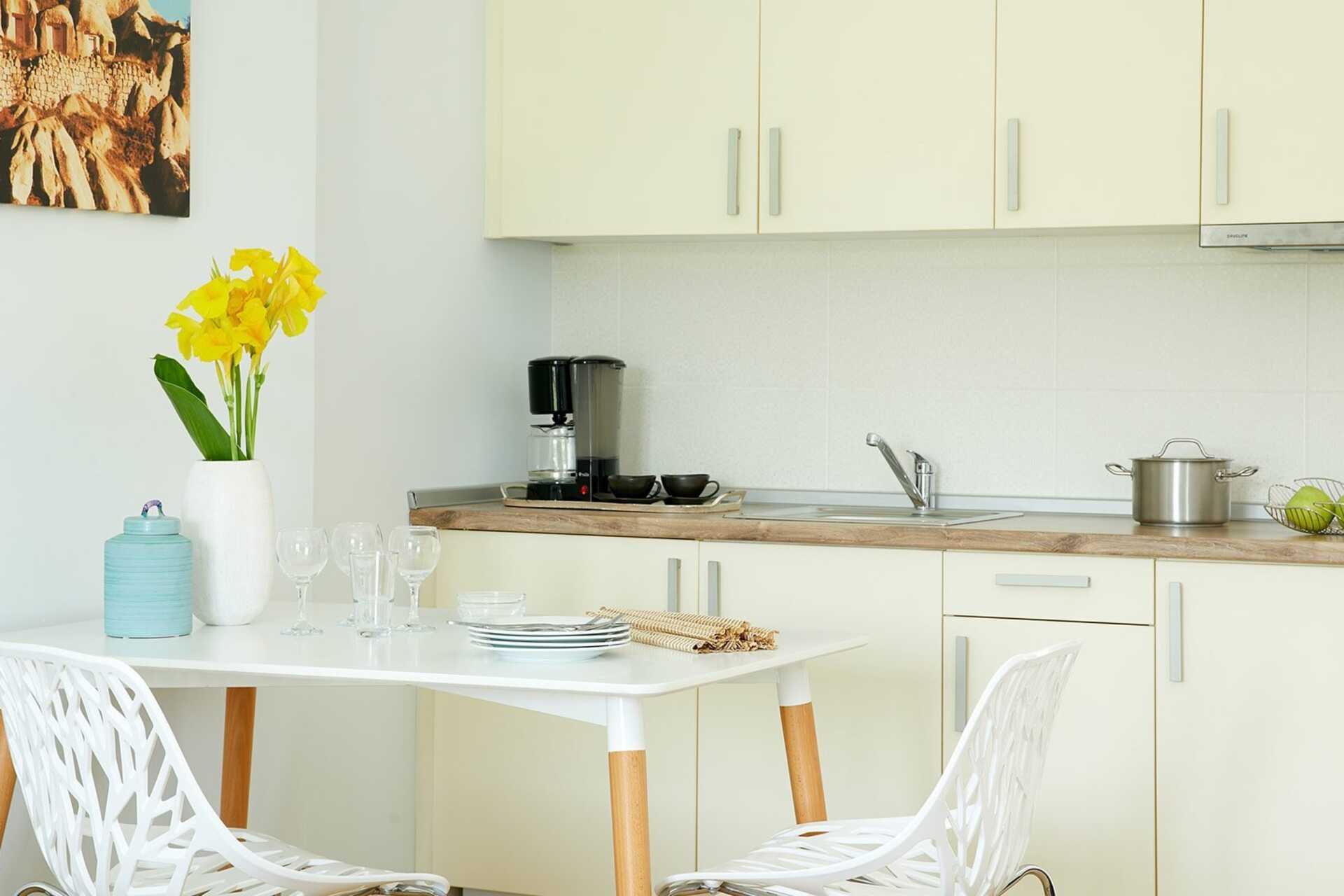 Enrumslägenheter med balkong eller markterrass. Sovrum kombinerat med minikök. Lägenheterna har olika planlösningar. En dubbelsäng eller två enkelsängar. Möjlighet till extrabädd i bäddsoffa. Kuddmeny. Wifi, luftkonditionering och deponering ingår. Minikök med kylskåp, kokplattor, vattenkokare, Nespresso kaffemaskin och enkel köksutrustning. Tv med internationella kanaler. Hårtork. Badrockar och tofflor. Badrum med badkar och wc. Städning 7 ggr/vecka.