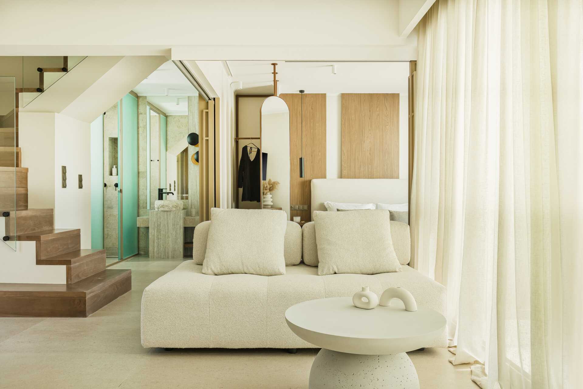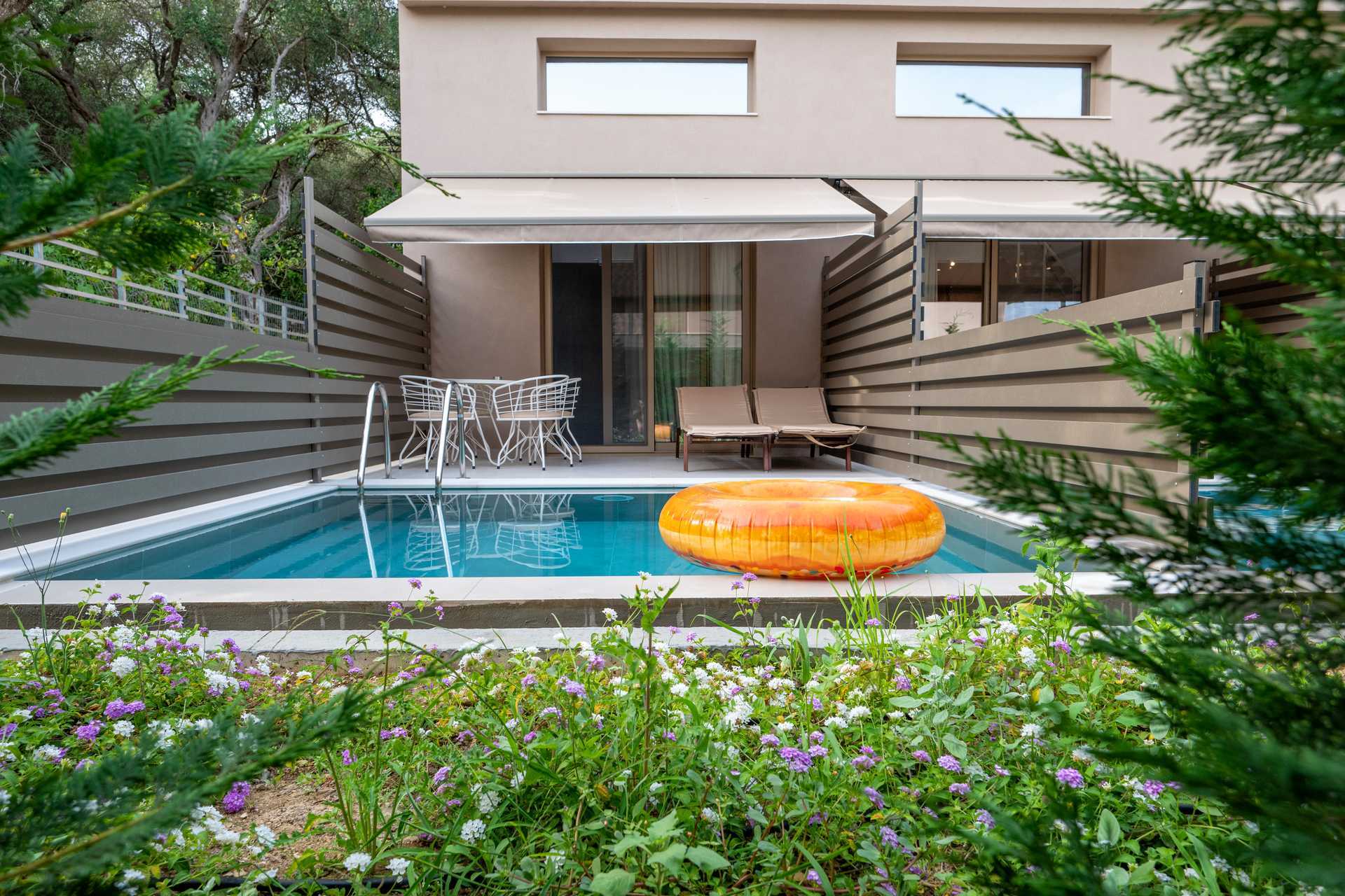 Svit med markterrass, solstolar och privat pool. I entréplan finns en dubbelsäng och ett badrum. En trappa upp finns ett sovloft med ytterligare en dubbelsäng. Wifi, luftkonditionering (på övre plan) och deponering ingår. Kylskåp. Vattenkokare samt kaffe och te. Espressomaskin. Tv med internationella kanaler. Hårtork. Badrum med dusch och wc. Städning 7 ggr/vecka.