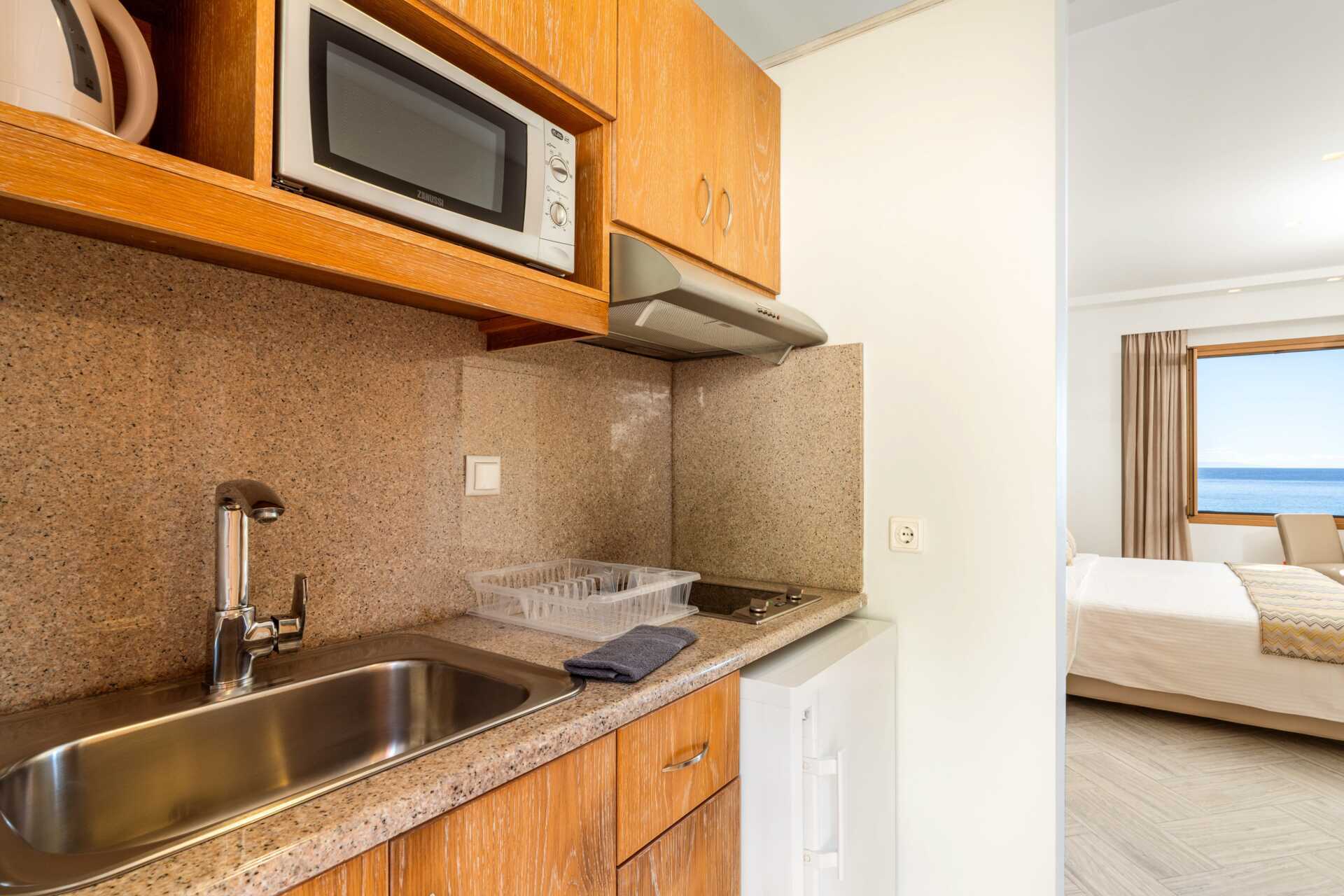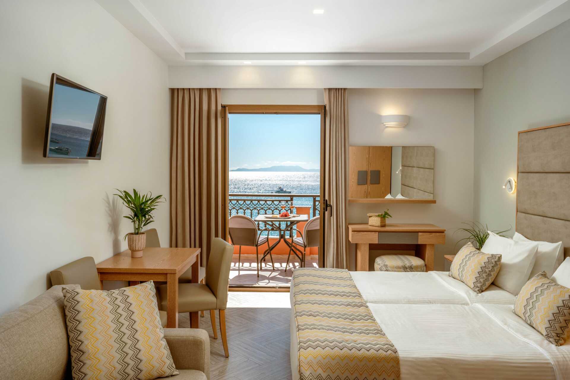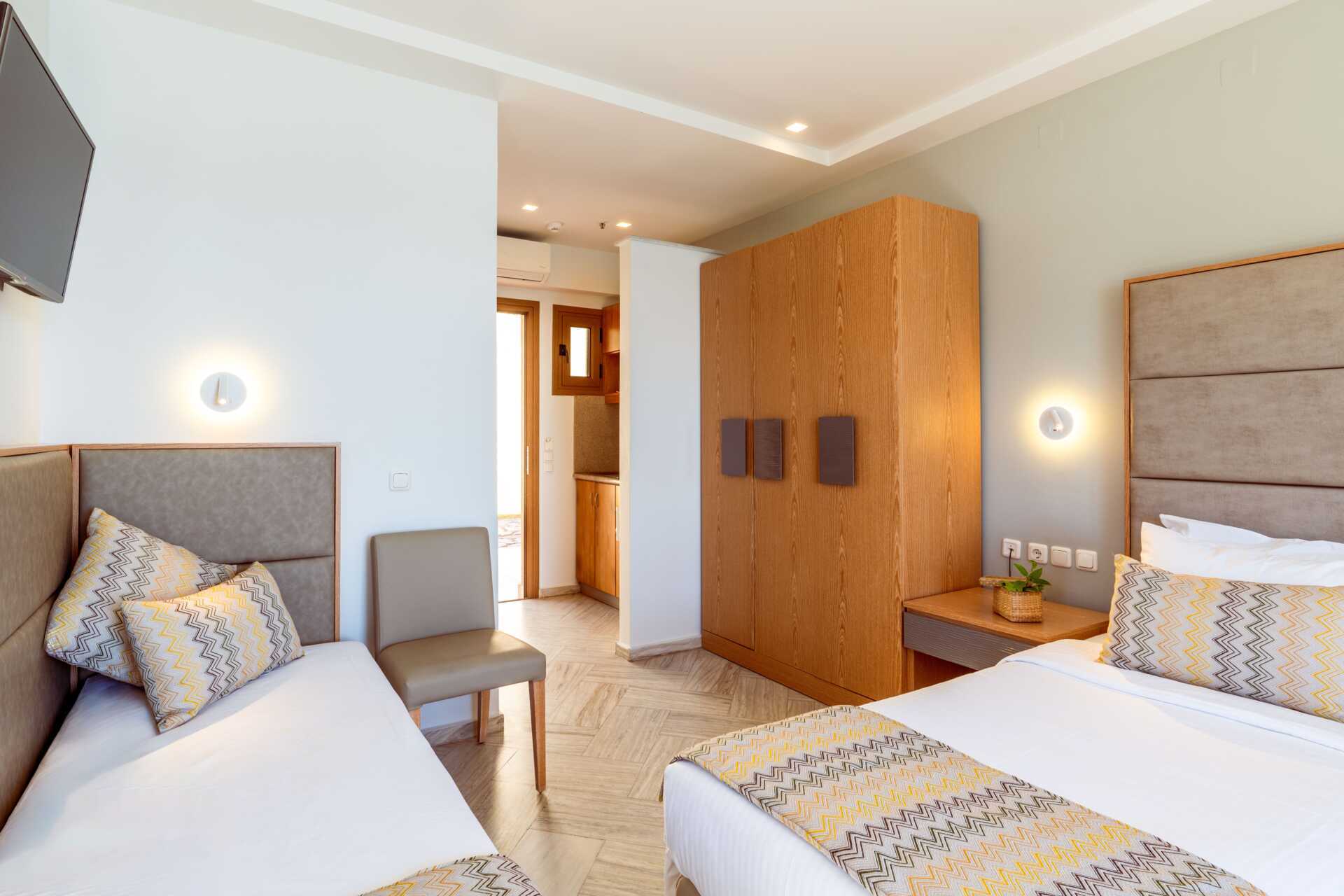 Enrumslägenhet med balkong och havsutsikt. Varierande storlek och med modern inredning. Sovrum med kombinerat minikök. Två enkelsängar. Möjlighet till extrabäddar i bäddsoffa. Minikök med kokplattor, kylskåp, kaffebryggare, vattenkokare, brödrost, mikrovågsugn och enkel köksutrustning. Wifi och luftkonditionering ingår. Deponering mot avgift. Tv med internationella kanaler. Hårtork. Badrum med dusch och wc. Städning 6 ggr/vecka.