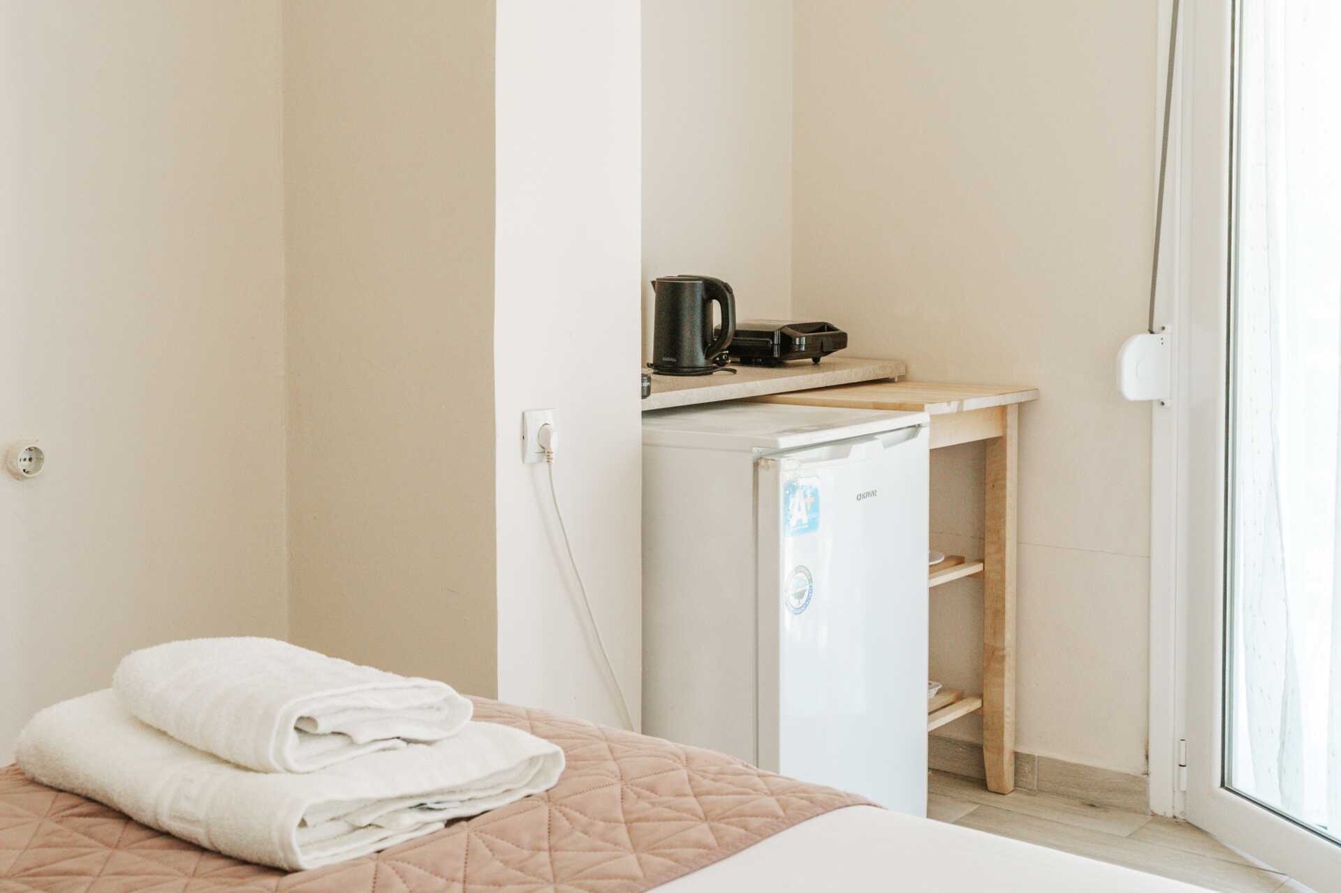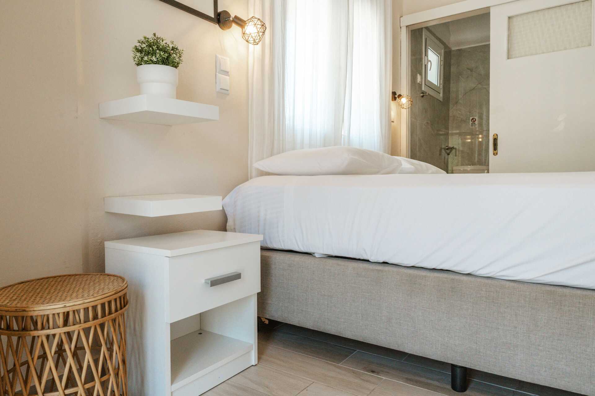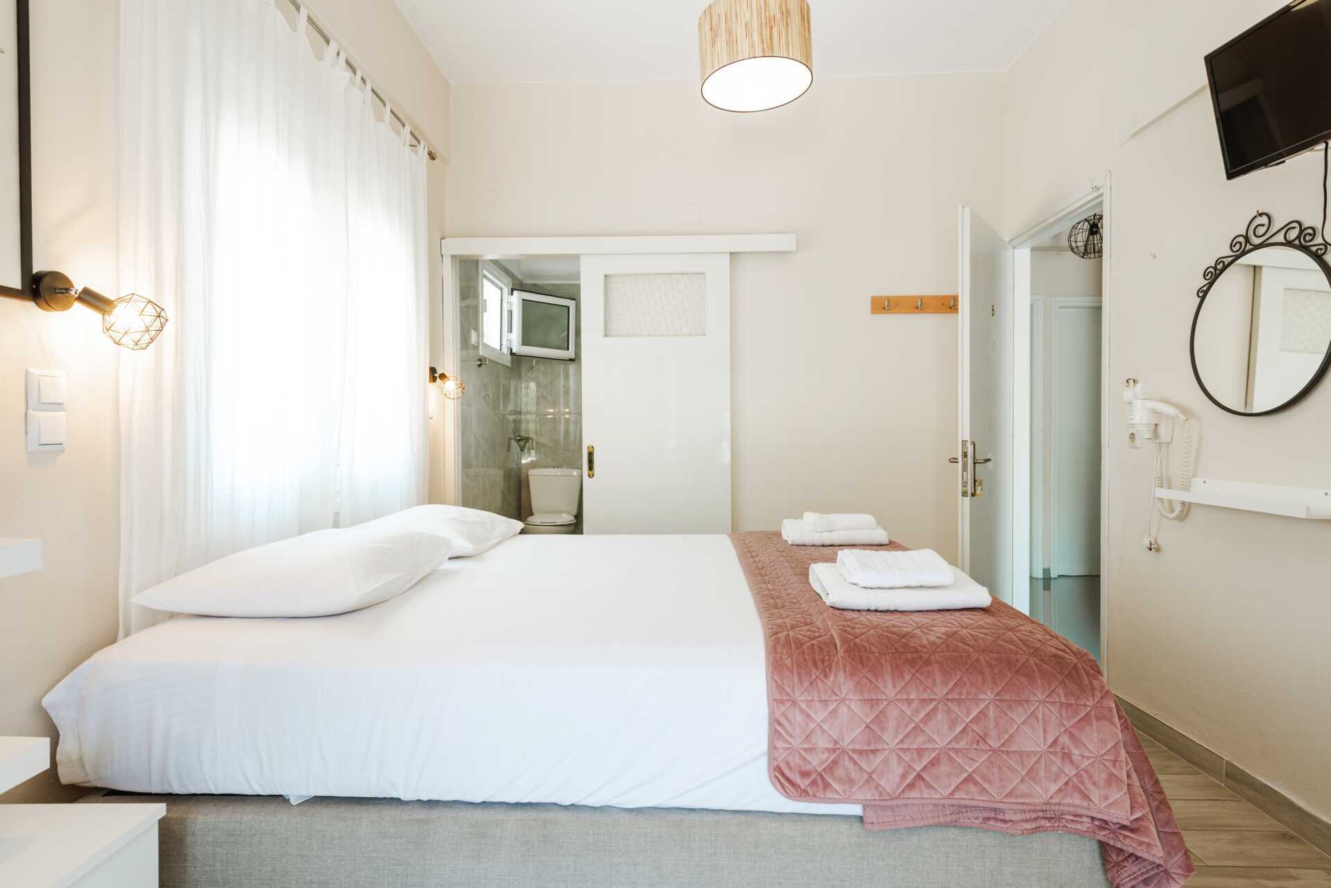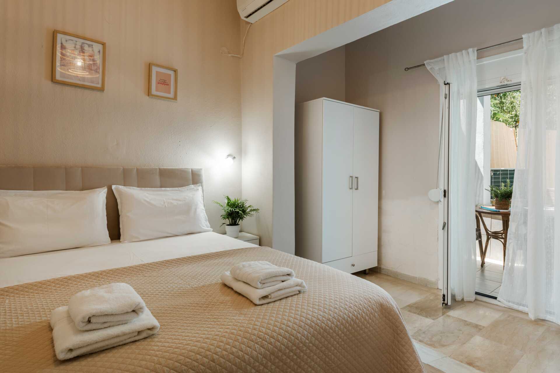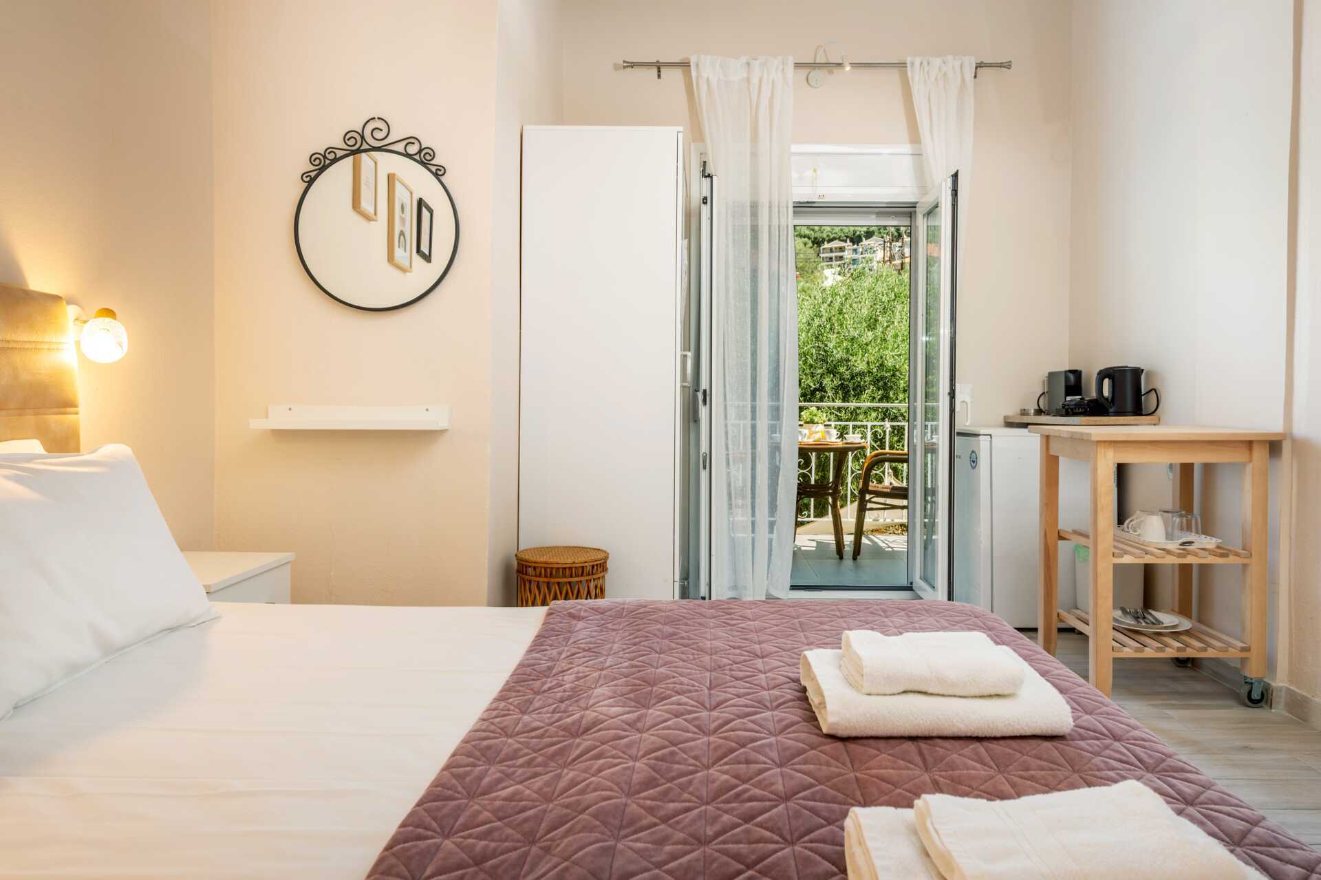 Dubbelrum med balkong.En dubbelsäng eller två enkelsängar. Wifi, luftkonditionering och deponering ingår. Kylskåp, vattenkokare, kaffebryggare och brödrost. Tv med internationella kanaler. Hårtork. Badrum med dusch och wc. Städning 6 ggr/vecka.