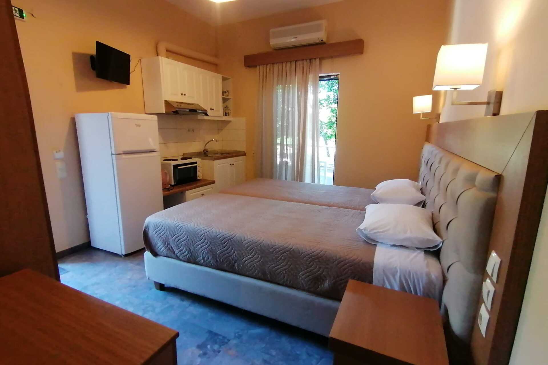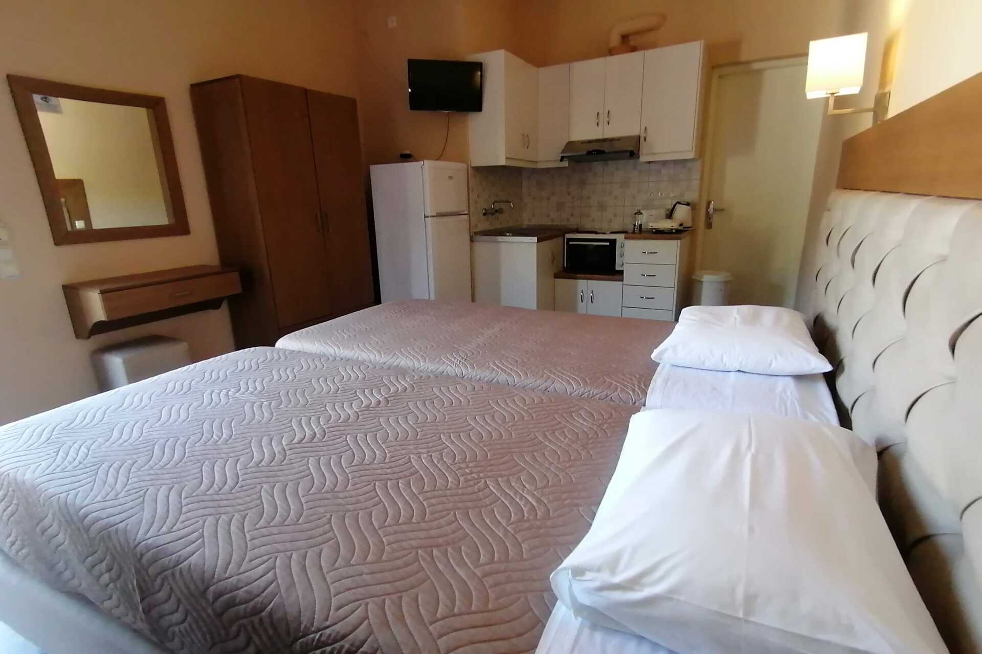 Enrumslägenhet med balkong. Sovrum kombinerat med minikök. En dubbelsäng eller två enkelsängar. Möjlighet till extrabädd i bäddsoffa. Minikök med kokplattor, kylskåp med frys, brödrost, smörgåsgrill, vattenkokare och enkel köksutrustning. Wifi och deponering ingår. Luftkonditionering mot avgift. Tv med lokala kanaler. Hårtork. Badrum med dusch och wc. Städning 5 ggr/vecka.