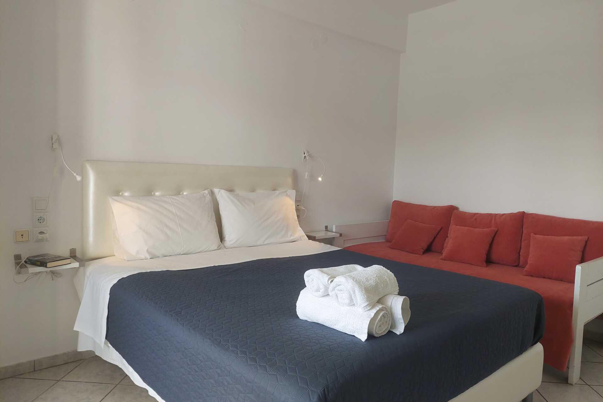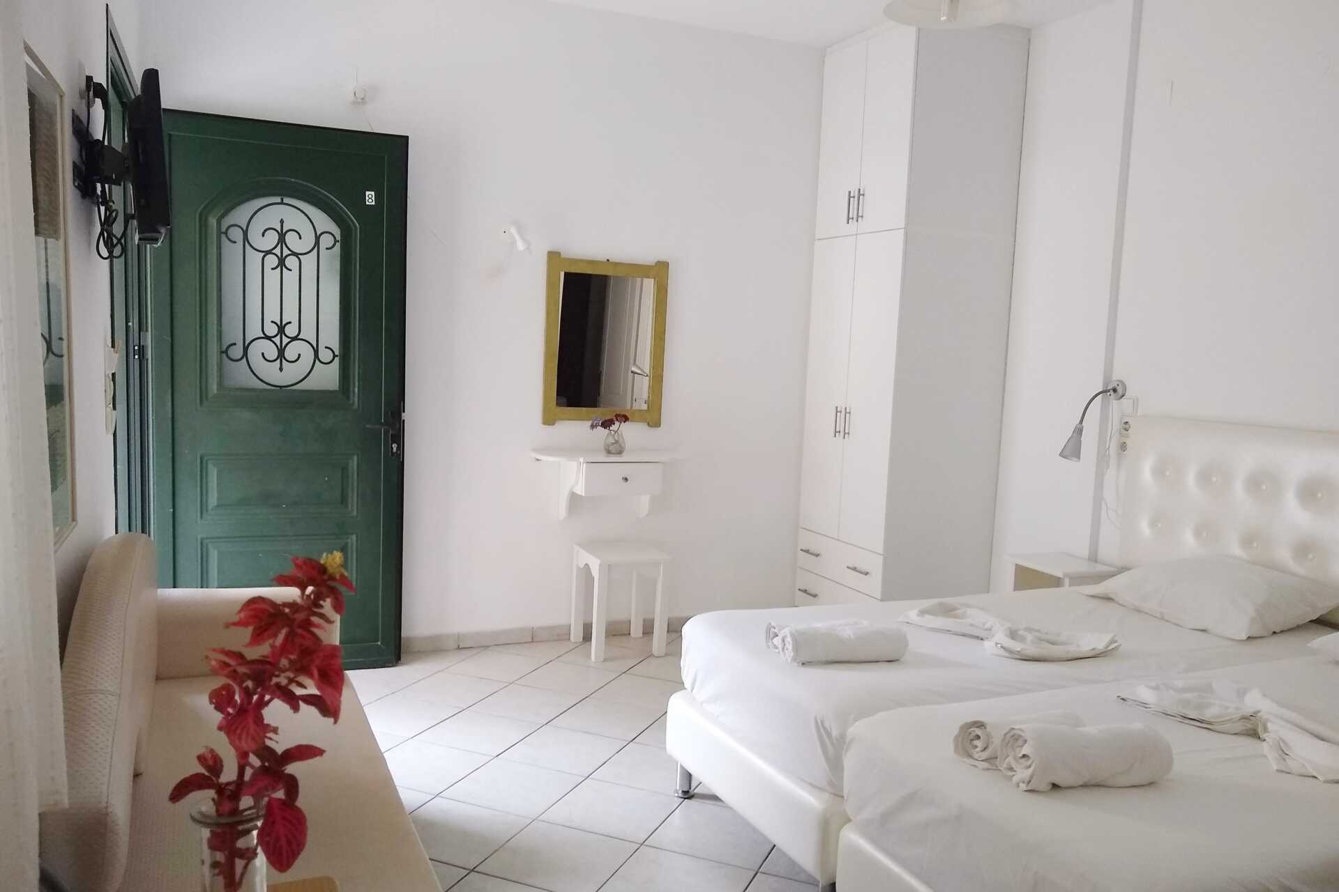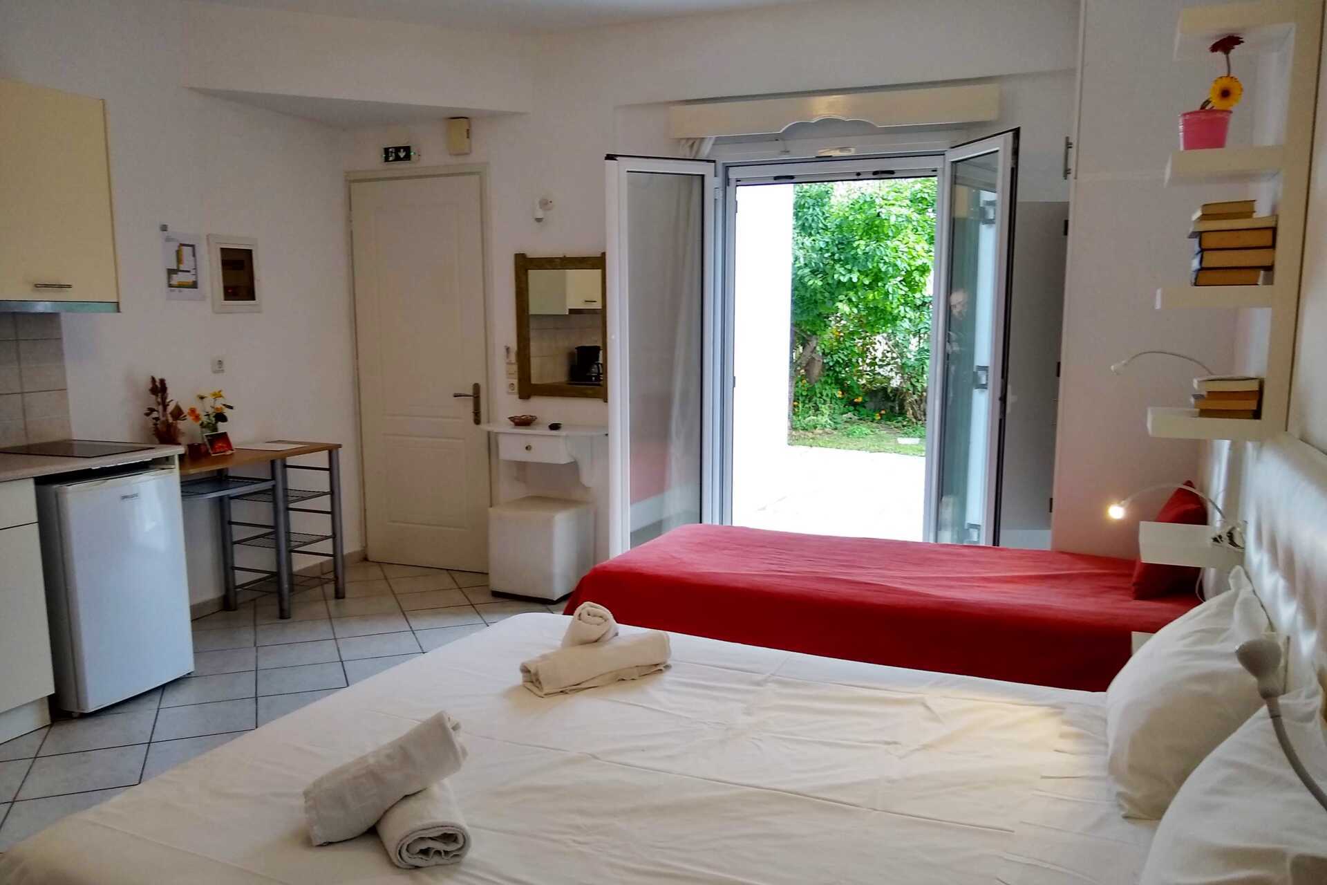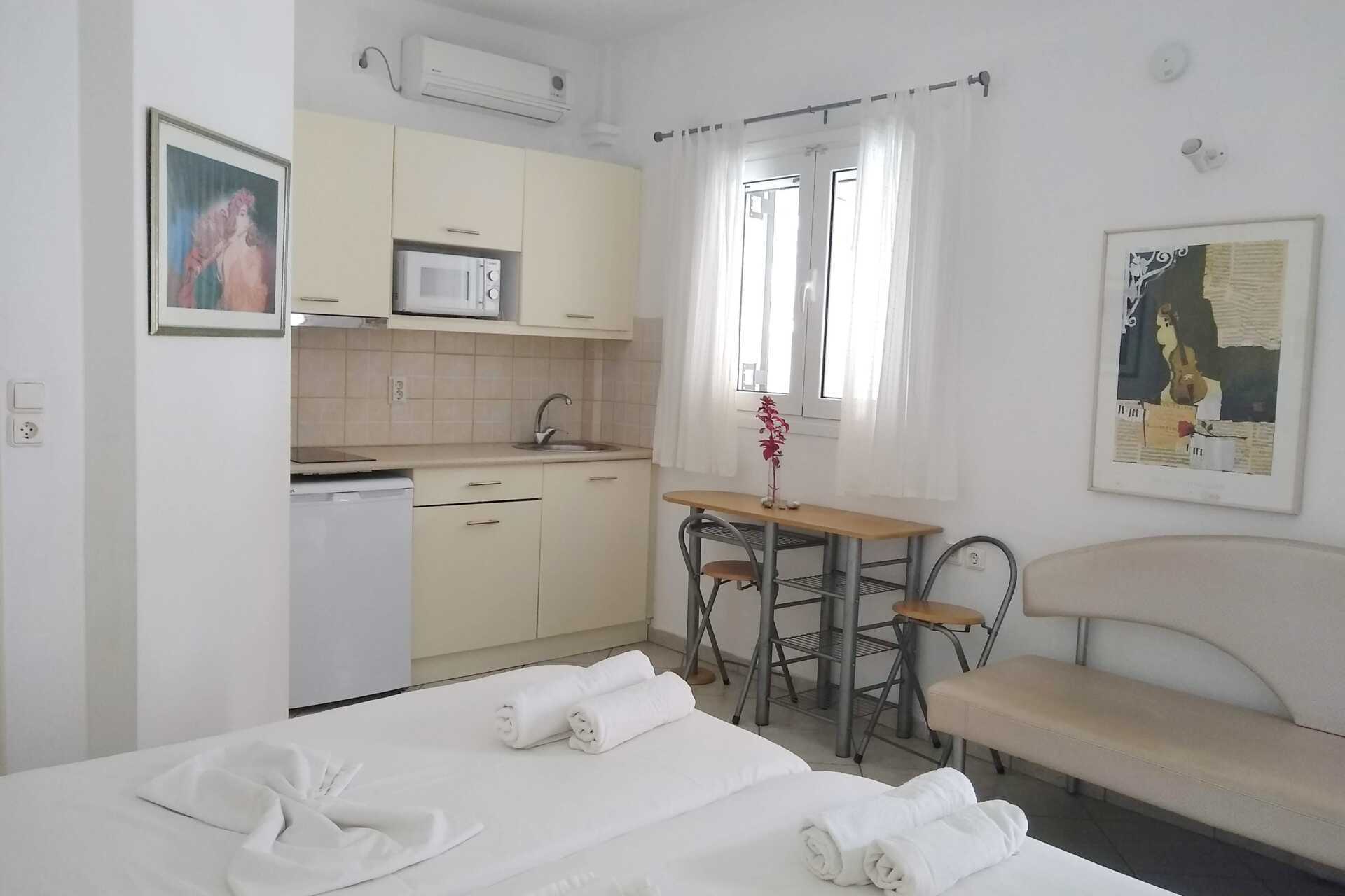 Enrumslägenhet med balkong eller markterrass. Kombinerat sovrum med minikök. En dubbelsäng eller två enkelsängar. Möjlighet till extrabädd i enkelsäng. Minikök med kokplattor, ugn eller mikrovågsugn, kylskåp och enkel köksutrustning. Wifi ingår. Luftkonditionering och deponering mot avgift. Tv med internationella kanaler. Badrum med dusch och wc. Städning 6 ggr/vecka. Barn under två är räknas in i maxantalet personer i lägenheten.