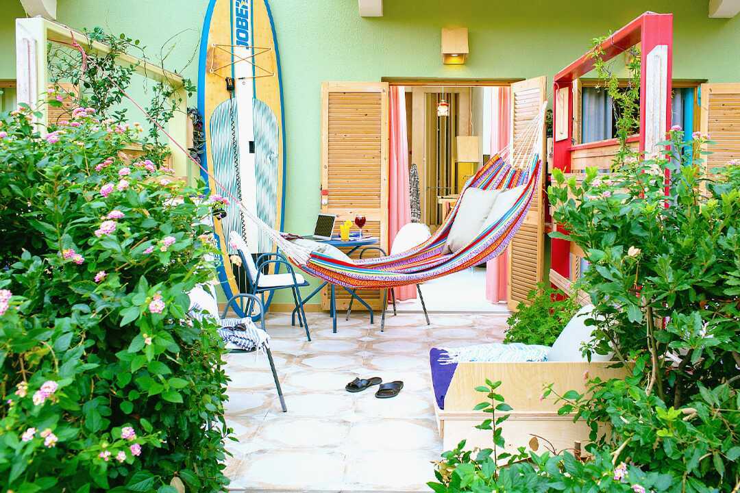 På Villa Rossa Area Boutique Beach Resort, som välkomna gäster över 12 år, värnar familjen om både gästen och miljön. I den renovering som genomfördes för något år sedan har återvunnet material använts och inredningen är en blandning av lokalt hantverk och vintagedetaljer. Varje rum är unikt inrett och en charmig detalj är hur hotellets tre byggnader formar den grekiska bokstaven π (pi).