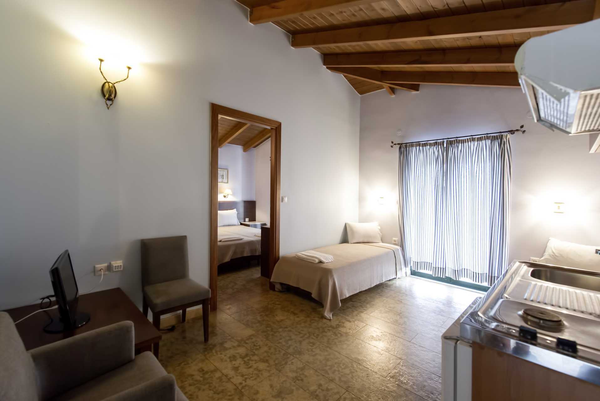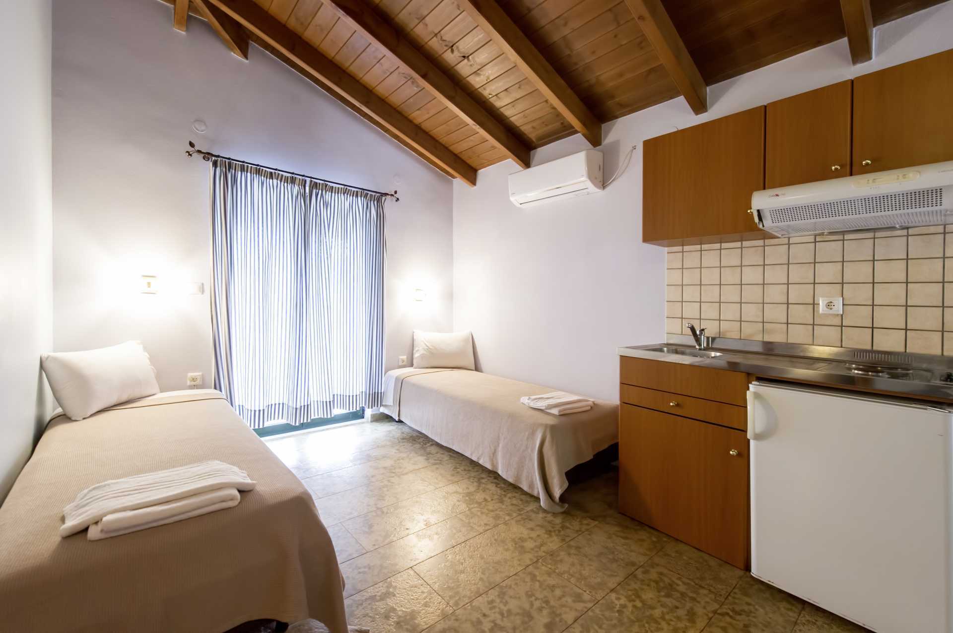 Enrumslägenhet med balkong eller markterrass. Kombinerat sovrum med minikök, vissa lägenheter är riktigt små. En dubbelsäng eller två enkelsängar. Minikök med kokplattor, kylskåp, vattenkokare och enkel köksutrustning. Wifi och luftkonditionering ingår. Deponering mot avgift. Litet badrum med dusch och wc. Städning 5 ggr/vecka.