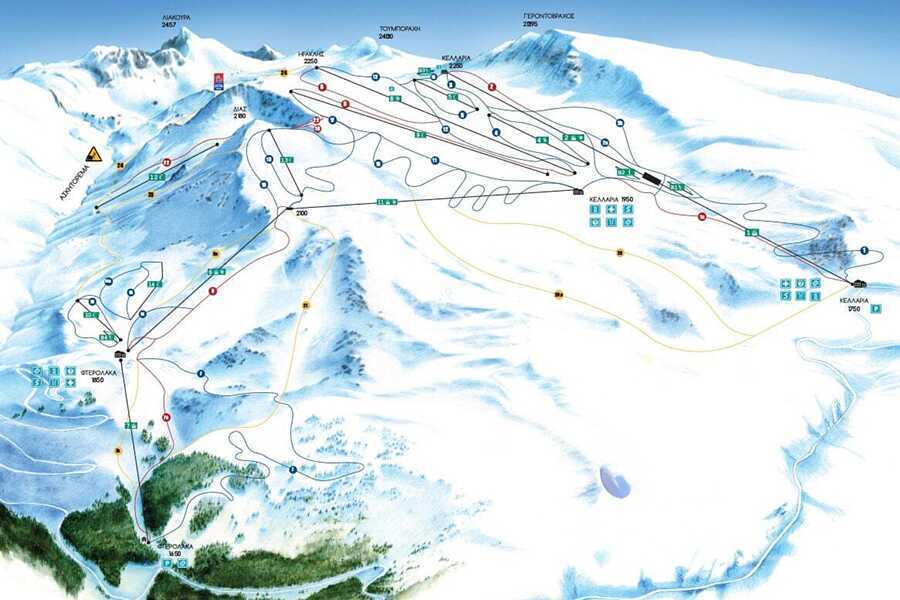 Skidområdet passar bäst för nybörjare till medelduktiga åkare med huvuddelen blå backar (72%) och även inslag av röda backar (28%). Vissa röda backar är rejält branta och populära bland avancerade skidåkare. Totalt finns 17 liftar på orten, med 13 moderna liftar och 4 släpliftar som passar bra för barn och nybörjare. År 2014 genomfördes den första fasen av moderniseringen av orten Kellaria. Med utbyggnaden av liftarna "Aphrodite-Bacchus" som inkluderar en 8-sitsig kabin. "Aphrodite", en 6-sitsig stollift och en 8-sitsig kabin "Bacchus". Liftarna är anslutna vid mellanstationen i Kellaria 1950, kan drivas tillsammans eller oberoende av varandra. I december 2015 slutfördes den andra fasen av moderniseringen av orten, denna gång i Fterolakas. De gamla liftarna "Ira 7", "Iniochos 6" och den förbindande "Hermes" ersattes med nya moderna liftar.