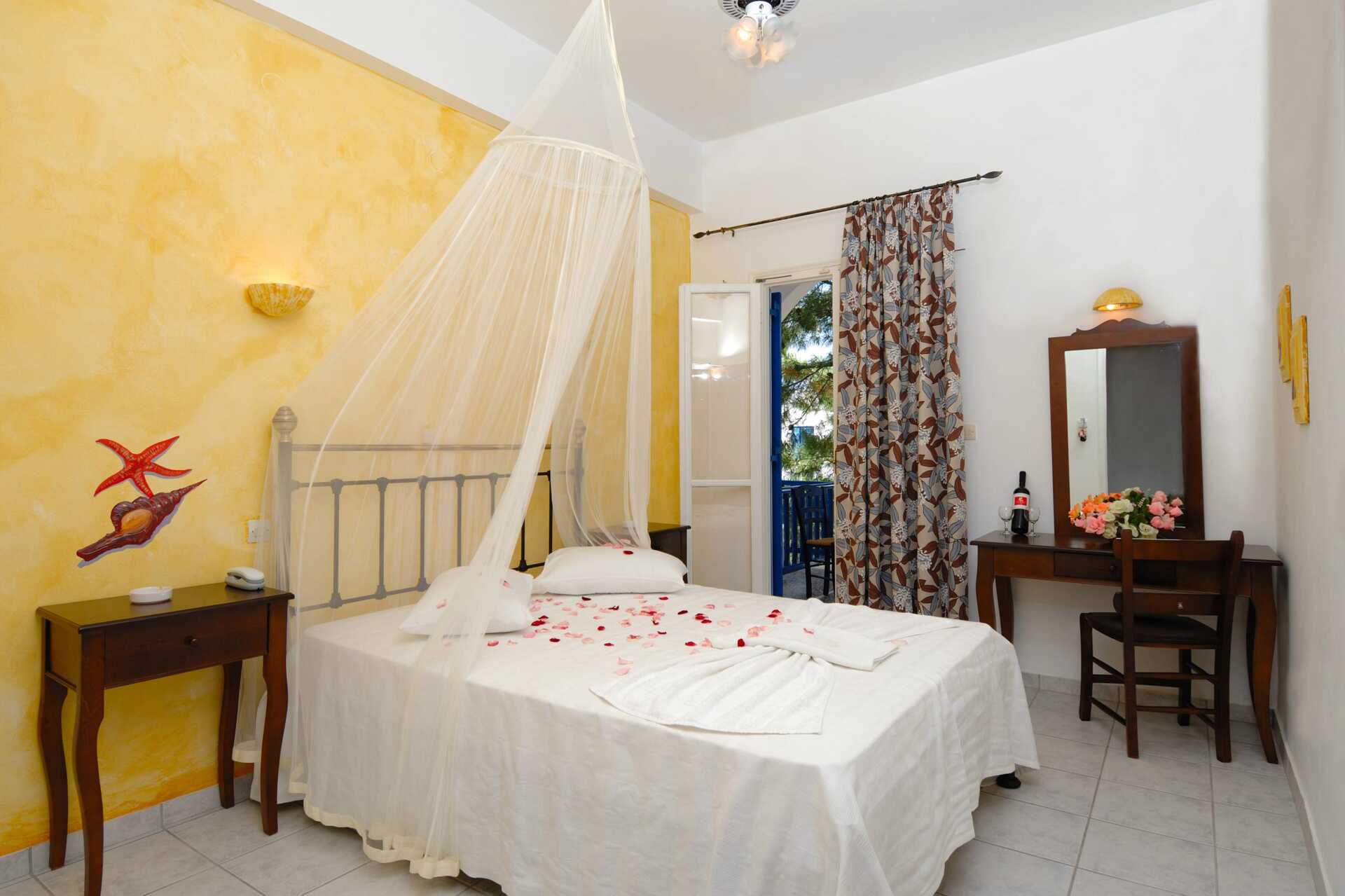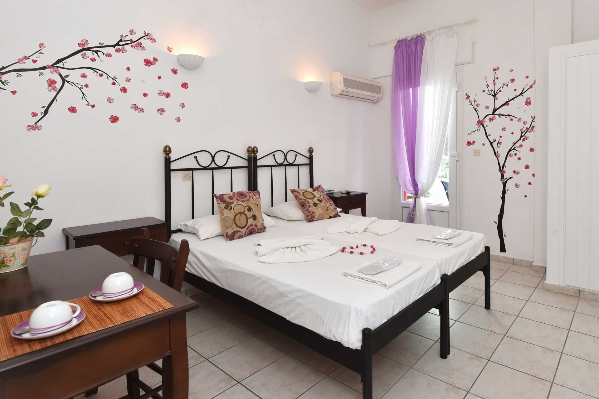 Dubbelrum med balkong eller terrass. En dubbelsäng eller två enkelsängar. Wifi och luftkonditionering ingår. Kylskåp. Vattenkokare. Tv med internationella kanaler. Hårtork. Badrum med dusch och wc. Städning 7 ggr/vecka.