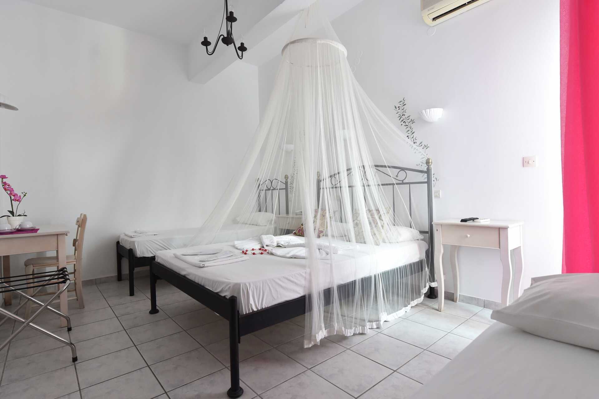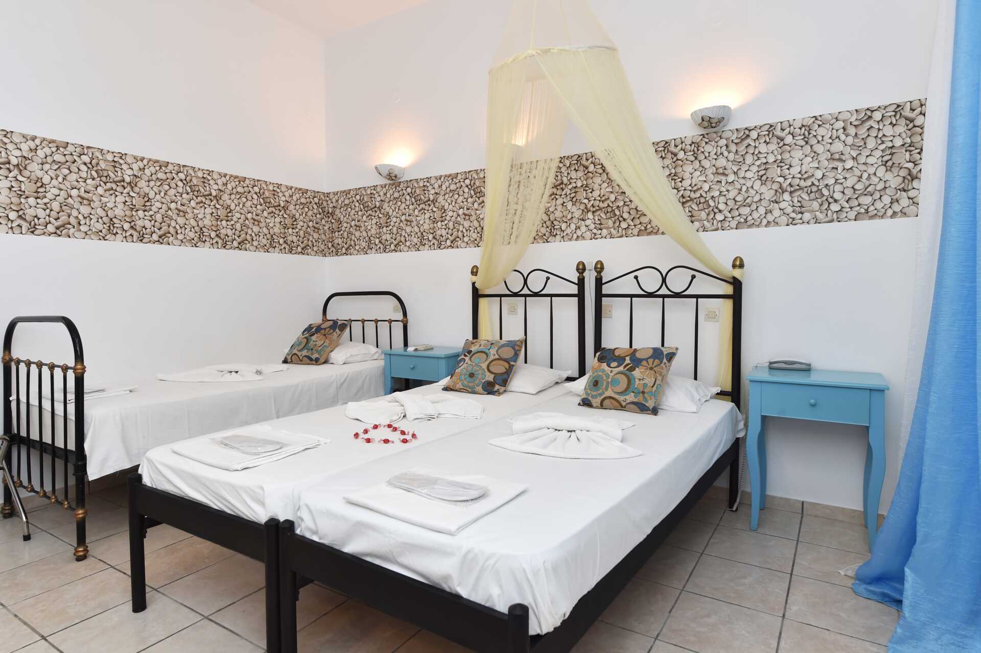 Trippelrum med balkong eller terrass. En dubbelsäng och en enkelsäng eller tre enkelsängar. Wifi och luftkonditionering ingår. Kylskåp. Vattenkokare. Tv med internationella kanaler. Hårtork. Badrum med dusch och wc. Städning 7 ggr/vecka.