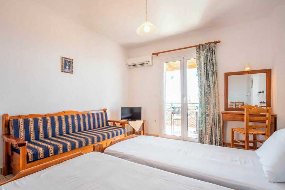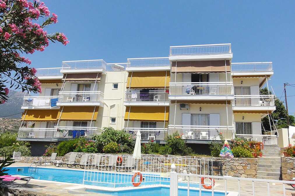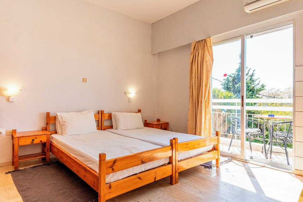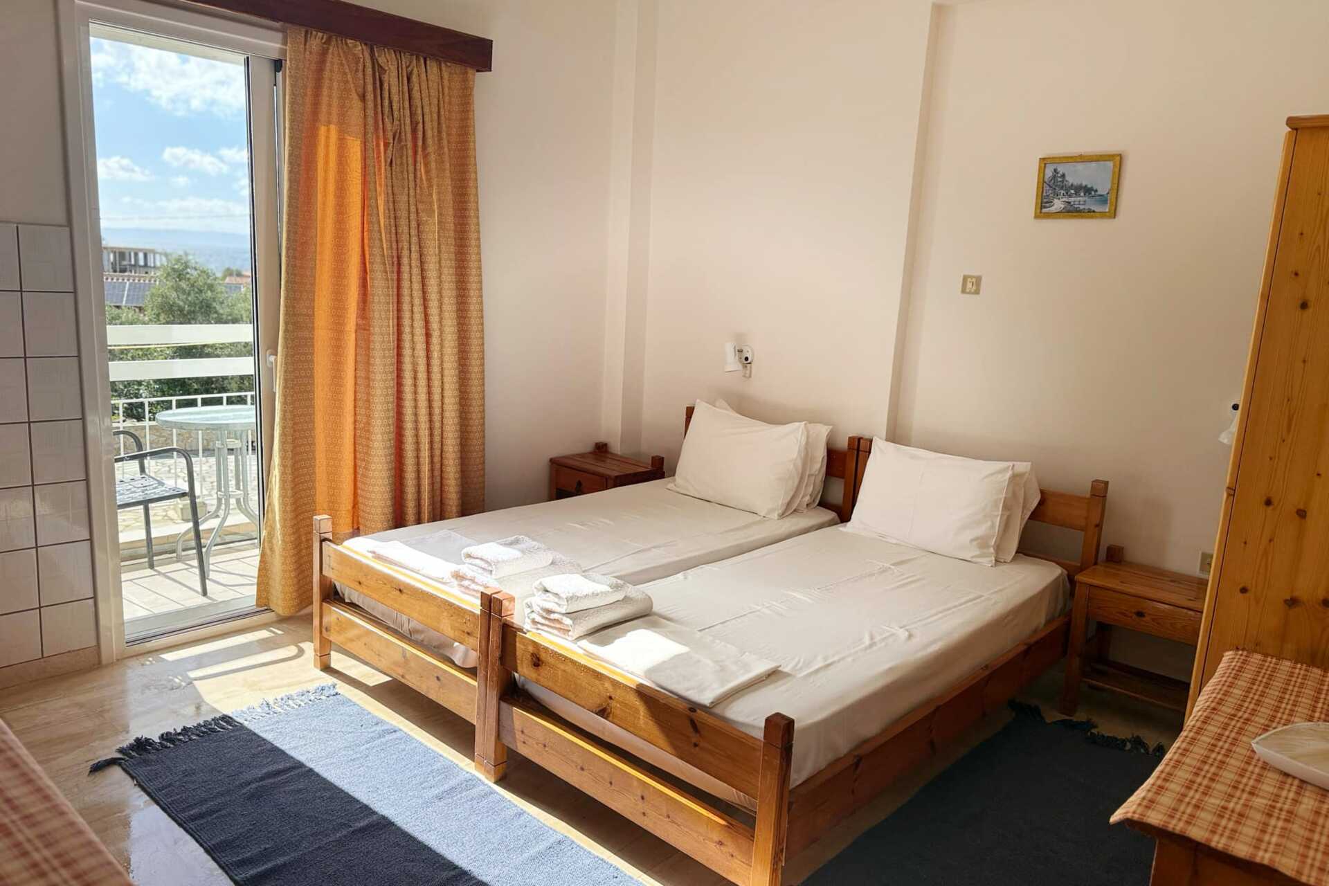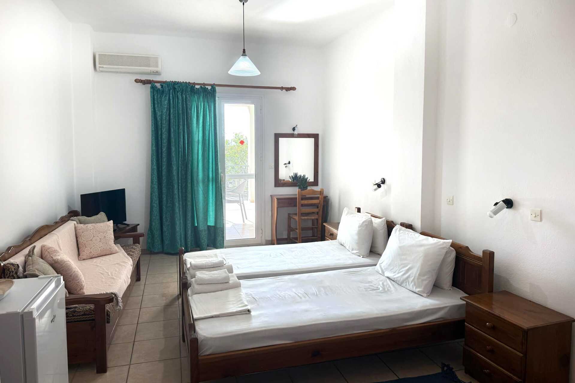 Enrumslägenhet med balkong eller terrass. Vardagsrum med minikök. Två enkelsängar. Minikök med kokplattor, kylskåp, vattenkokare, kaffemaskin, brödrost samt enkel köksutrustning. Wifi och luftkonditionering ingår. Badrum med dusch och wc. Städning 5 ggr/vecka
