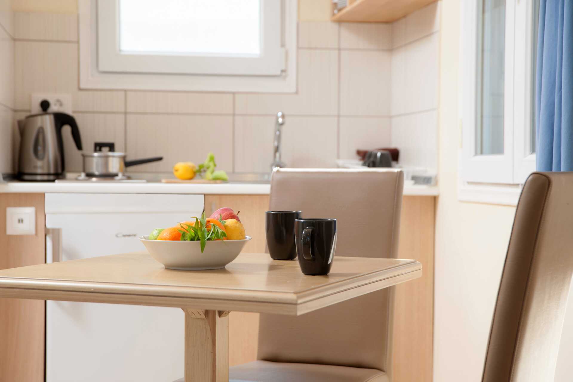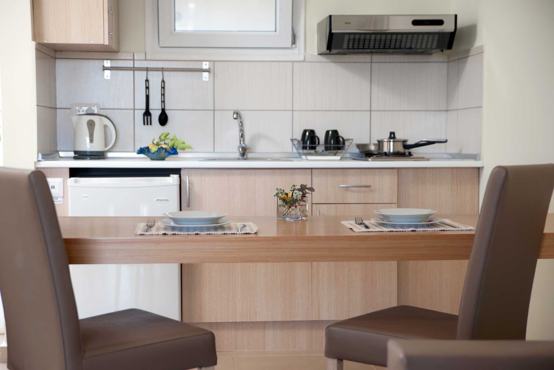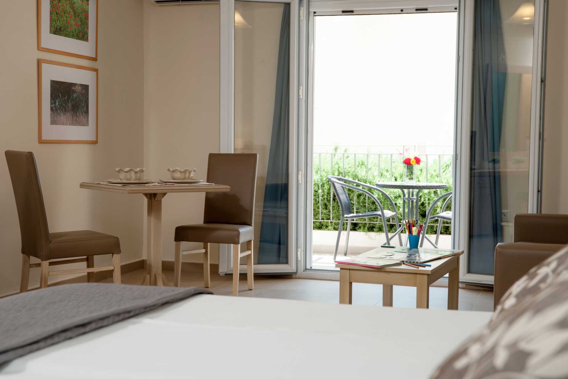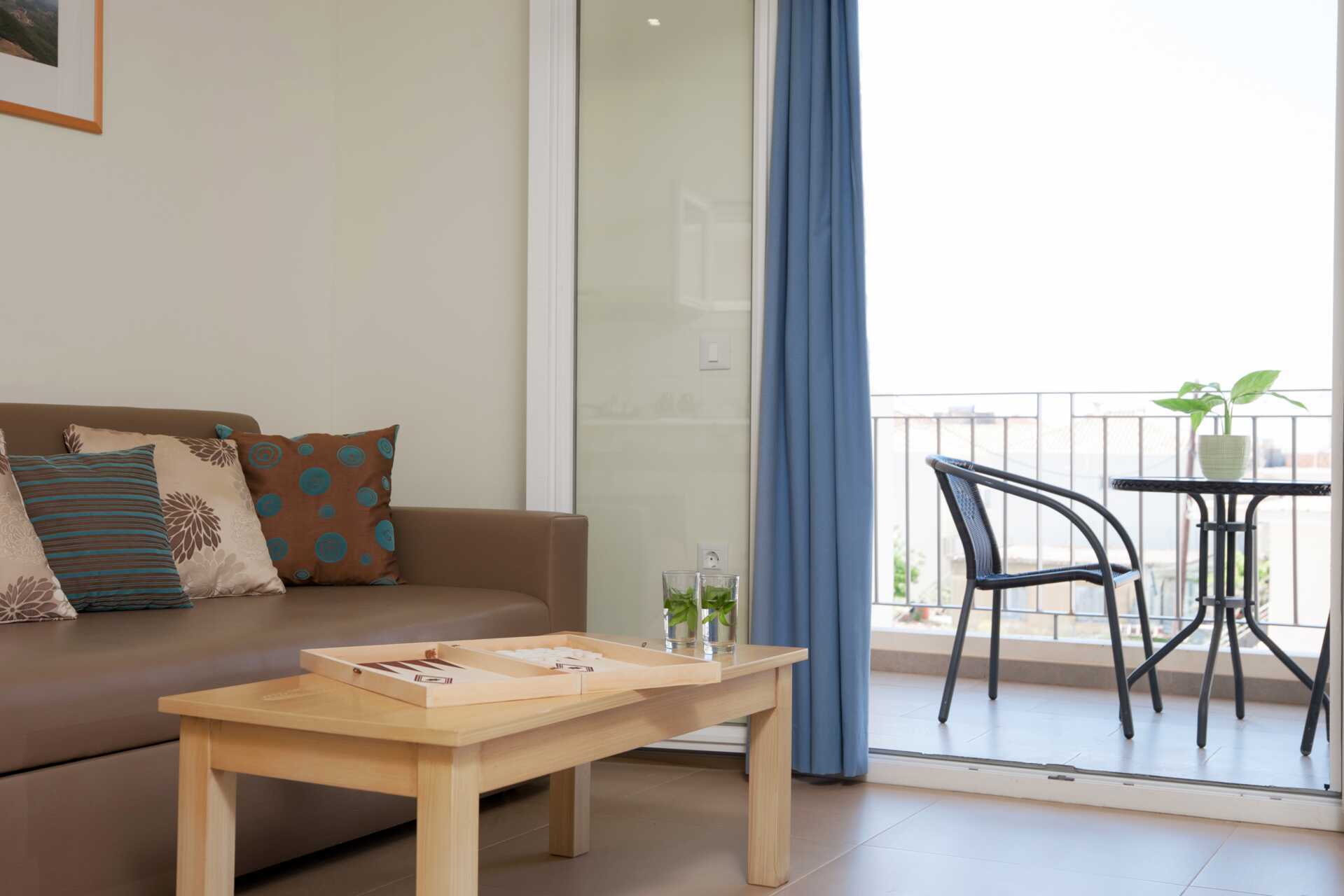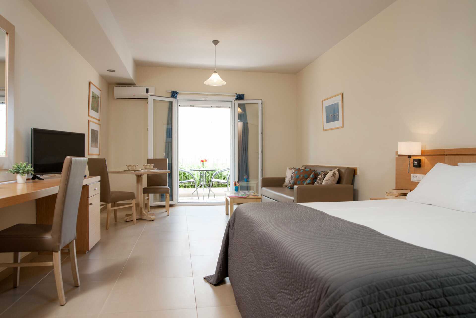 Enrumslägenhet med balkong eller terrass. En dubbelsäng. Möjlighet till extrabäddar i bäddsoffa. Minikök med kylskåp, kokplattor, vattenkokare samt enkel köksutrustning. Wifi och luftkonditionering ingår. Deponering mot deposition. Tv med lokala kanaler. Hårtork. Badrum med badkar eller dusch samt wc. Städning 6 ggr/vecka.