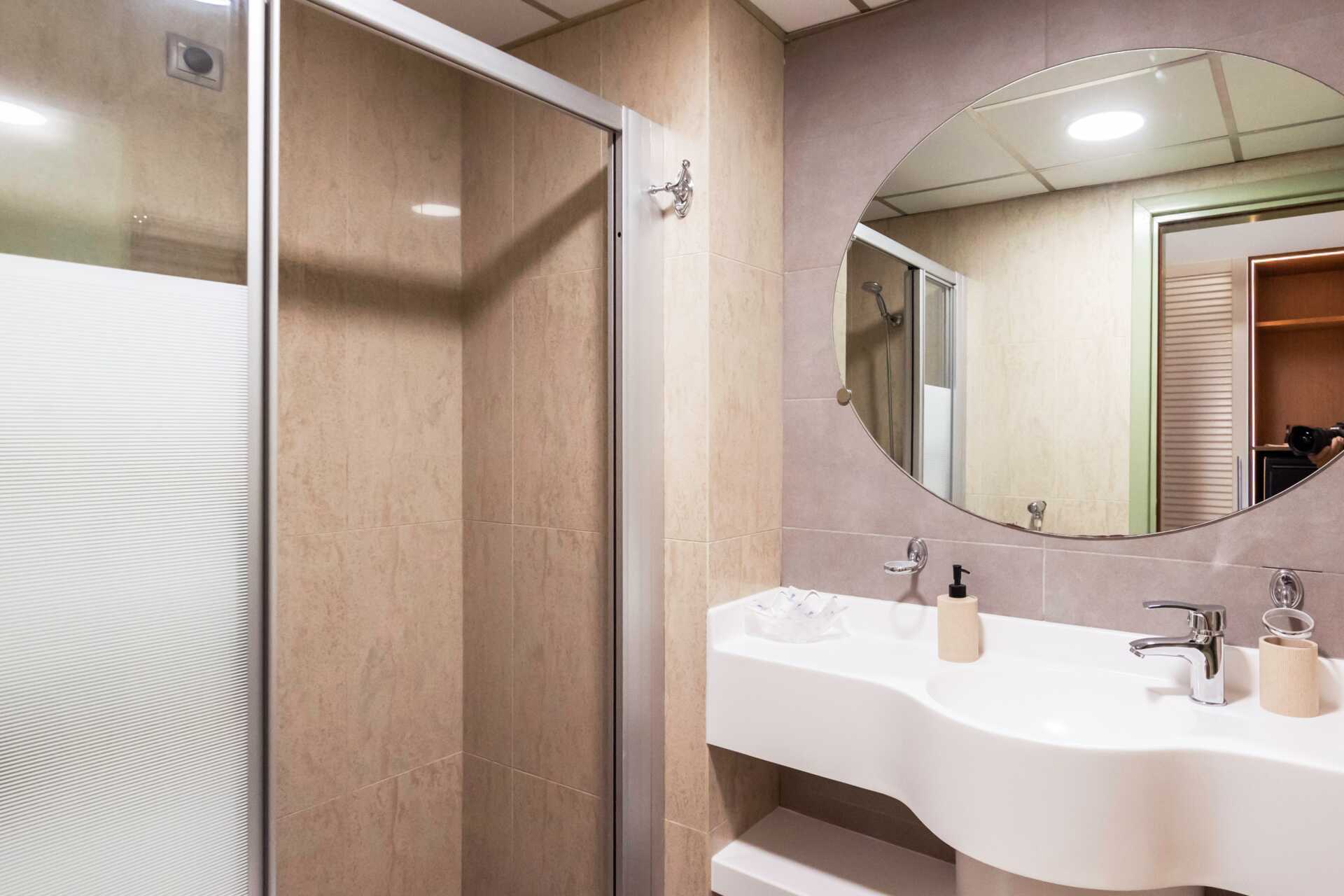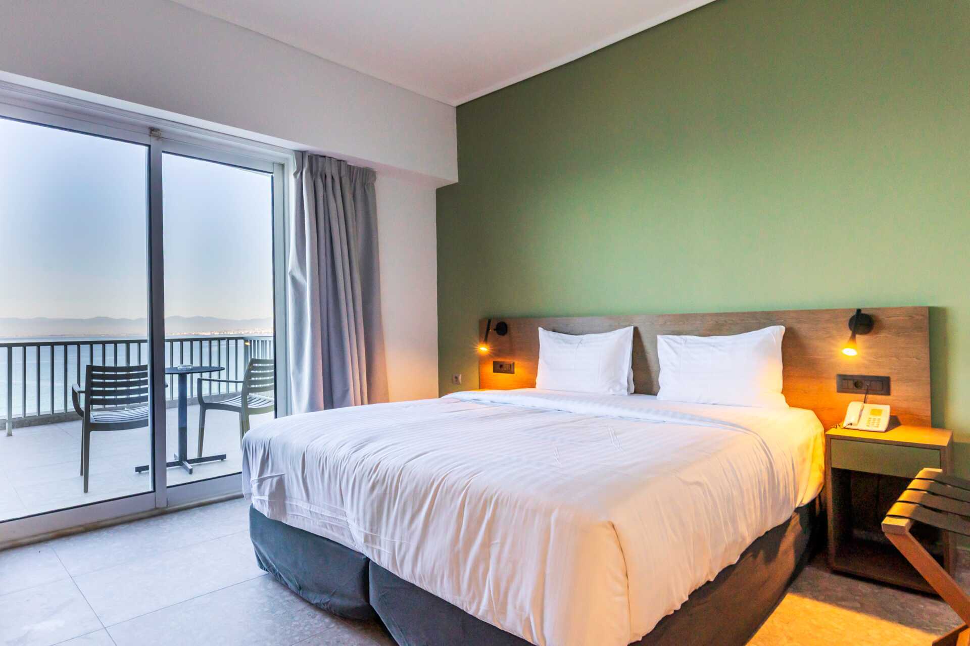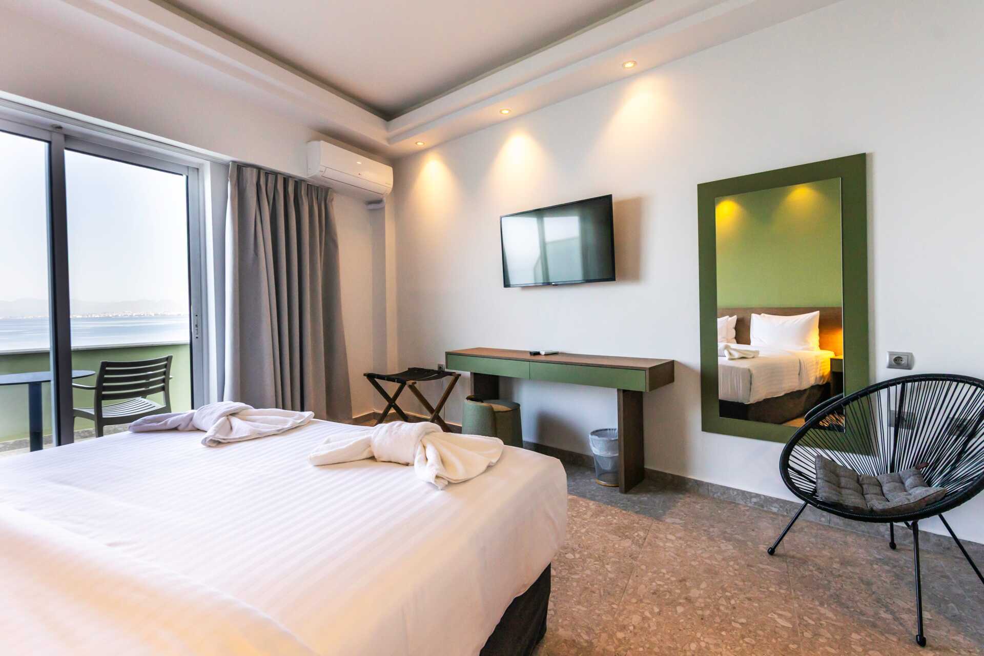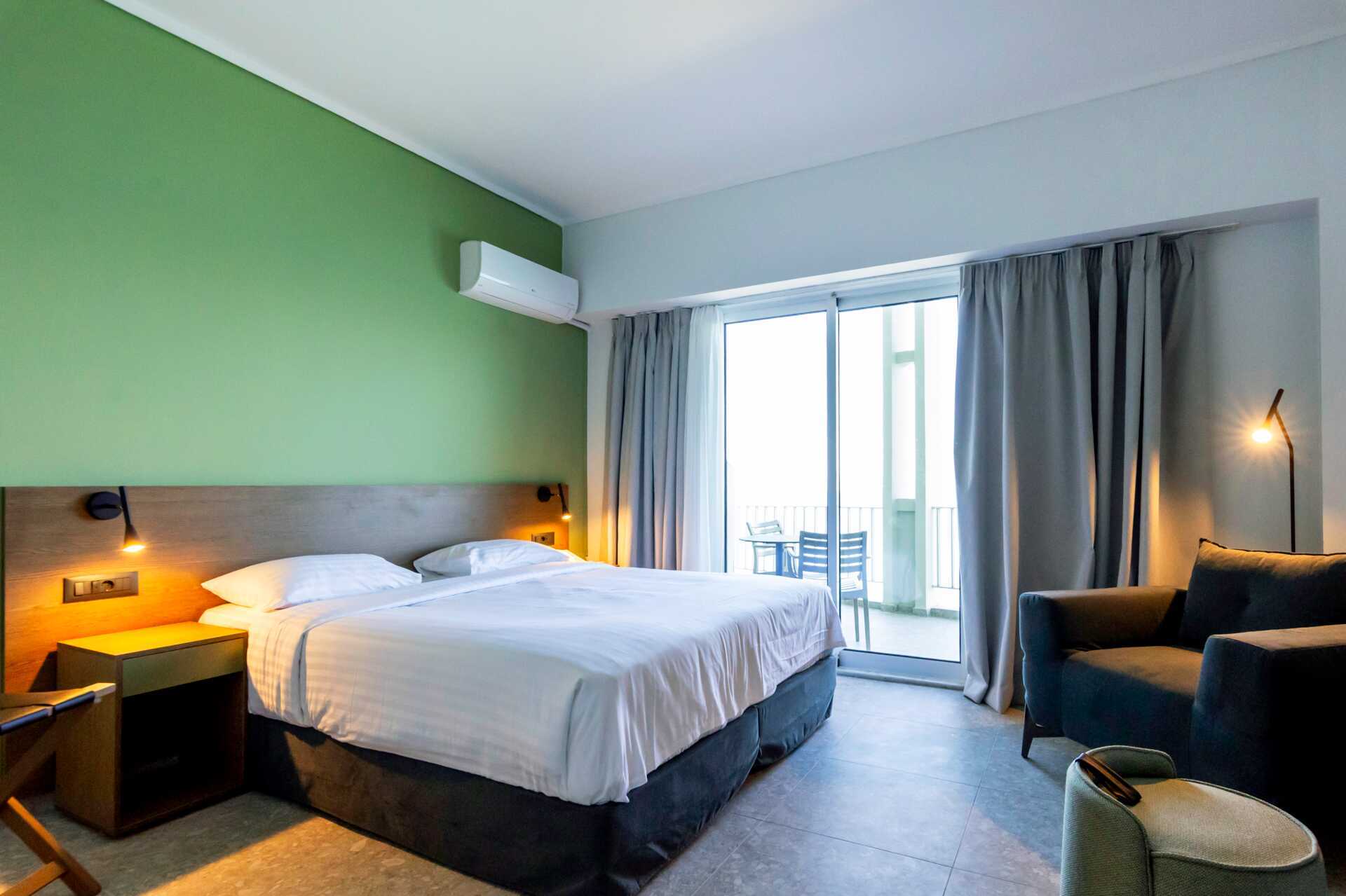 Dubbelrum med balkong och havsutsikt. En dubbelsäng eller två enkelsängar. Möjlighet till extrabädd i hopfällbar säng. Wifi, luftkonditionering och deponering ingår. Kylskåp. Tv med internationalla kanaler. Hårtork. Badrum med badkar eller dusch samt wc. Städning 7 ggr/vecka.