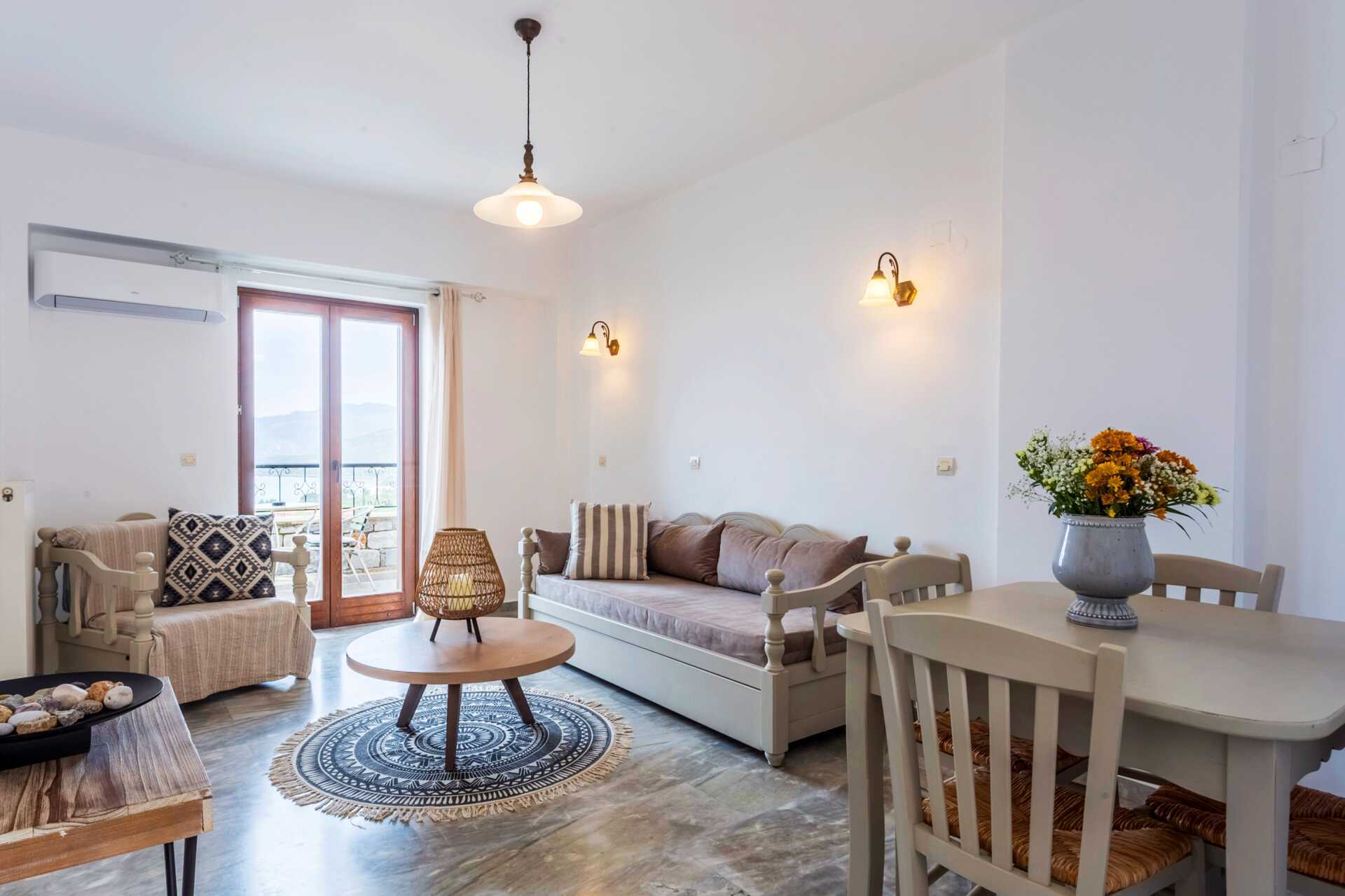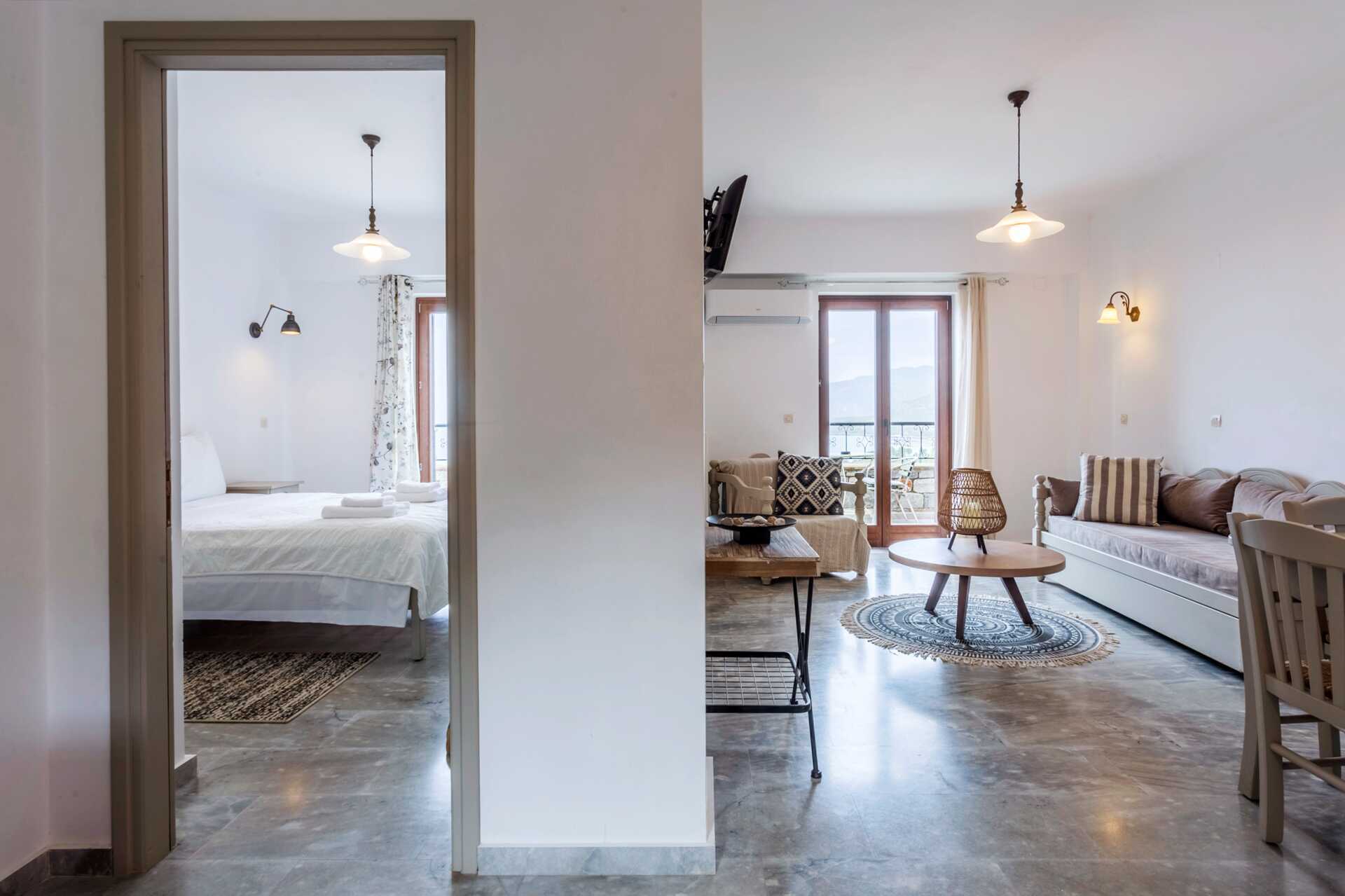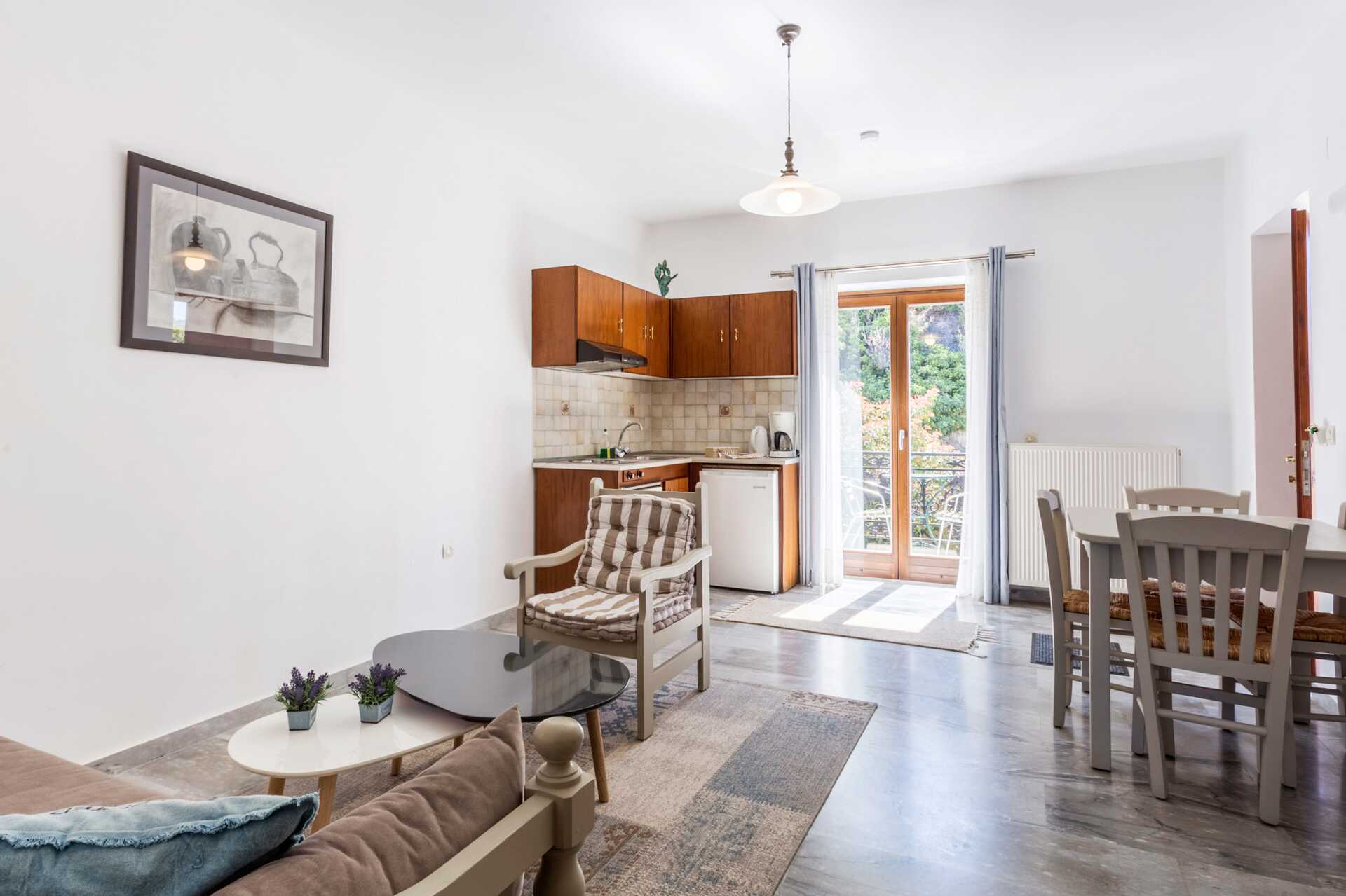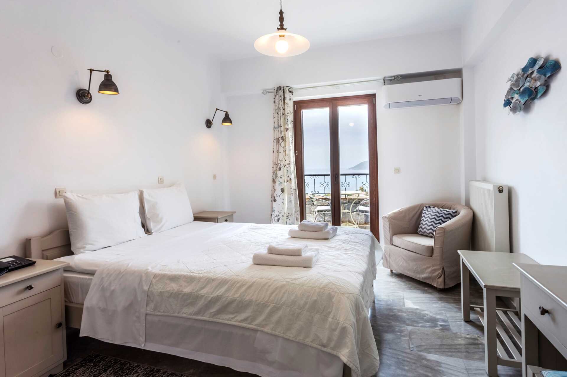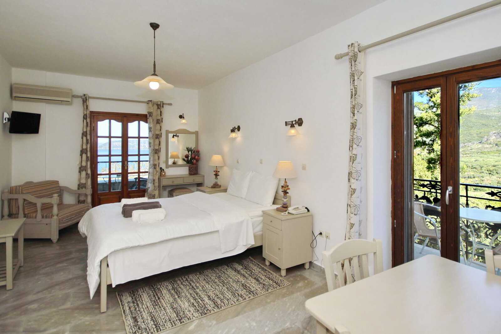 Enrumslägenhet med balkong eller terrass och havsutsikt. Kombinerat sovrum med minikök. En dubbelsäng eller två enkelsängar. Minikök med kokplattor, kylskåp, vattenkokare, kaffebryggare och enkel köksutrustning. Wifi, luftkonditionering och deponering ingår. Tv med lokala kanaler. Hårtork. Badrum med badkar eller dusch samt wc. Städning 3 ggr/vecka.