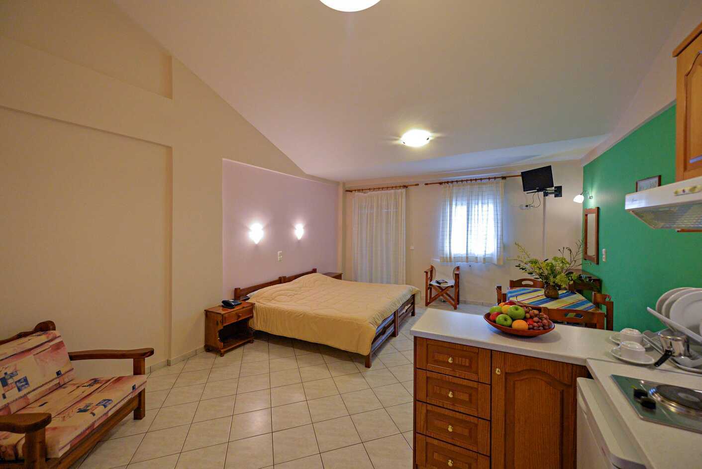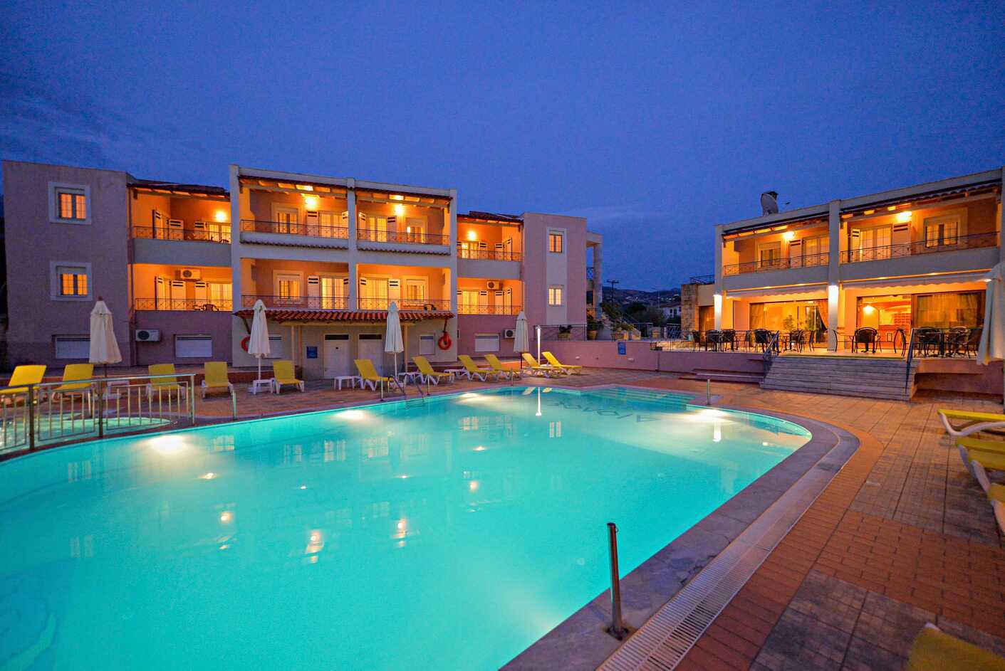 Mitt bland de rofyllda olivträden hittar du det hemtrevliga lägenhetshotellet Aiolos. Här finns en härlig pool men föredrar du havet så ligger den härliga sandstranden bara 100 meter bort.