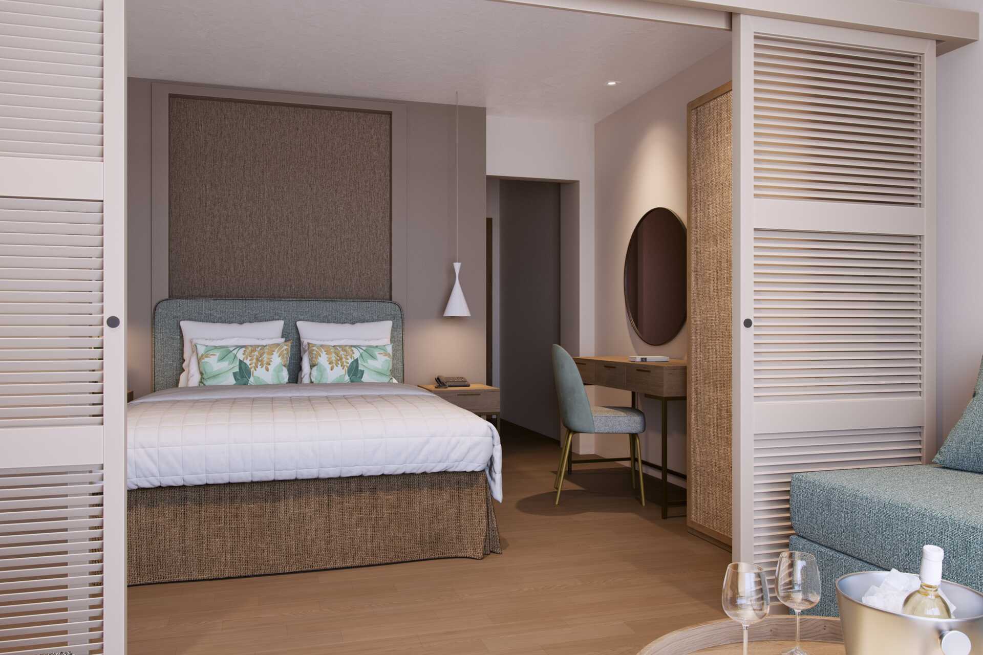 Juniorsvit med stor balkong eller terrass och havsutsikt. En dubbelsäng. Möjlighet till extrabädd i bäddsoffa. Kuddmeny. Wifi, luftkonditionering och deponering ingår. Minibar mot avgift. Vattenkokare samt kaffe och te. Espressomaskin. Tv med internationella kanaler. Badrockar och tofflor. Hårtork. Badrum med dusch och wc. Städning 7 ggr/vecka. Barn under två räknas in i max antal personer i rummet.