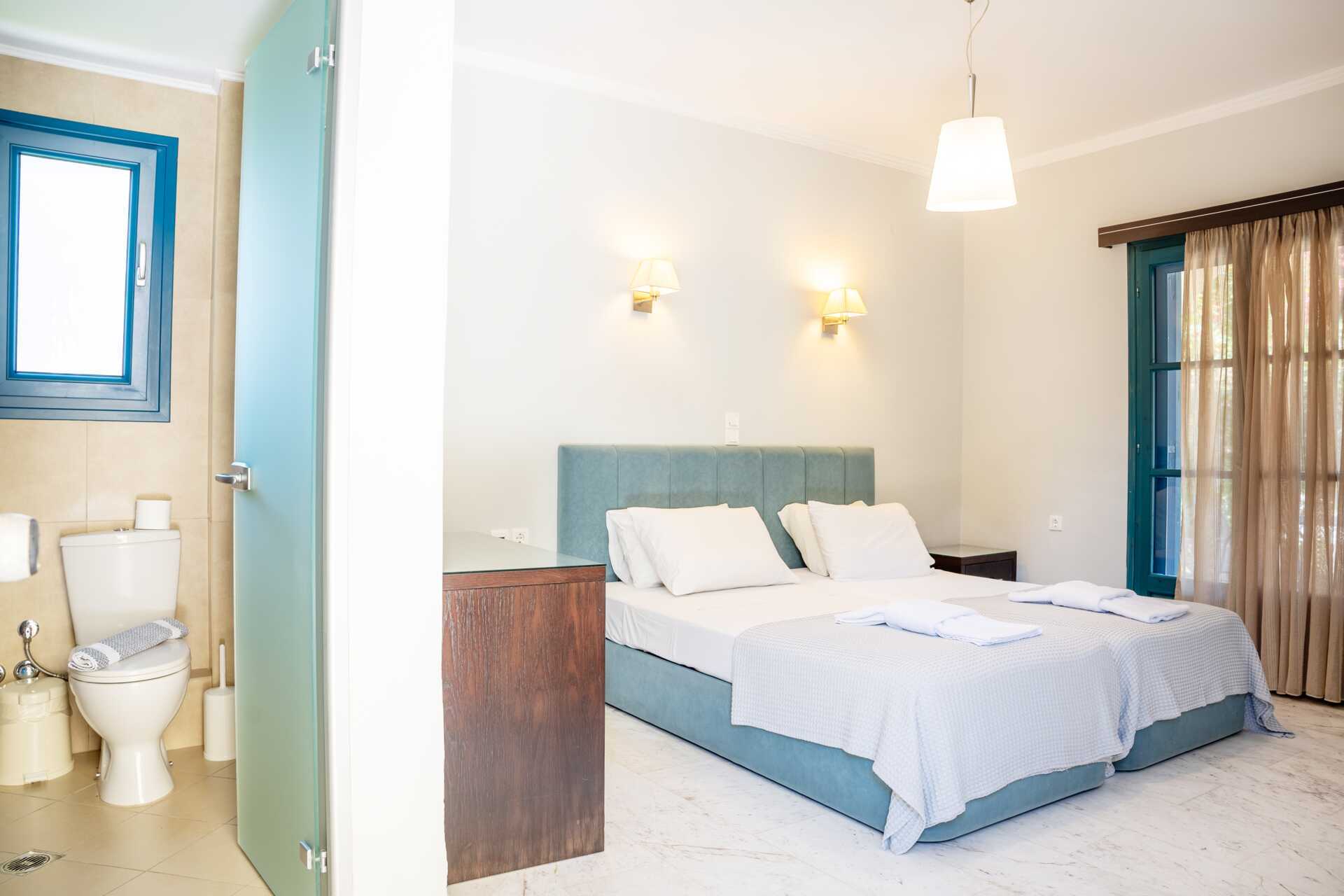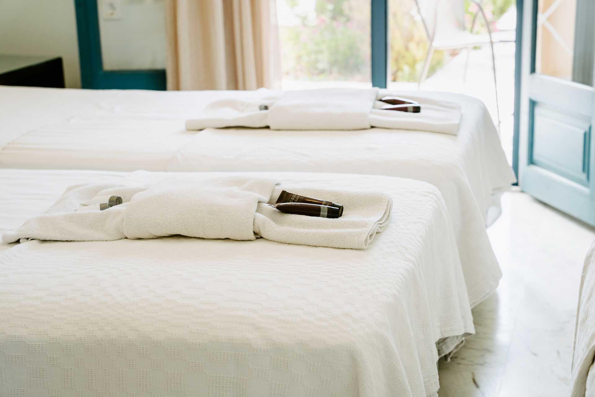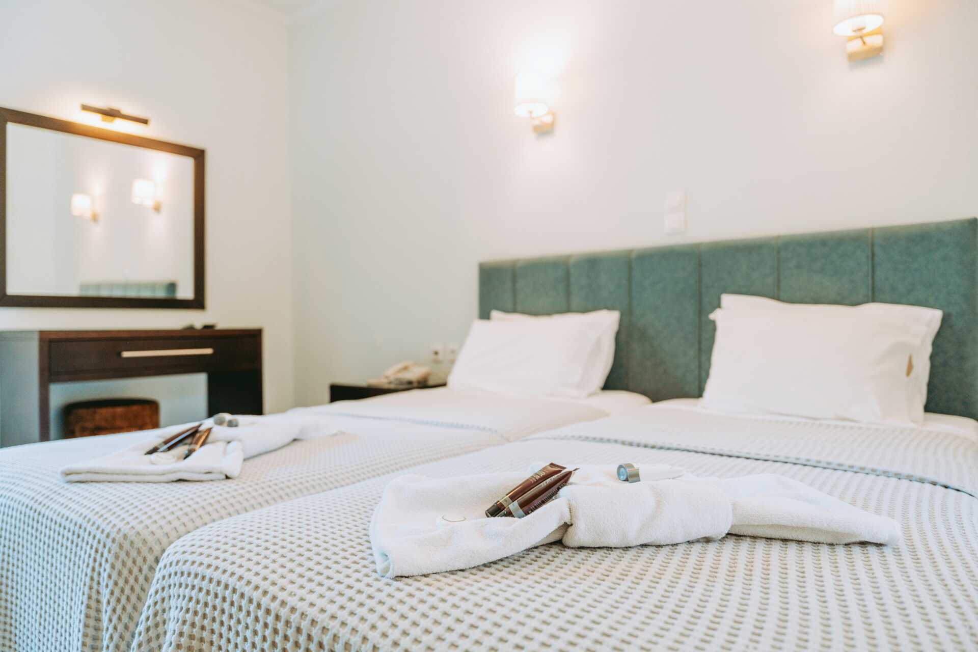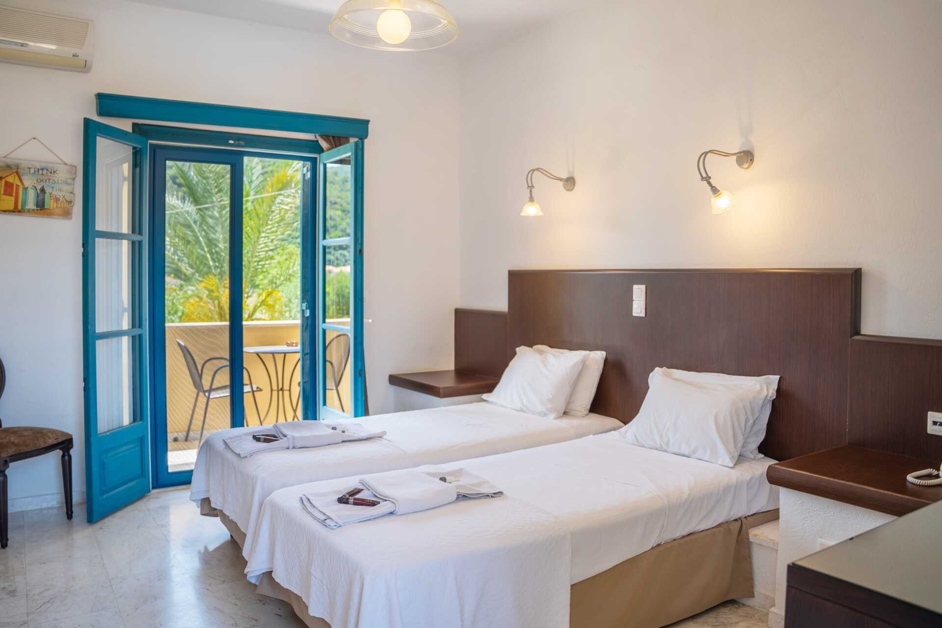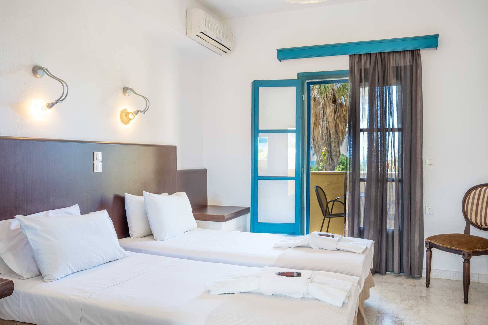Dubbelrum med balkong eller terrass. Vissa balkonger har havsutsikt eller begränsad havsutsikt. Två enkelsängar. Möjlighet till extrabädd i bäddsoffa. Wifi, luftkonditionering och deponering ingår. Kylskåp. Tv med internationella kanaler. Hårtork. Badrum med dusch och wc. Städning 6 ggr/vecka.