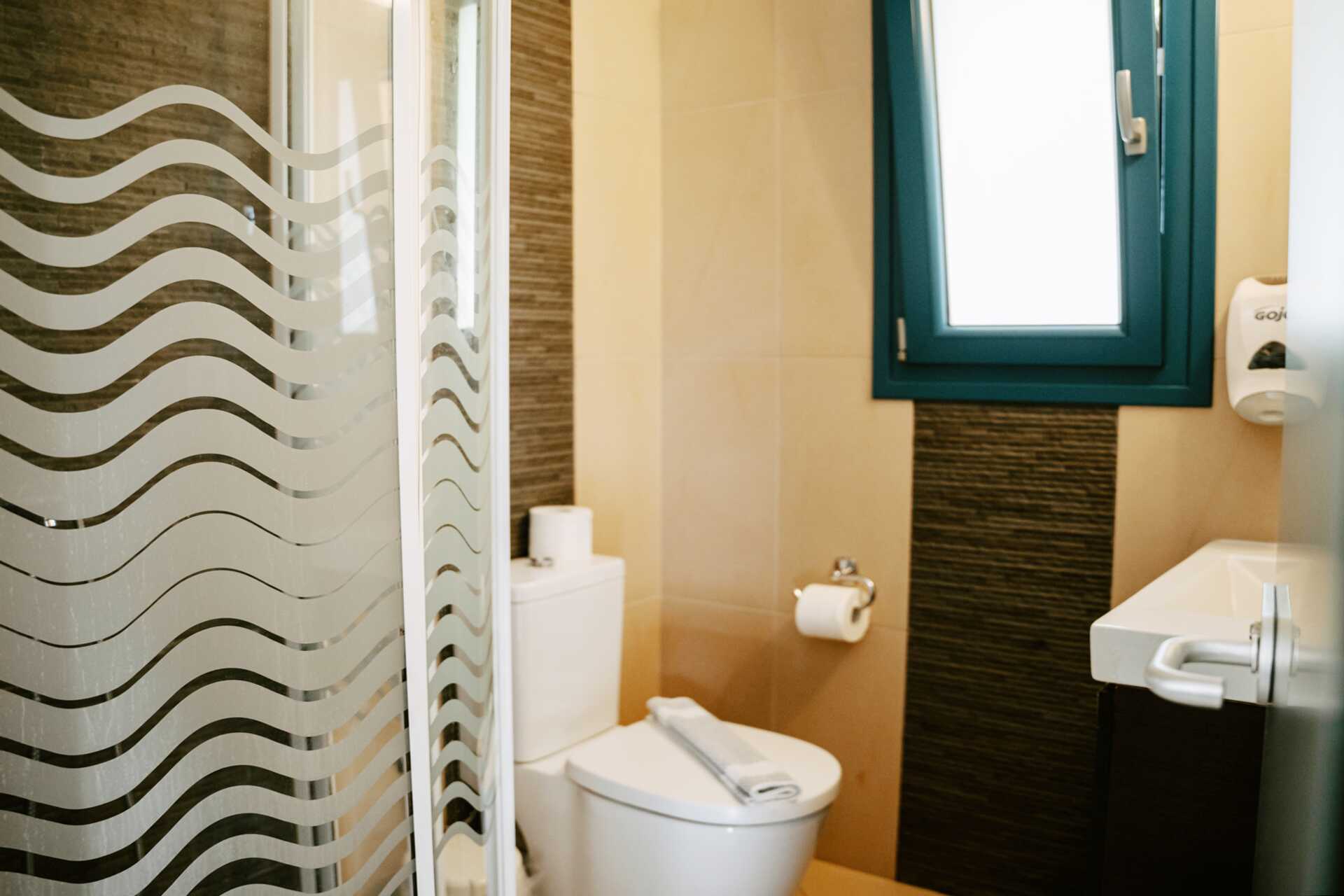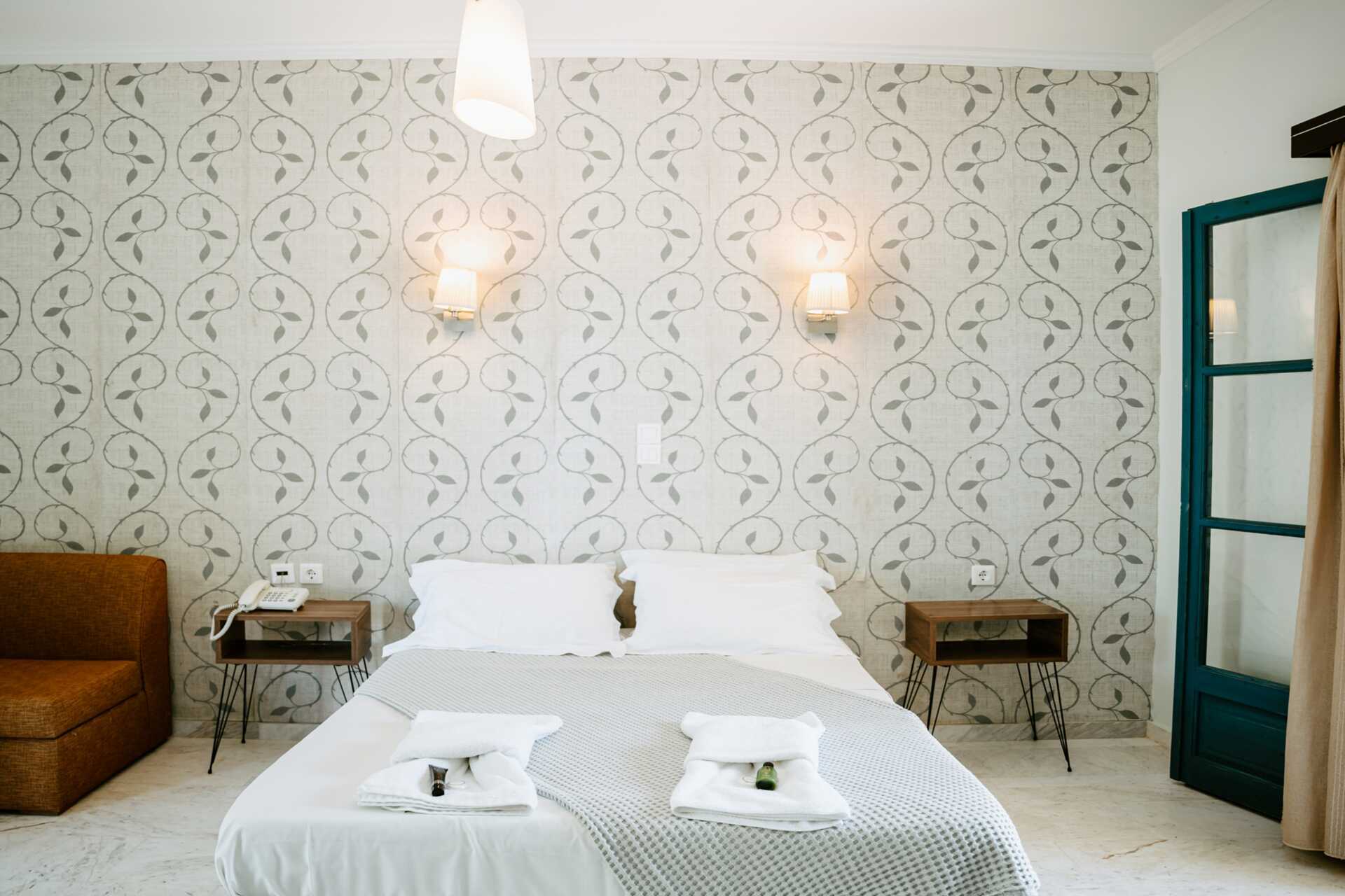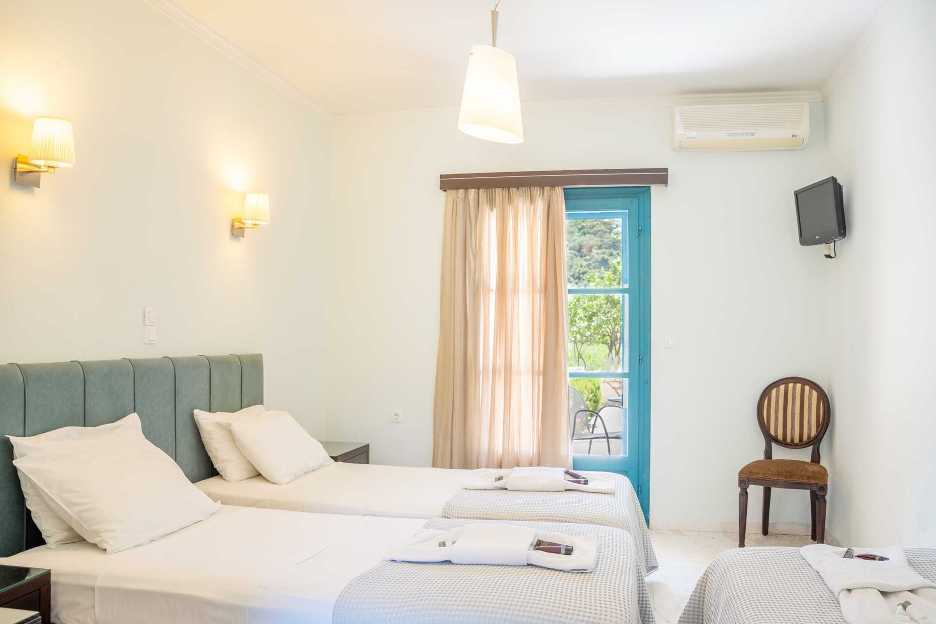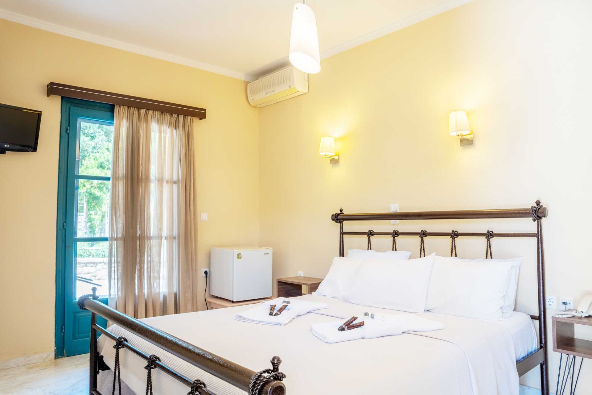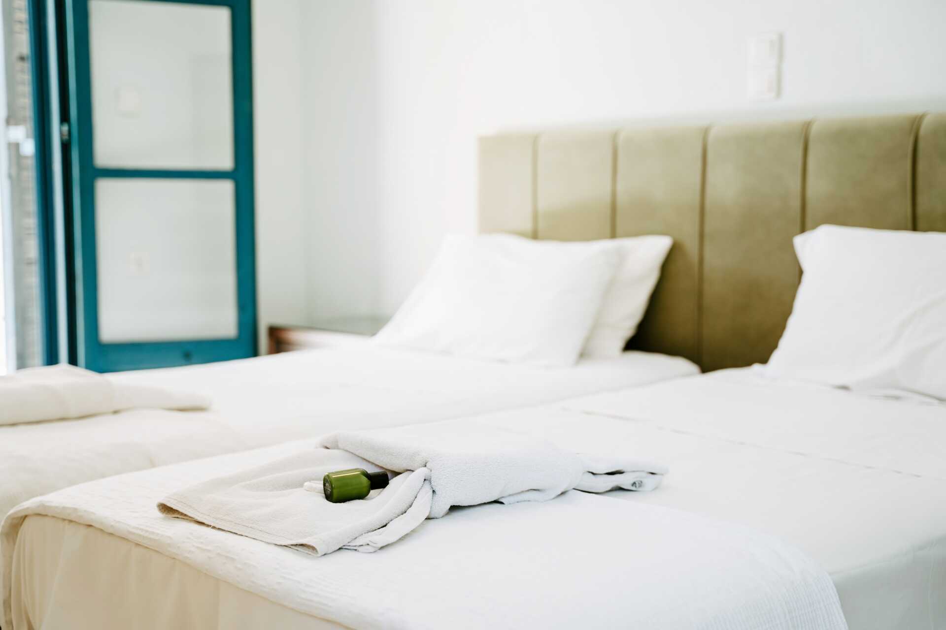 Dubbelrum med balkong eller terrass. Vissa balkonger har havsutsikt eller begränsad havsutsikt. Två enkelsängar. Möjlighet till extrabädd i bäddsoffa. Wifi, luftkonditionering och deponering ingår. Kylskåp. Tv med internationella kanaler. Hårtork. Badrum med dusch och wc. Städning 6 ggr/vecka.